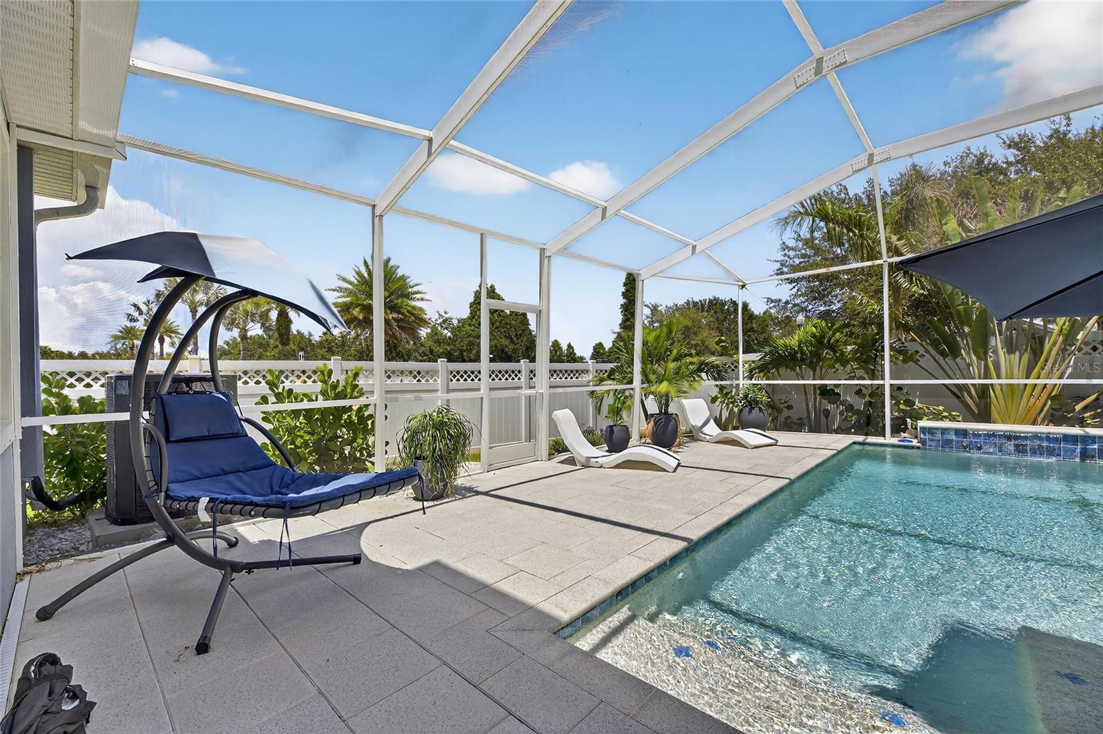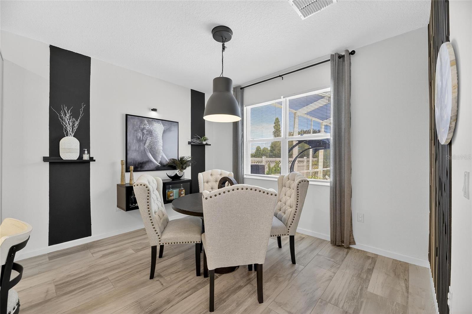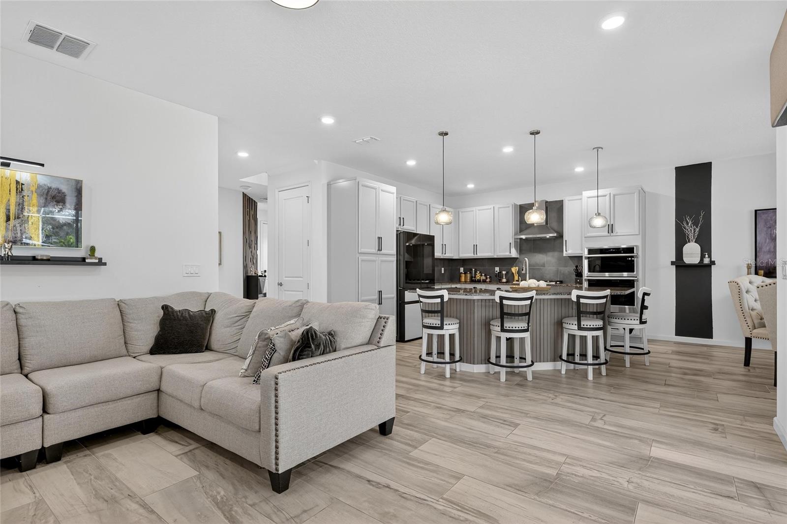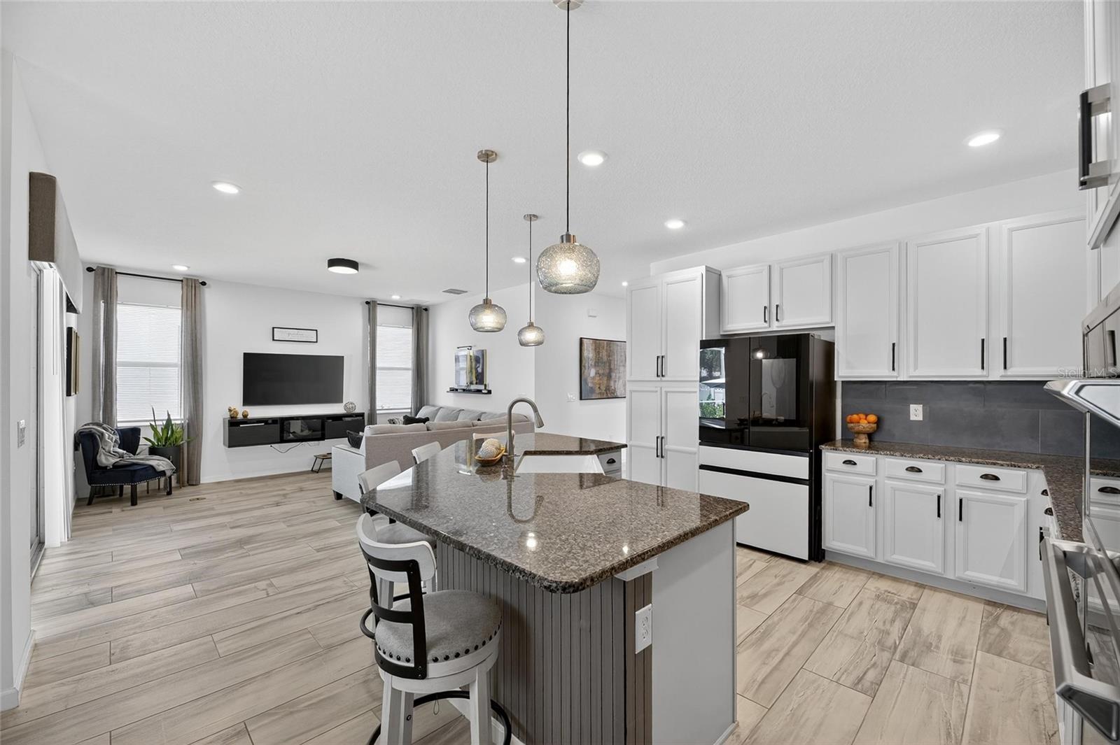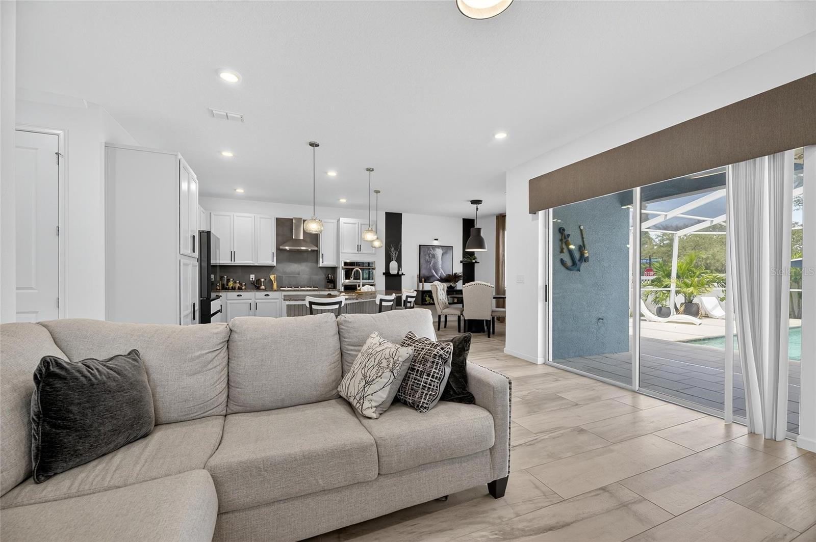 The backyard retreat features a sparkling heated saltwater pool with a sun shelf and water feature, creating the perfect setting to cool off, entertain, or simply relax in privacy. Inside, the kitchen showcases quartz countertops, a custom backsplash, 42-inch cabinetry, upgraded lighting, stainless steel appliances including a Samsung refrigerator, and a sleek curved center island with seating for four and custom wall trim. Wood-look tile planks run throughout the main floor, where the kitchen, dining, and living areas connect seamlessly, all with unobstructed views of the new pool. Custom wall features and upgraded fixtures enhance the living and dining spaces. A flexible main-floor room works as an office or 4th bedroom, paired with a full bath.