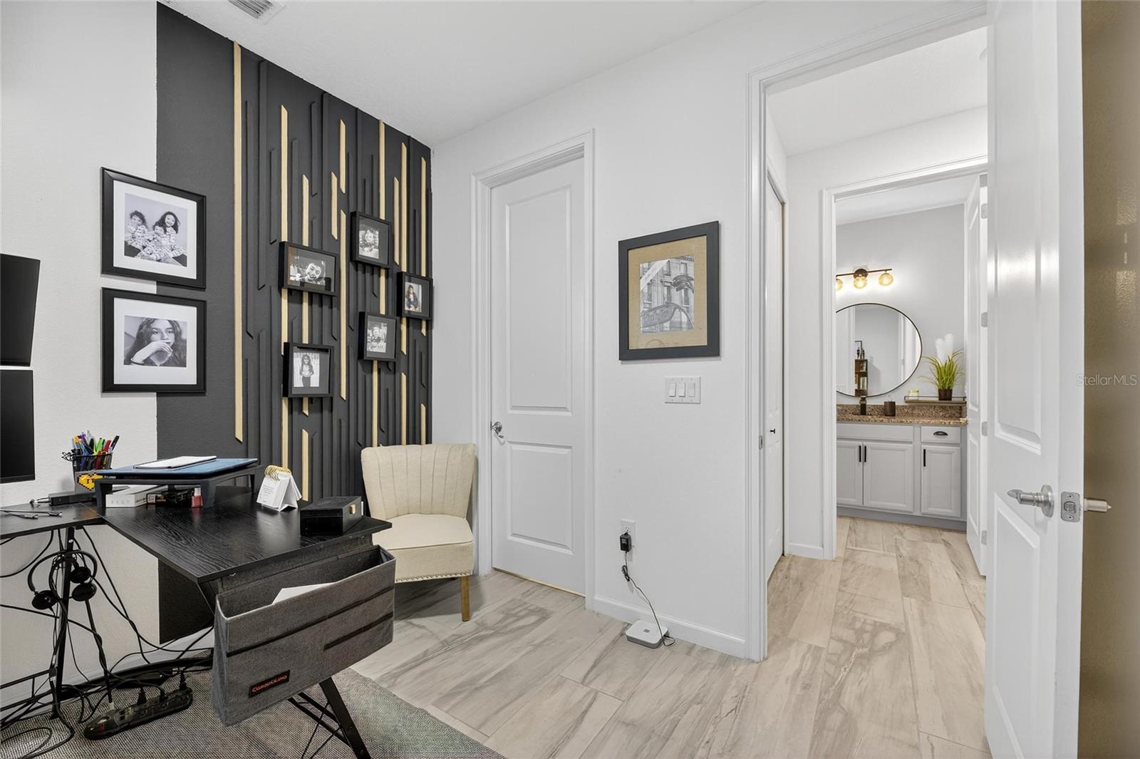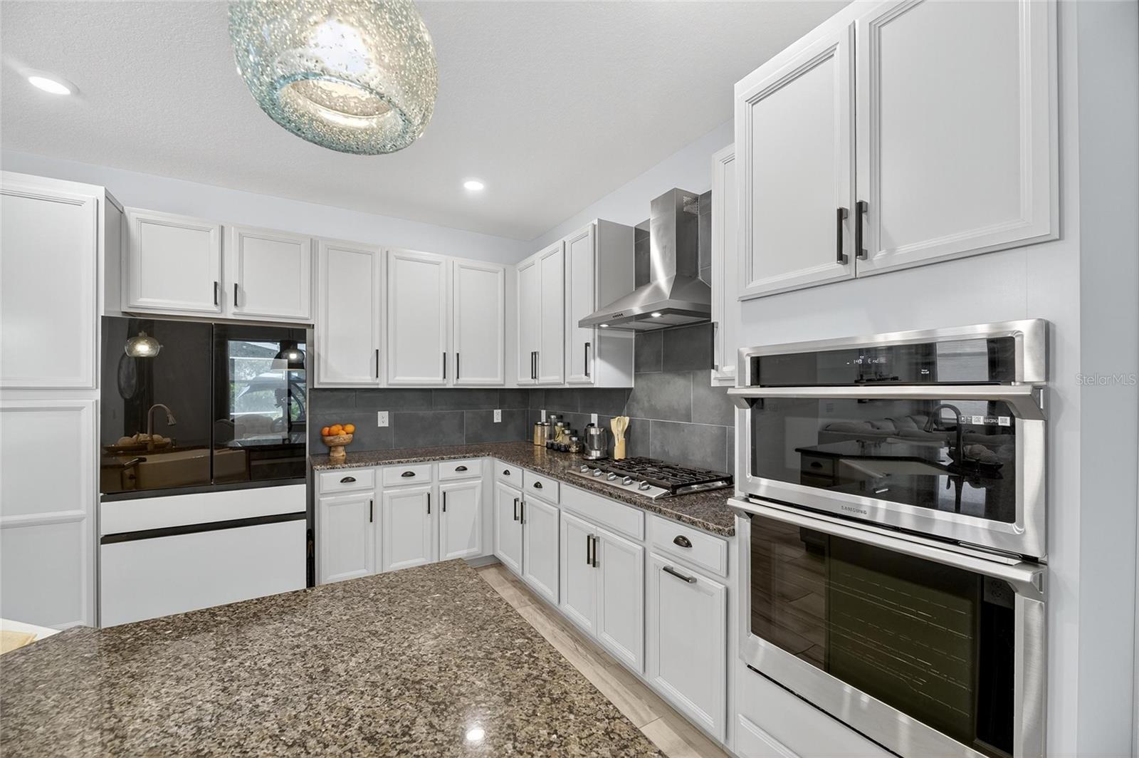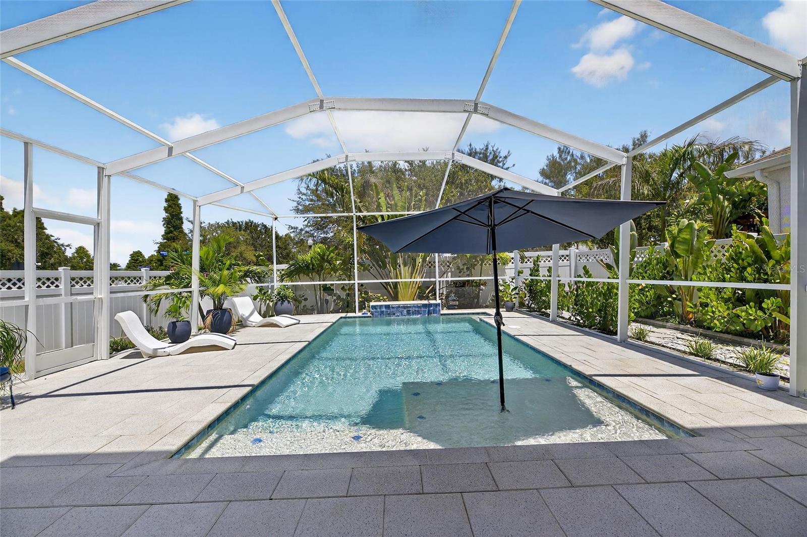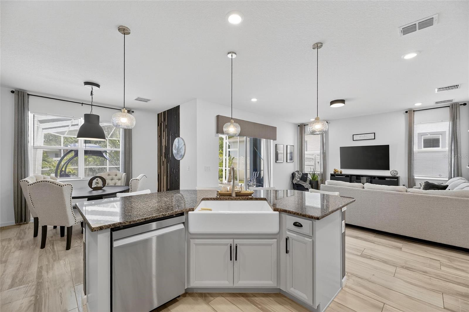 The backyard retreat features a sparkling heated saltwater pool with a sun shelf and water feature, creating the perfect setting to cool off, entertain, or simply relax in privacy. Inside, the kitchen showcases quartz countertops, a custom backsplash, 42-inch cabinetry, upgraded lighting, stainless steel appliances including a Samsung refrigerator, and a sleek curved center island with seating for four and custom wall trim. Wood-look tile planks run throughout the main floor, where the kitchen, dining, and living areas connect seamlessly, all with unobstructed views of the new pool. Custom wall features and upgraded fixtures enhance the living and dining spaces. A flexible main-floor room works as an office or 4th bedroom, paired with a full bath.