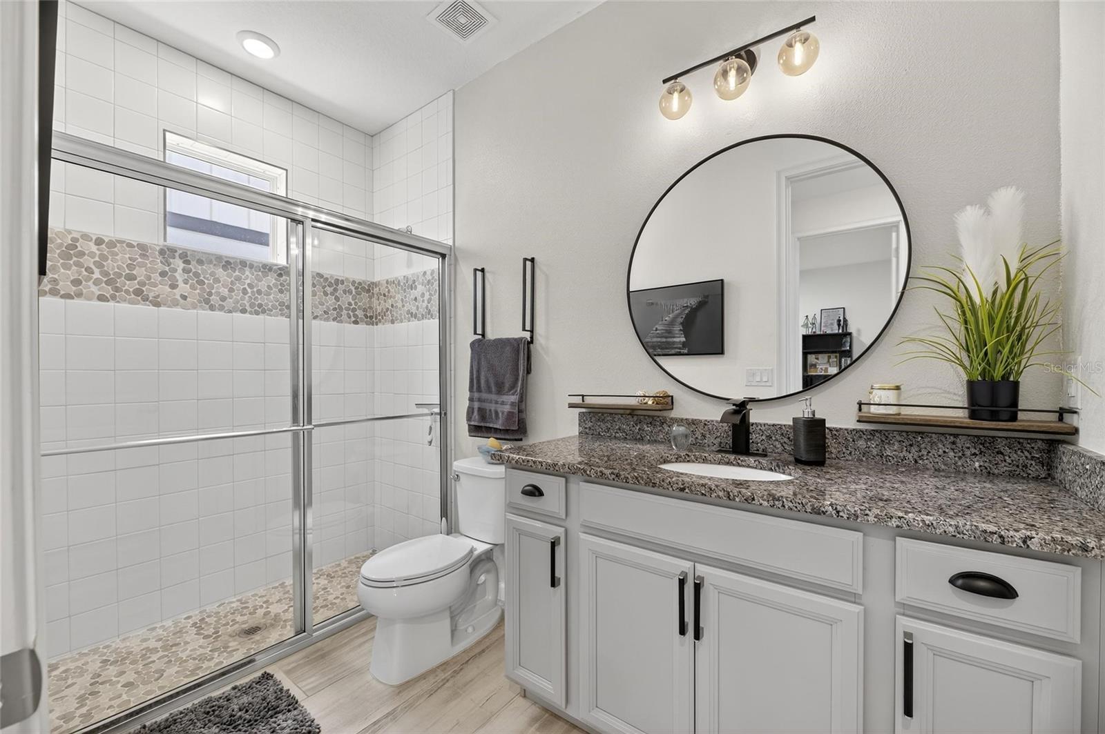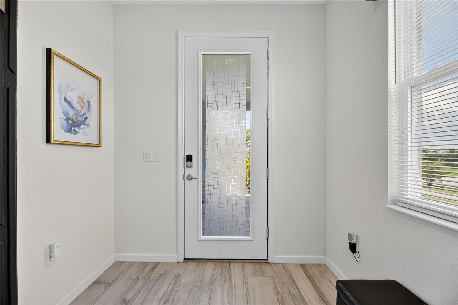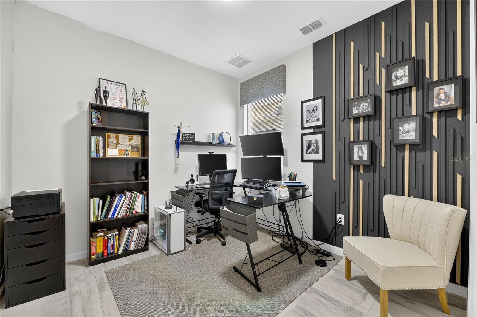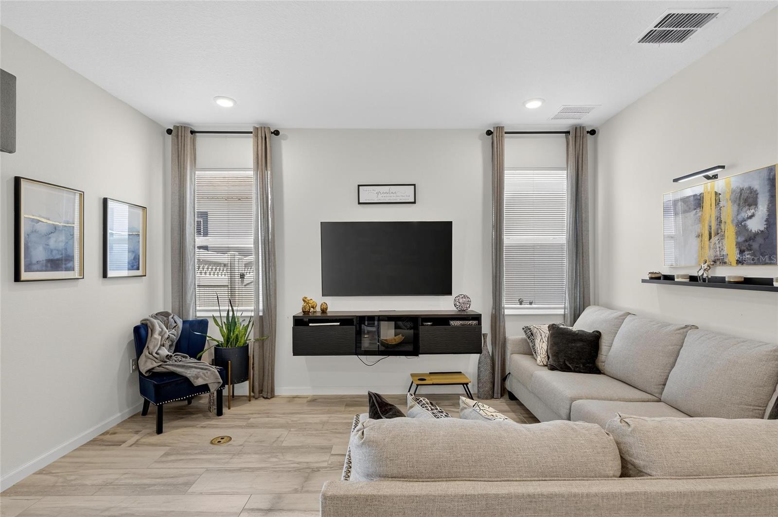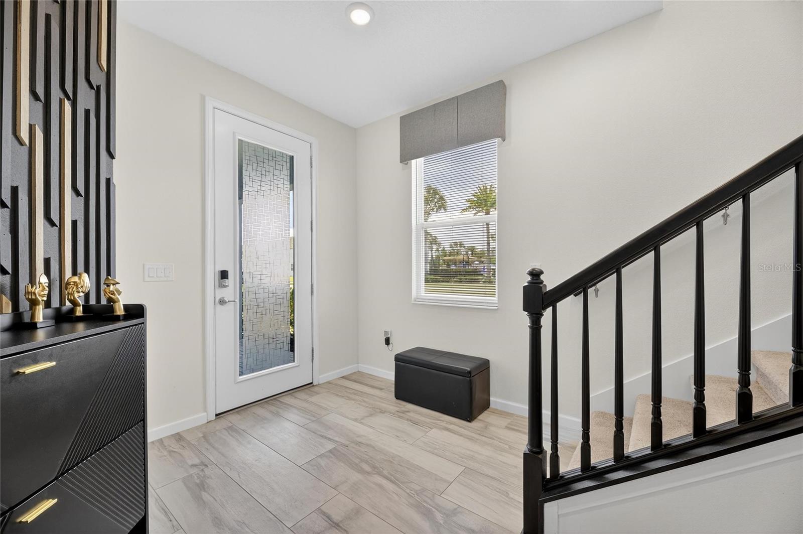 The backyard retreat features a sparkling heated saltwater pool with a sun shelf and water feature, creating the perfect setting to cool off, entertain, or simply relax in privacy. Inside, the kitchen showcases quartz countertops, a custom backsplash, 42-inch cabinetry, upgraded lighting, stainless steel appliances including a Samsung refrigerator, and a sleek curved center island with seating for four and custom wall trim. Wood-look tile planks run throughout the main floor, where the kitchen, dining, and living areas connect seamlessly, all with unobstructed views of the new pool. Custom wall features and upgraded fixtures enhance the living and dining spaces. A flexible main-floor room works as an office or 4th bedroom, paired with a full bath.