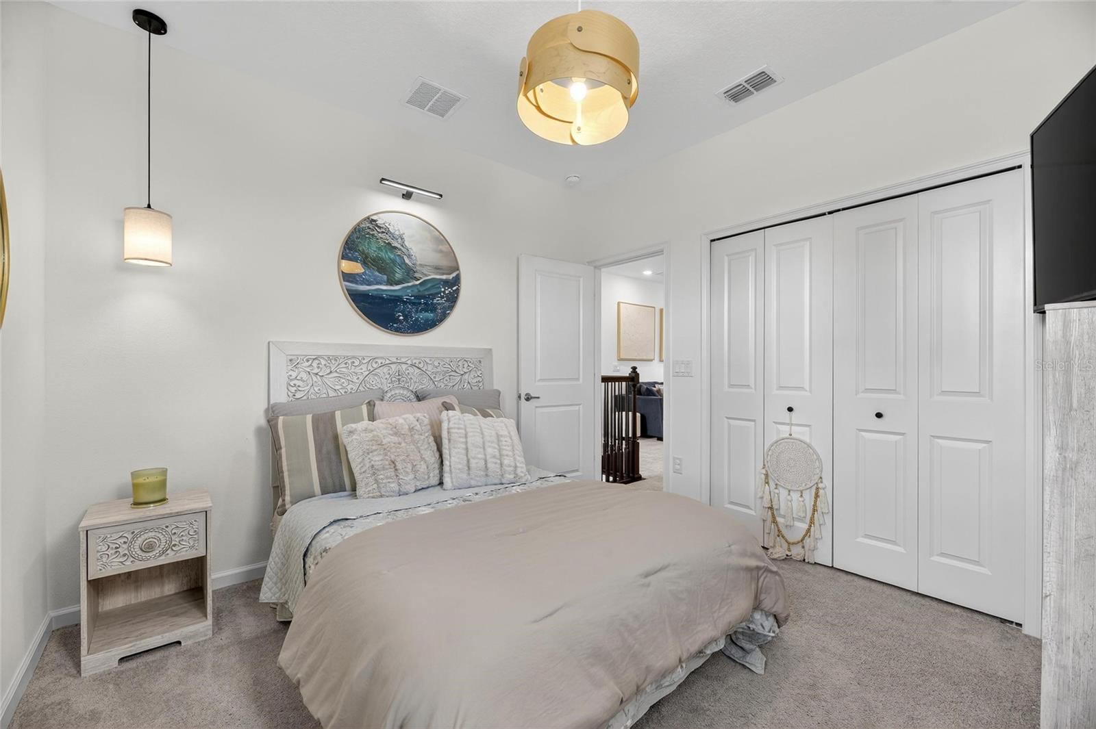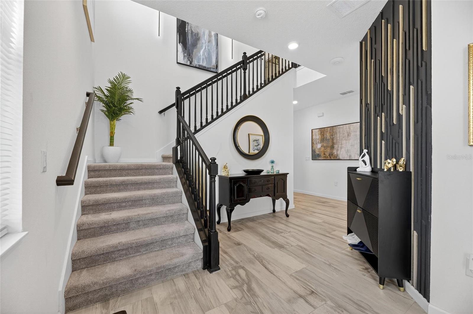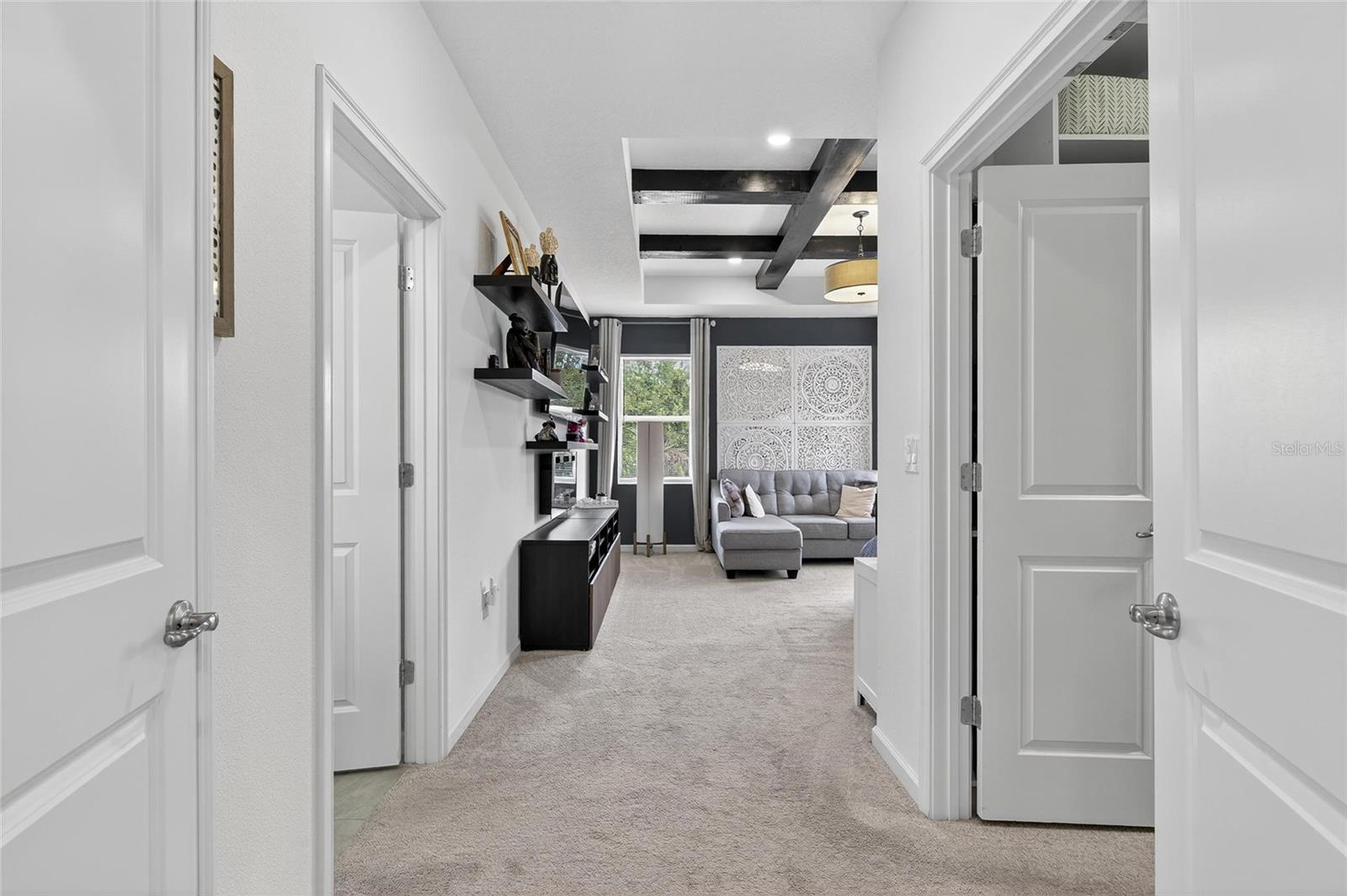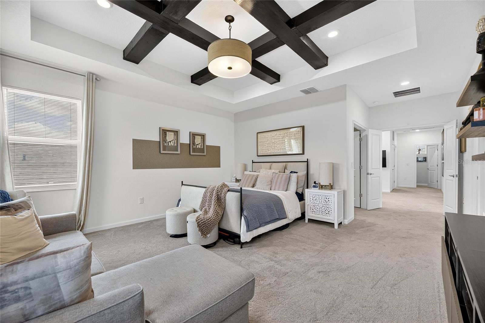 Upstairs, the spacious primary suite includes a coffered ceiling, statement wall, upgraded lighting, a massive walk-in closet, and an en-suite bath with dual vanities and a large walk-in shower with floor-to-ceiling tile. The second floor also includes a versatile loft, laundry room, and two additional bedrooms.