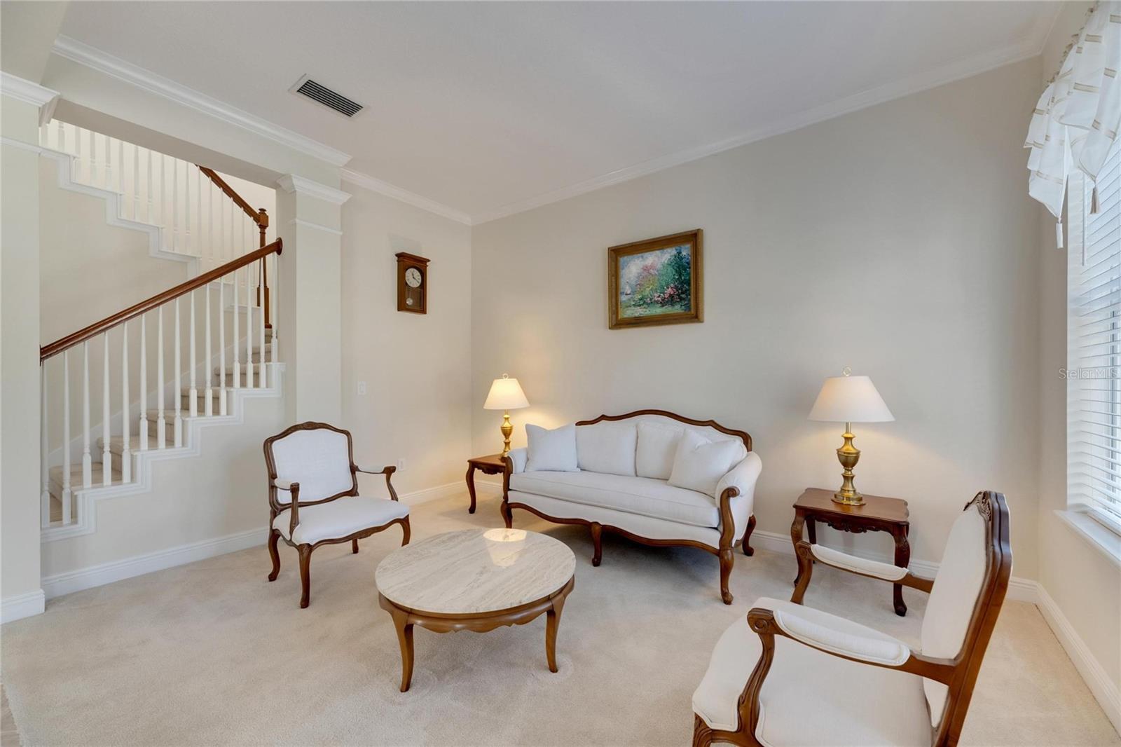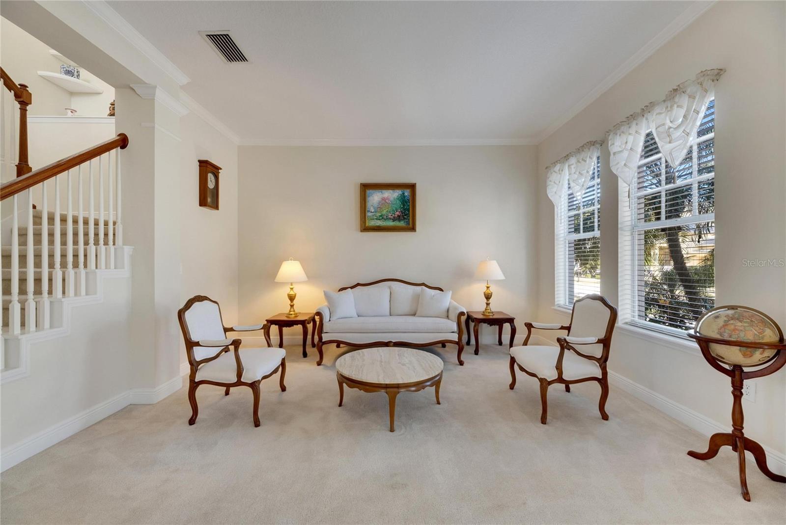 Upstairs, three spacious bedrooms, two full baths, and a versatile loft with built-in workspace provide ample space for family or guests. The grand staircase and crown molding throughout accentuate the home’s upscale character.