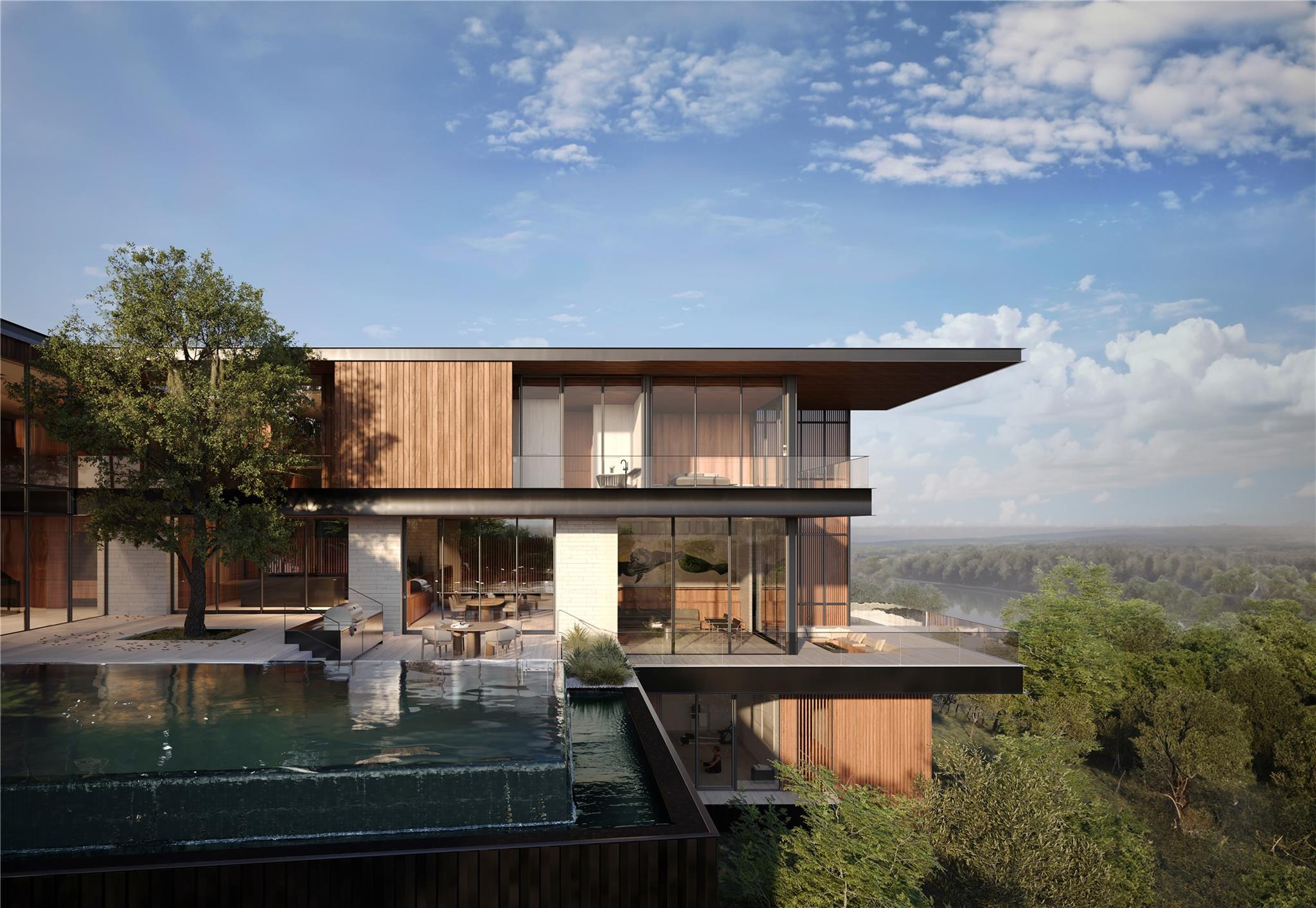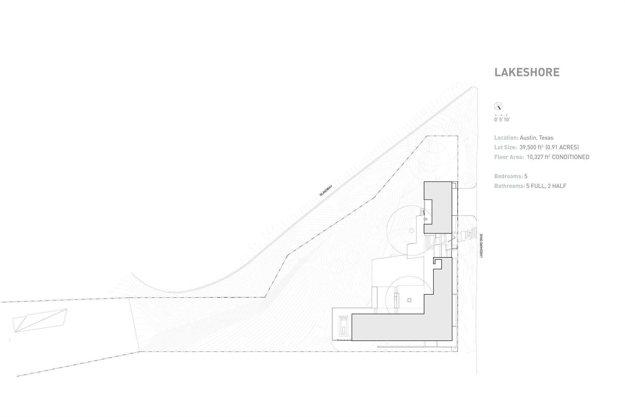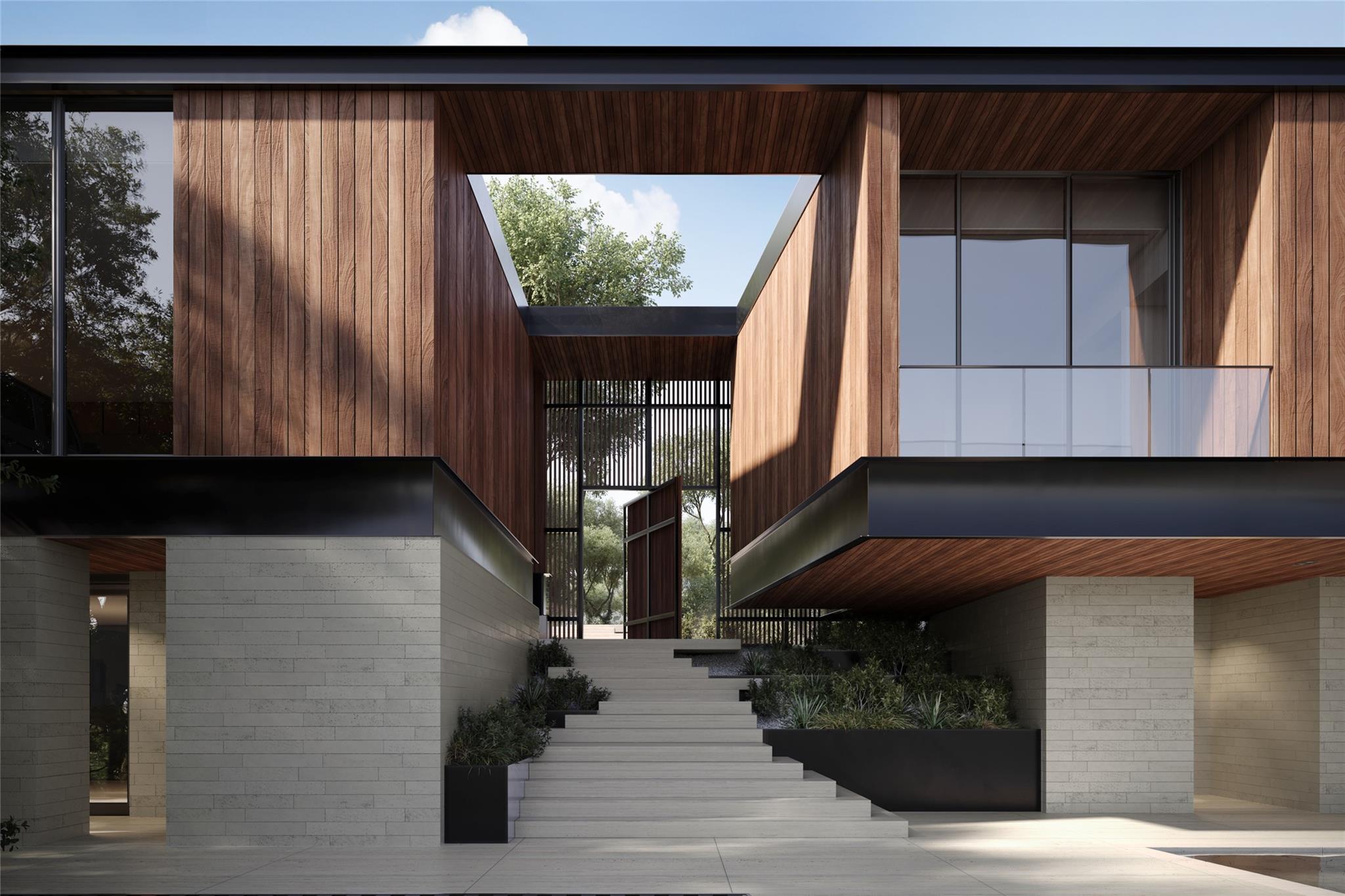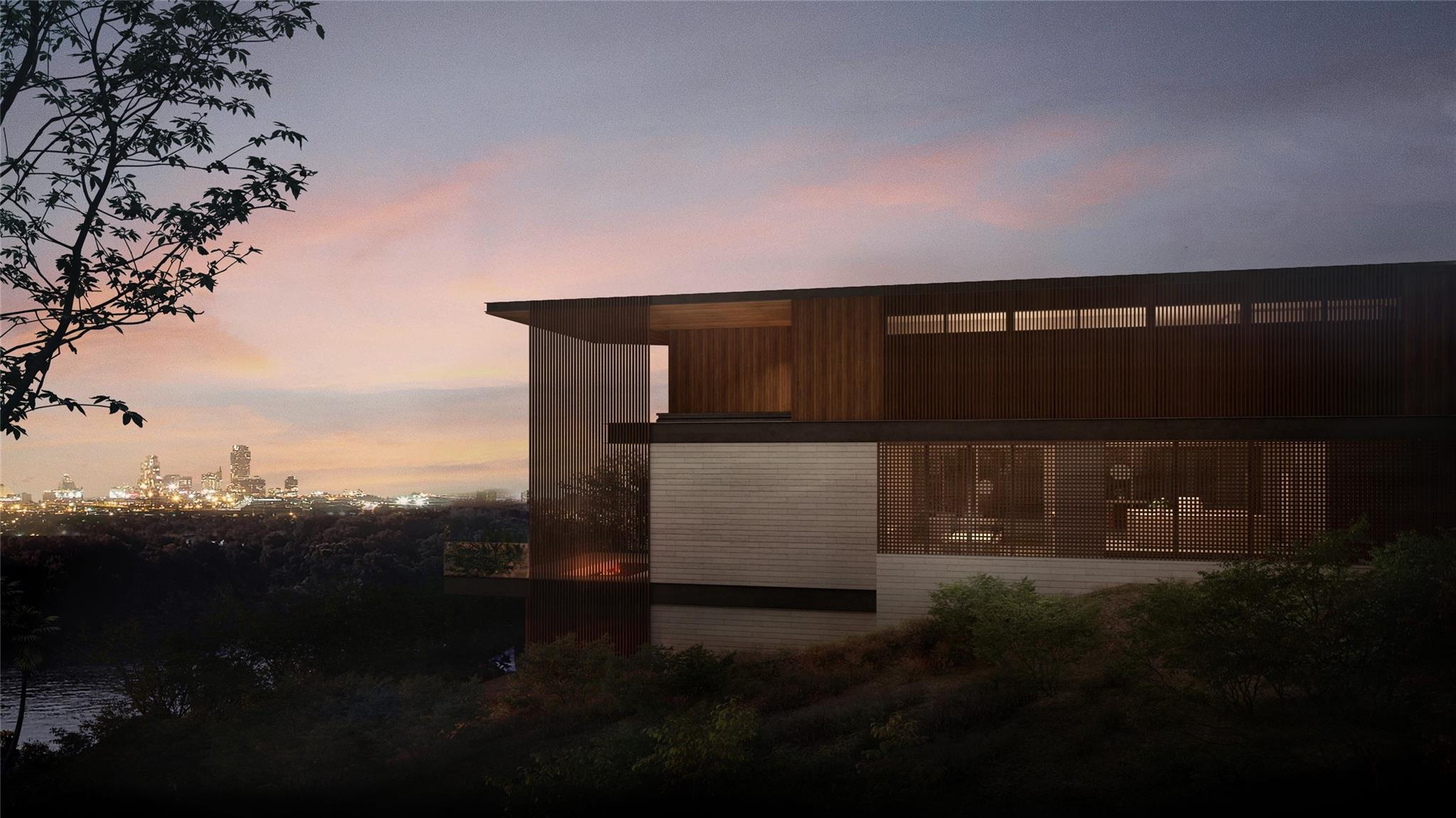 One of the very few true Lake Austin waterfront lots with sweeping, unobstructed views of the downtown Austin skyline, 2007 Lakeshore Drive pairs rare city vistas with a calm no-wake stretch of water—an extremely scarce pairing on the lake. Offered with a fully realized, permitted architectural vision by Matt Fajkus Architecture, the design anticipates an approximately 13,860 sq ft contemporary estate with ~10,327 sq ft of conditioned living space and ~3,533 sq ft of covered outdoor areas and four car garage. Embedded into the hillside, the proposed residence uses intersecting wood and stone volumes and long horizontal roof planes to unify interior and exterior and to choreograph movement down the slope, revealing the lake and skyline in a series of dramatic framed vistas. Conceived as a series of terraced pavilions stepping toward the water, the main residence is oriented to capture panoramic downtown and lake views from almost every principal room. The planned program includes five bedrooms, six full and two half baths, and a detached ~1,200 sq ft guest suite for guests or staff. An owners’ level spans a wrap-around balcony with outdoor shower, private meditation deck, library, and office, while a sculptural staircase connects split-level living, kitchen, and dining areas to expansive entertaining terraces. At the water’s edge, the existing “Filtered Frame Dock” by Matt Fajkus Architecture anchors the property as a completed, award-winning work of architecture. Engineered with a minimal footprint and a sculptural steel canopy, the dock’s upper-deck lounge is designed to frame the lake while modulating sun, shade, and breeze throughout the year. Recognized with multiple national and international design awards and featured in leading design publications, it is one of the most celebrated residential docks on Lake Austin.