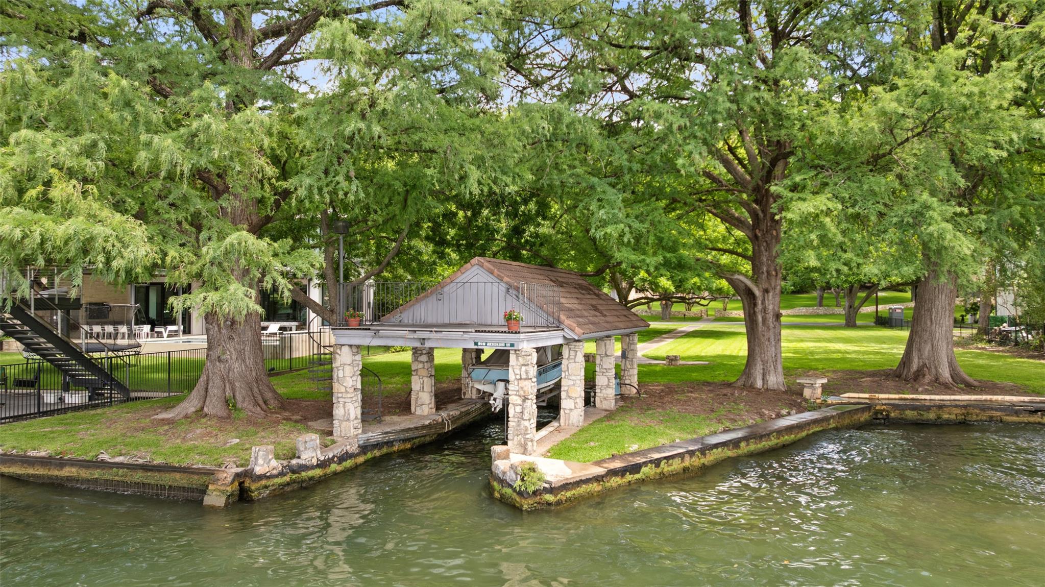 From Highway 360; head west on Westlake Drive; right on Royal Approach; left on Bunny Run; right on Hillbilly Lane. At the bottom of the hill, turn right on Rivercrest Drive. Property is about 1/4 mile heading north, on the lake side.