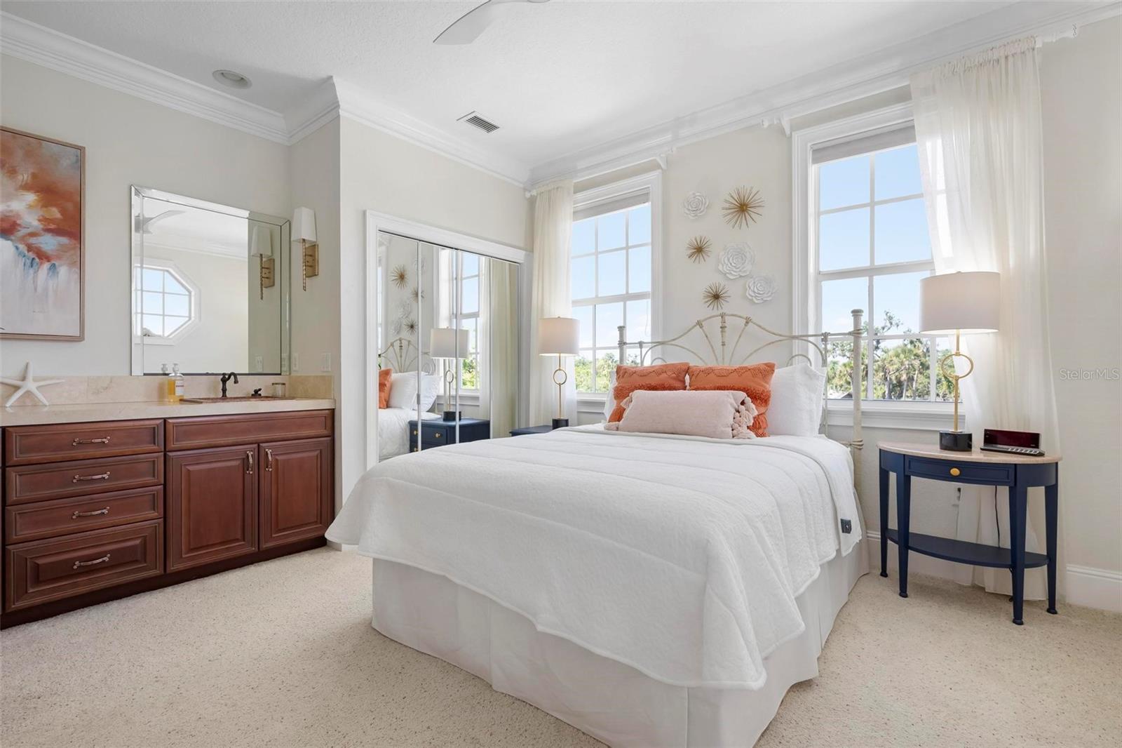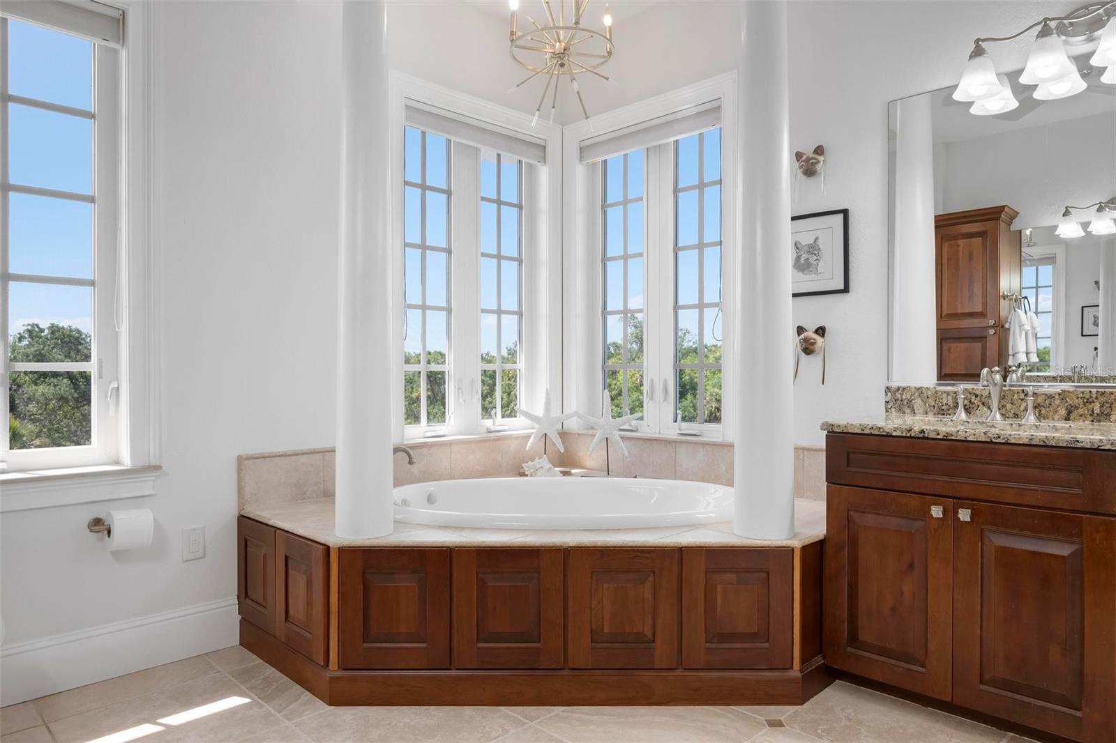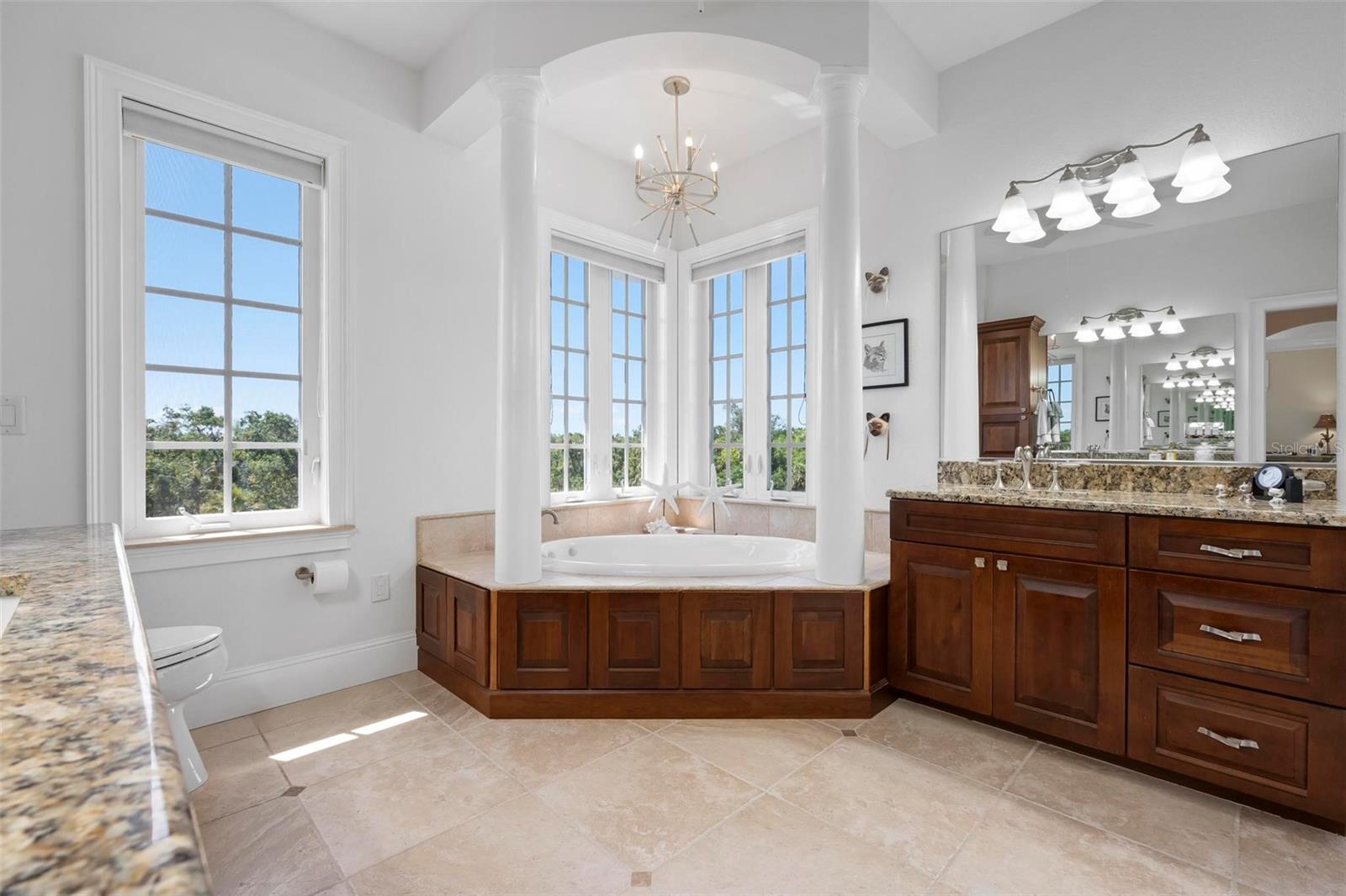 NEW A/C main level 8/2025 (upstairs unit replaced 2/2025 NEW HIGH END WASHER & DRYER 8/2025, double crown molding in every room. The private elevator delivers you to a grand foyer, leading to a stately den with a presidential ambiance. The living room, complete with a spacious walk-in closet, offers the flexibility to be converted into an additional bedroom. The dining room is nothing short of exceptional, seamlessly connected to a butler’s pantry that leads to the heart of the home—a gourmet kitchen. Boasting granite countertops, premium cabinetry, state-of-the-art stainless steel appliances, and a hidden walk-in pantry, the kitchen is a chef's dream. Open to a spacious family room, the area flows effortlessly onto a second-floor covered patio with breathtaking water views stretching from east to west, framed by serene preserve landscapes. This outdoor oasis is a tropical haven, evoking the feeling of a private retreat.