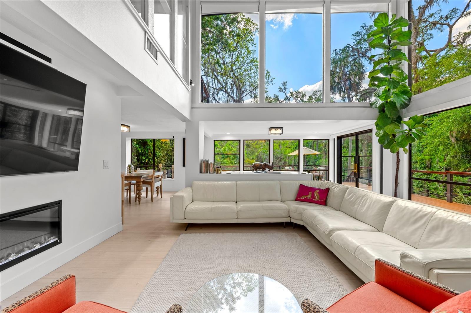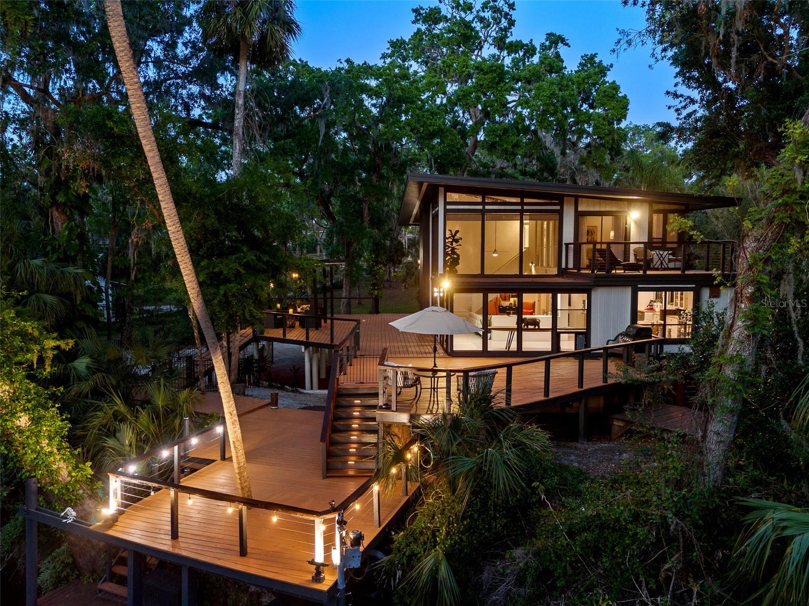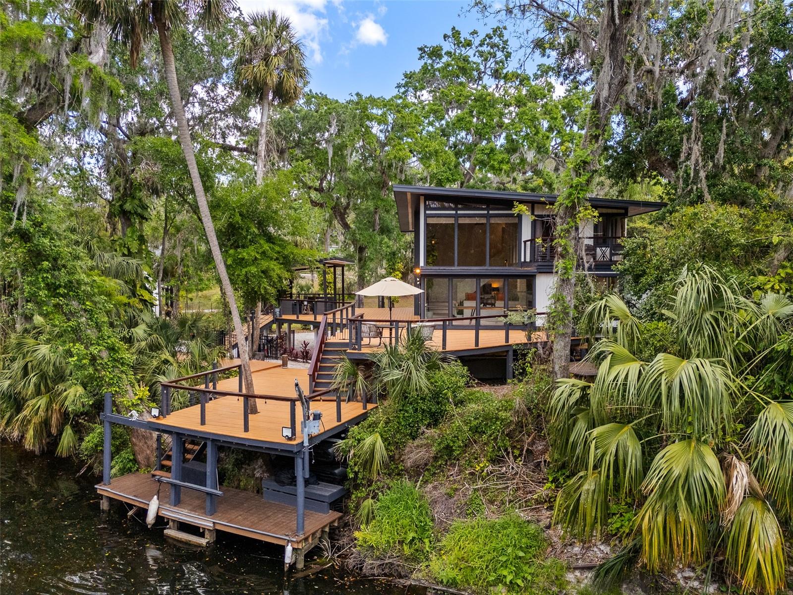 This exceptional five-bedroom, three-bath residence is on an acre lot within the exclusive, gated Alafia Preserve neighborhood, a community comprised of only four homes and offers a refined and private living experience. Upon approach, an updated paved circular driveway leads to the residence's grand, 12-foot wide staircase. As you enter, you’ll be captivated by the floor-to-ceiling windows that illuminate the foyer with abundant natural light. The expansive living room features an 18-foot ceiling, a built-in decorative fireplace and a distinctive wood veneer feature wall. The meticulously remodeled kitchen is equipped with new appliances, including a Bosch refrigerator and an induction cooktop range, complemented by butcher block countertops with a waterfall edge, glass tile backsplash and soft-close drawers. Adjacent to the kitchen, the dining room presents a dry bar with glass display cabinetry. The primary bedroom, characterized by floor-to-ceiling windows and interior windows overlooking the living room, coupled with a private balcony provides a tranquil retreat. All bedrooms are uniquely appointed with aquarium windows. Cohesive gold fixtures and hardware contribute to the residence's unified aesthetic. The first level includes an in-law apartment, featuring a bedroom, full bath, living room and kitchenette, offering versatile accommodation. Practical amenities include dual-zoned air-conditioning units, double-pane UV film-covered windows, built-out closets and pantry, and retextured interior drywall. The laundry room is outfitted with a custom dog washing station and direct exterior access. The exterior features a 3,500-square-foot main-level deck with a covered sitting area, dock access with over 90 feet of riverfront on the Alafia River, a wraparound balcony, a separate workshop, and plenty of parking space for your RV or boat. The fenced-in animal area with a detached doghouse is ideal for pet comfort. The expansive sand garden, featuring a water feature/firepit and illuminated by three custom bollard lamps, creates a serene outdoor environment. In the A-rated Bloomingdale High School district, there are nearby shopping and dining varieties such as The Stein & Vine or Three Bulls Tavern & Brewery, as well as many entertainment options such as Urban Air Trampoline & Adventure Park or the Lithia Springs Conservation Park. All of this with close access to Interstate 75 and the Selmon Expressway leading to downtown Tampa.
