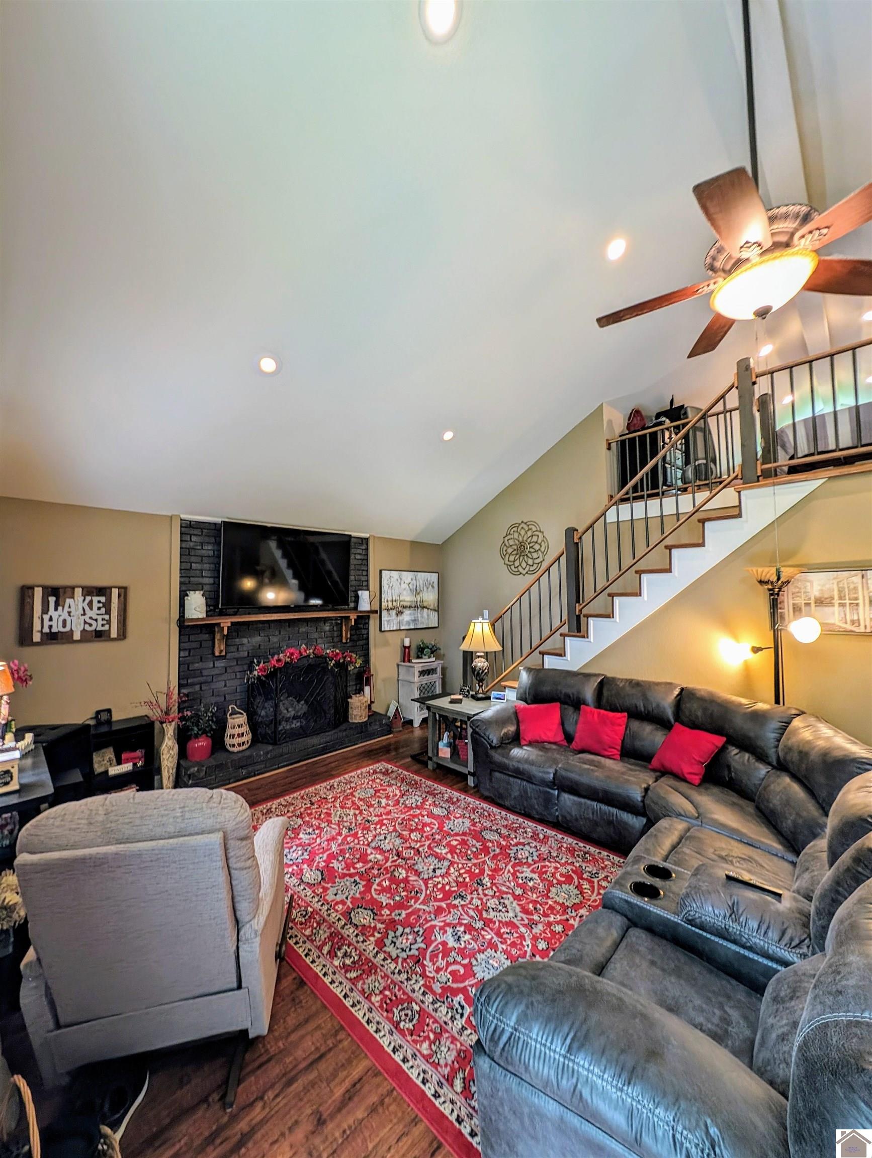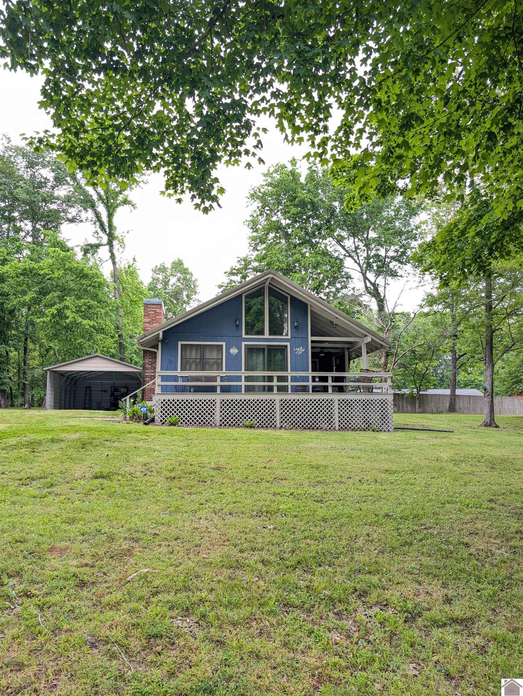 Enjoy the year round view of Lake Barkley with this cozy 1.5 story home sold with two lots. The home comes fully furnished and is move-in ready. It could be used as a primary residence, vacation home, or turn-key into investment and used as an AirBnB/VRBO. Inside features 2 bedrooms, 1 bathroom, wood and tile flooring, recessed lighting, fireplace, tinted windows and sliding glass doors. Step outside and enjoy the spacious yard with a partial privacy fence, large back deck, wrapped front deck that is partially covered with a sun screen, and carport that is enclosed on 3 sides with electricity. The property is less than 2 miles from Calhoun Hill Boat Ramp. Allowing for easy access to Lake Barkley.