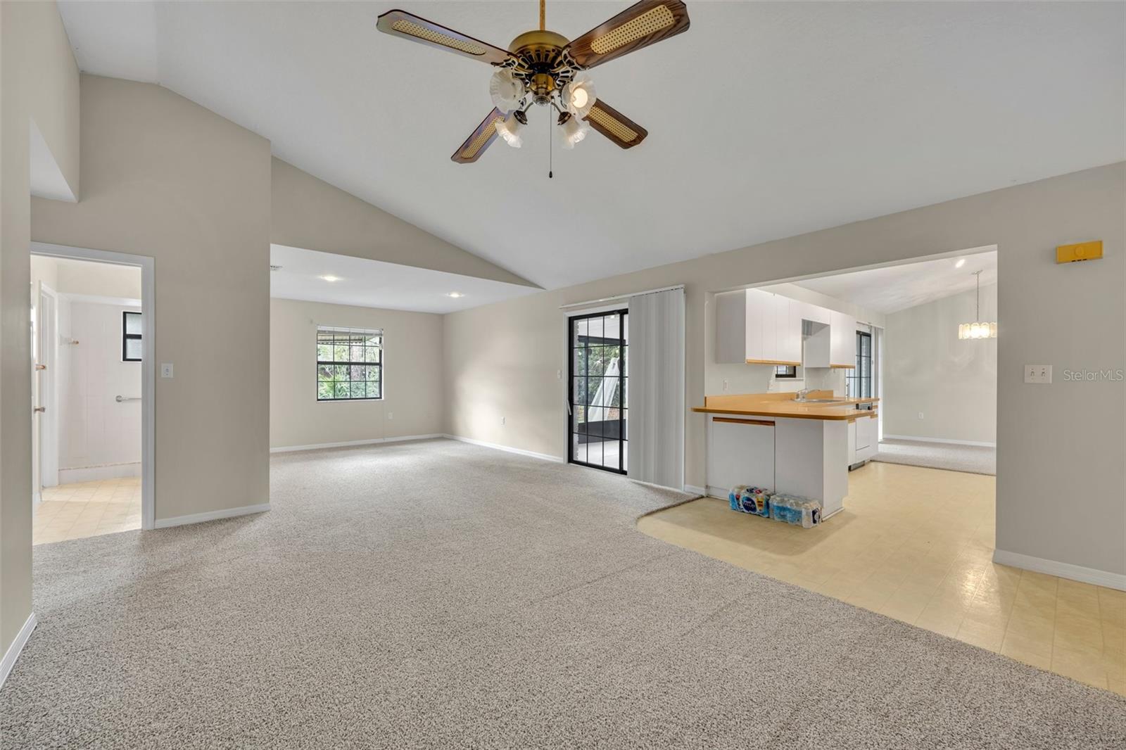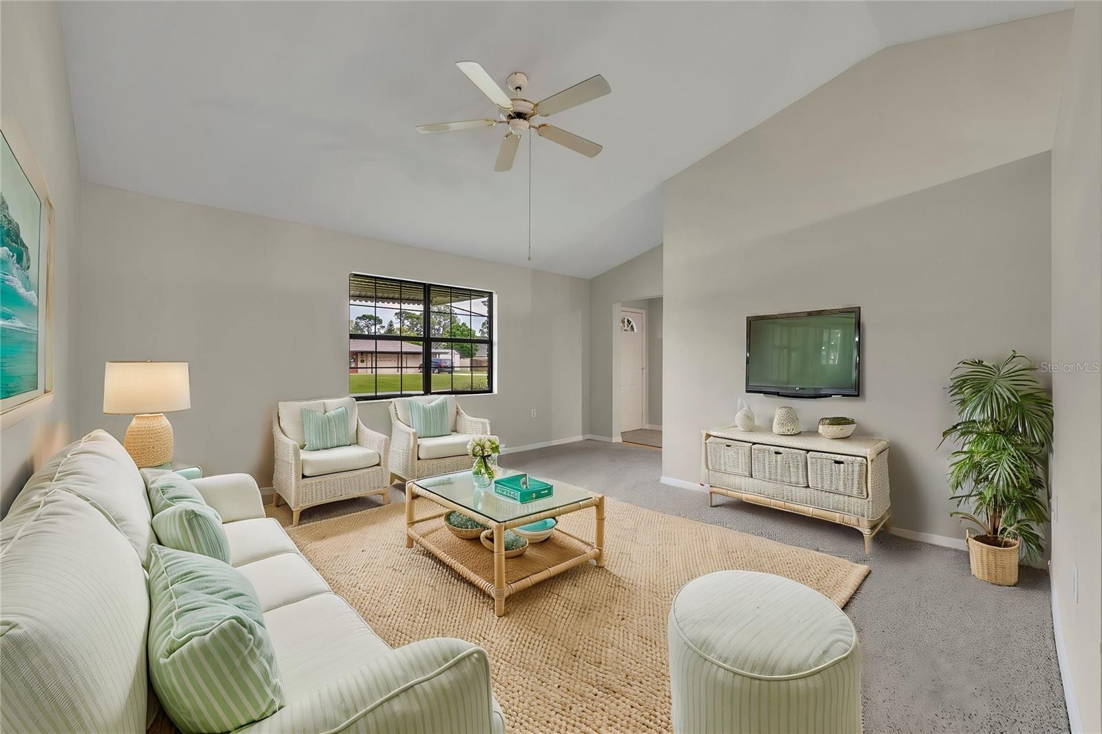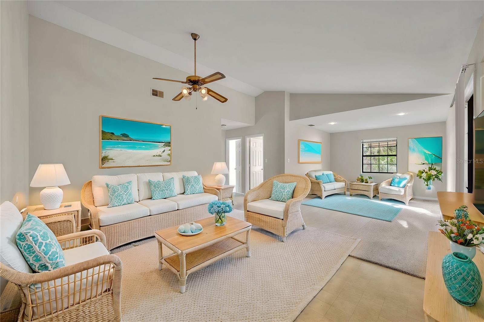Step through my front door, and you’ll immediately notice my **soaring high ceilings**, giving every space an open, airy feel that lets the Florida sunshine pour in. My **great room** is the heart of the home—a spacious, inviting area where you can gather with family and friends, binge your favorite shows, or just stretch out and enjoy the coastal breeze from my ceiling fans. With my **split-bedroom floor plan**, everyone gets their own slice of comfort and privacy—whether it’s for peaceful sleep, productivity, or simply kicking back in your own space.