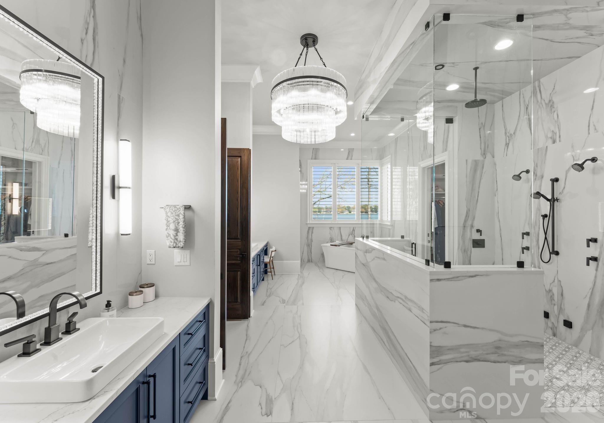 Slide open the doors and transition instantly into resort-style living, where a saltwater pool and spa overlook the water, complemented by fire features and a covered lakeside pavilion designed for year-round enjoyment. A custom pool house and an exceptional private dock by Lyfe Marine — complete with covered boat storage, multiple lifts, and jet ski platforms—create a true waterfront retreat.