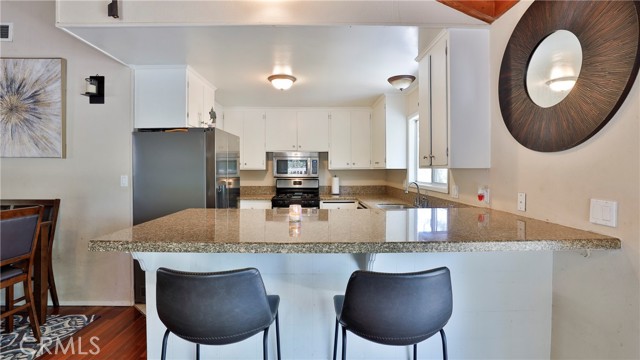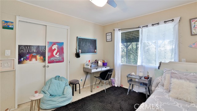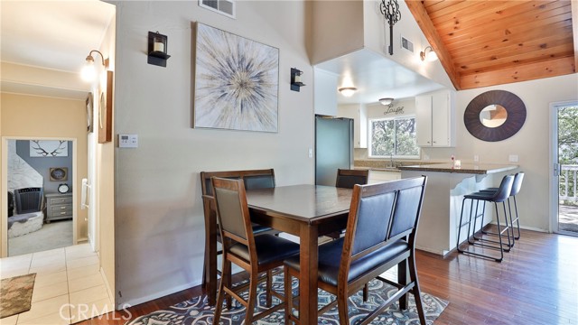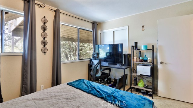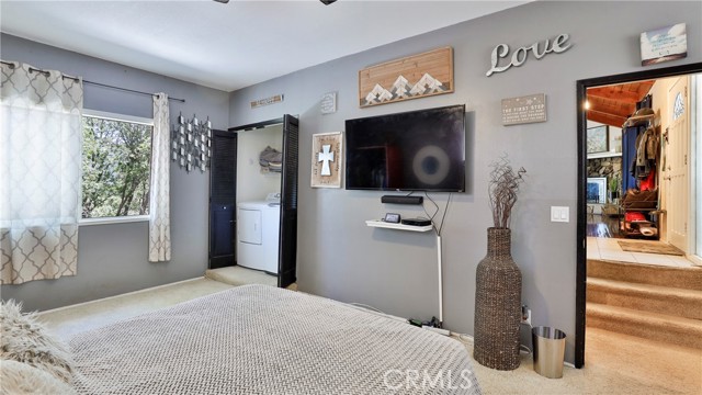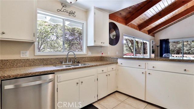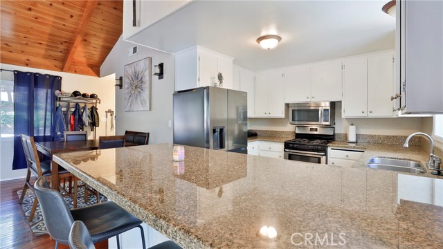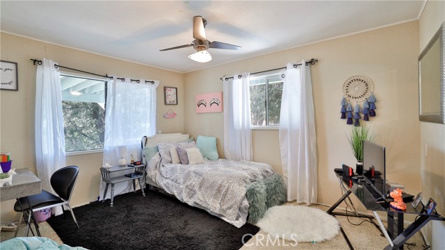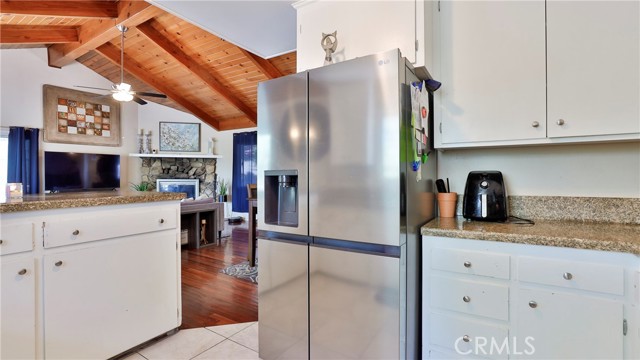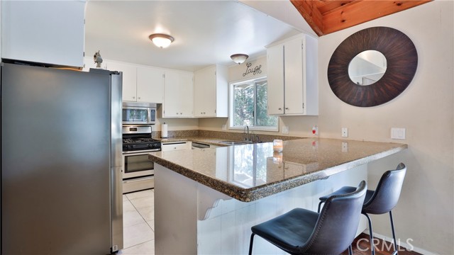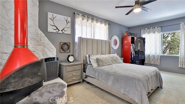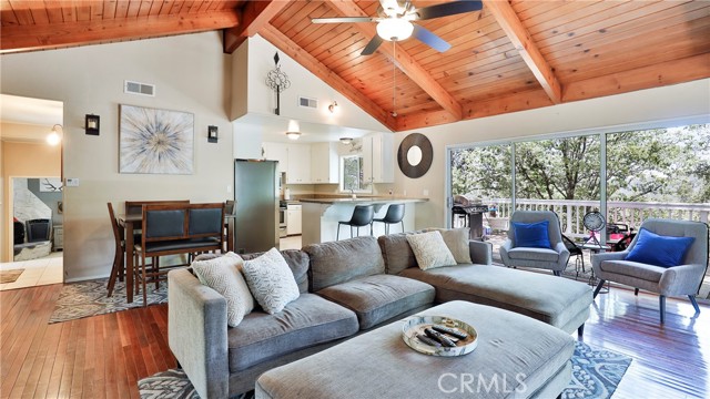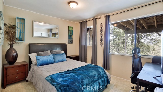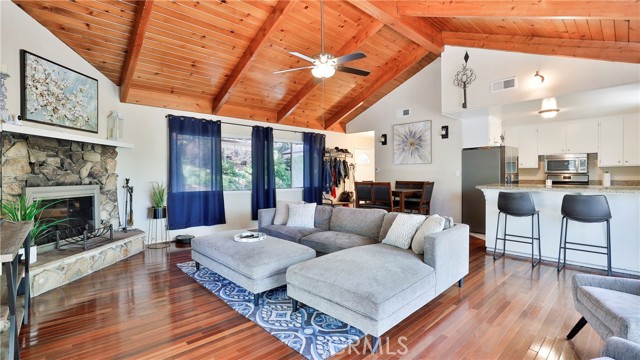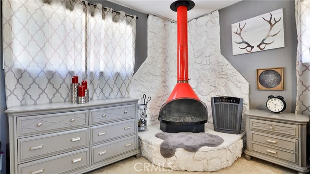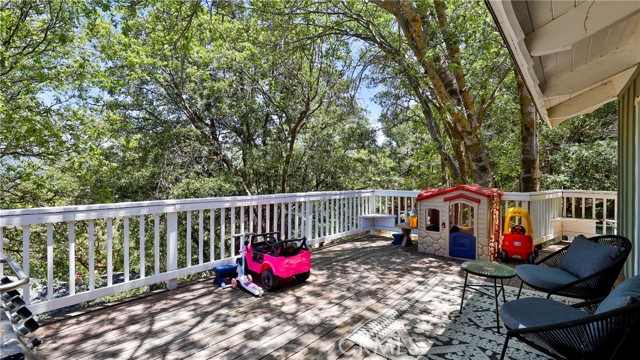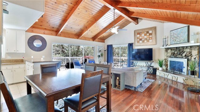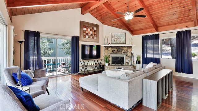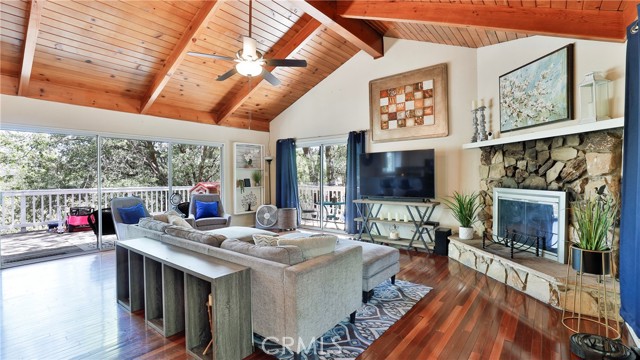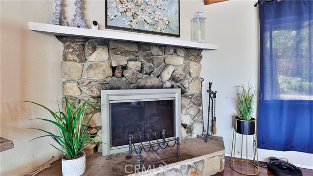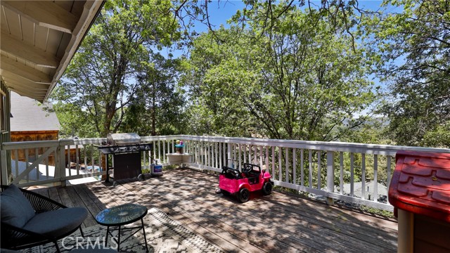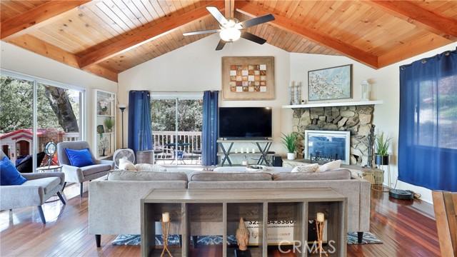 Beautiful home in the city of Crestline close to Lake Gregory with level entry. This home features 4 bedroom 2 bath open floor plan with one bedroom on first floor and 3 bedroom 1 bath on bottom floor. Large bedroom has a fire place. Another fireplace in main living room area. Spacious living room next to break fast counter in kitchen and exit to your upper deck. Tile and wood flooring throughout the home and carpet in bedrooms. A must see. This property has more than what shows on title. Lots of living space area.