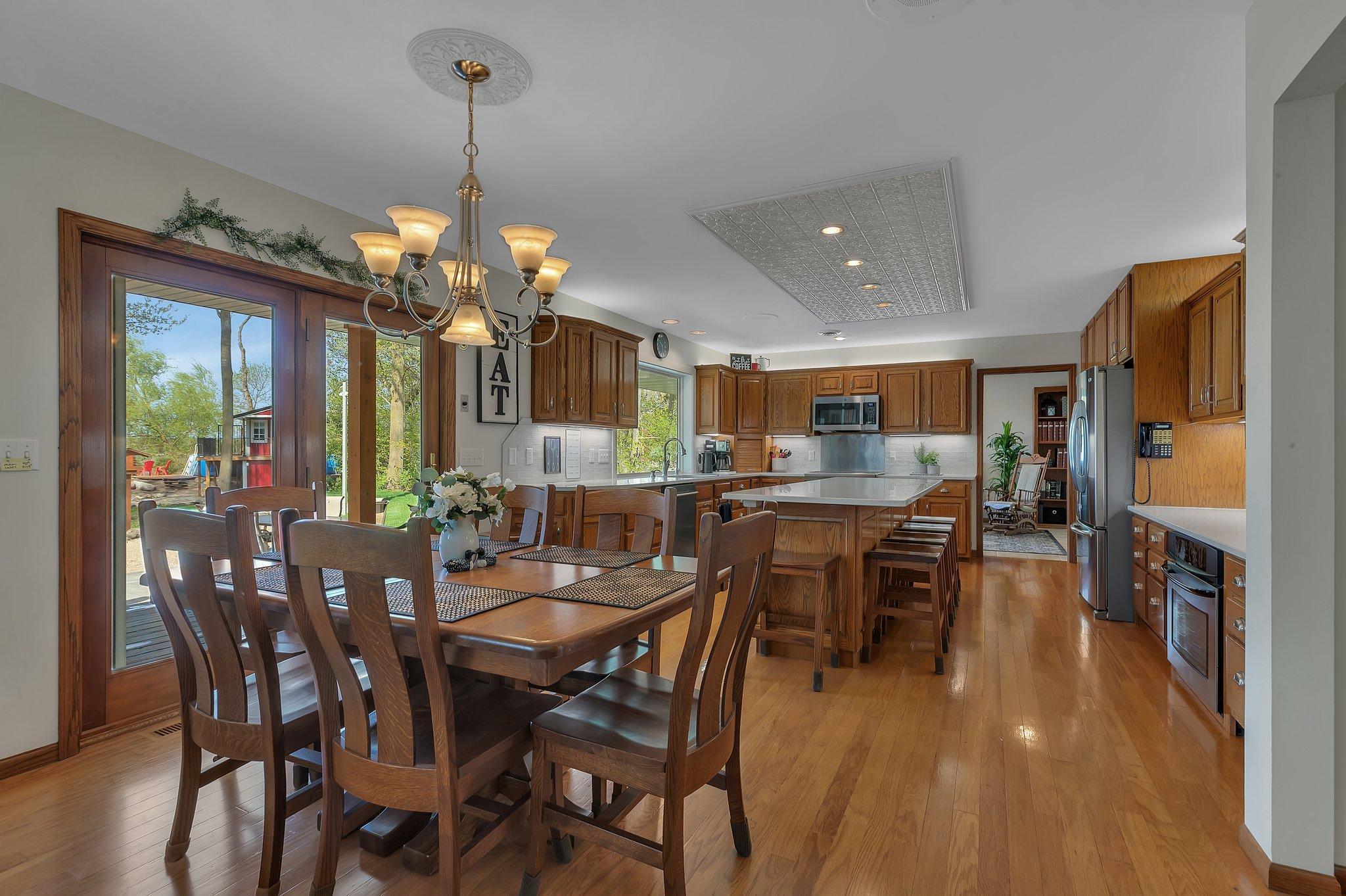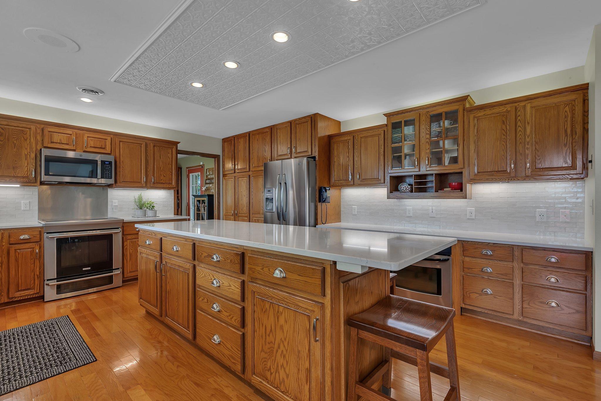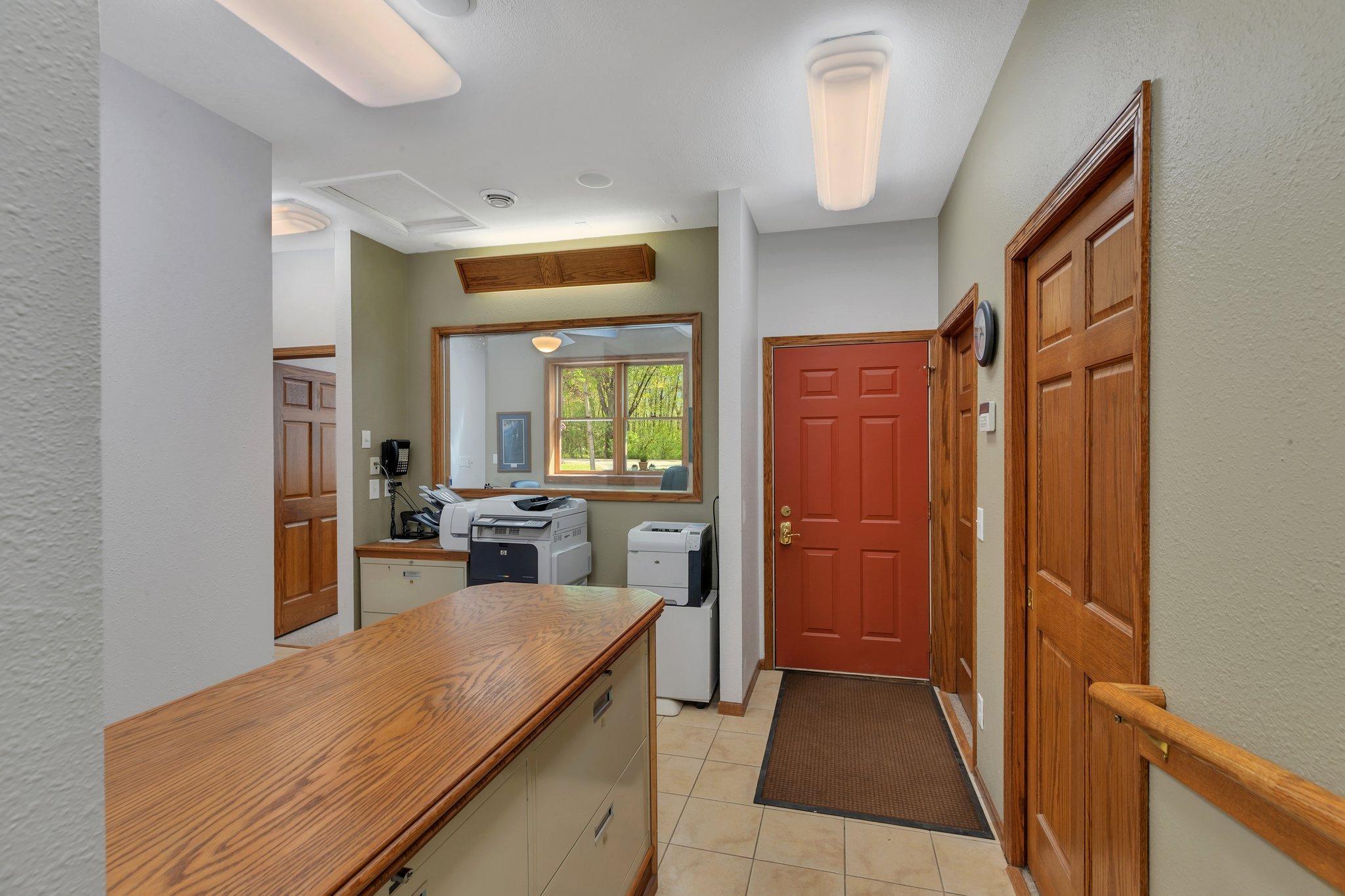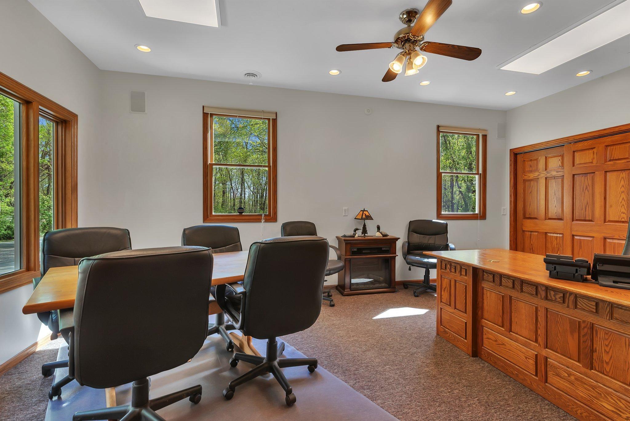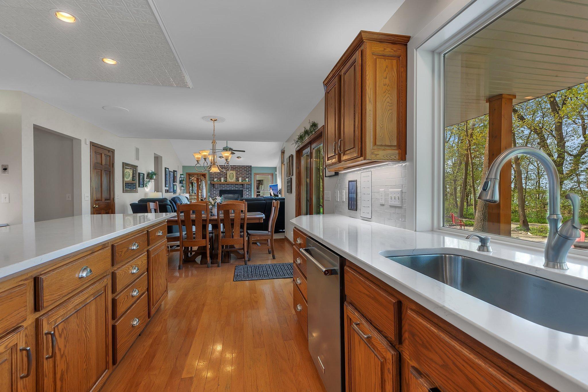 Everything you desire in lake living! Stunning sunsets! Reel Walleye in from the dock! Level lot leads gently to the sand beach. Lakeside paved patio, pool & pool house. Secluded location, quiet dead end paved road. Mature trees. New windows, siding, steel roof, patios, landscaping, quartz countertops & more! Open design flows between indoor to outdoor living spaces. The kitchen features a generous quartz-topped island, ensuring that the kitchen is indeed the heart of the home. The adjoining dining opens to the spacious porch & paved patio, inspiring gracious meals and entertaining. Holidays are a breeze: double induction oven & convenient 2nd under-the-counter oven! Living room offers floor-to-ceiling lake view windows & first fireplace. The Great Room transports you 'up north'! The log siding and wood-burning fireplace creates an environment sure to relax you. An upper level fifth bedroom and family room or den adjoins the great room, offering a secondary primary/guest room or Airbnb opportunity. Upstairs you will also find the spacious owner's suite with a full private bath & lake views, and the 2nd full bath as well as three more bedrooms, two of which have private vanities. The expansive office suite with a private entrance is perfect for the entrepreneur or for those who work remotely. Conversely, this area could be converted to a main floor bedroom suite/auxiliary living unit, game/billiards/bar, exercise room or even additional garage stalls. This home was built with quality elements, with an R value of 57 and ICF concrete forms that can withstand over 300 MPH wind. Attached three-stall heated garage with workshop, and a second detached one-stall 12x24 garage. 60 minutes from the west metro.