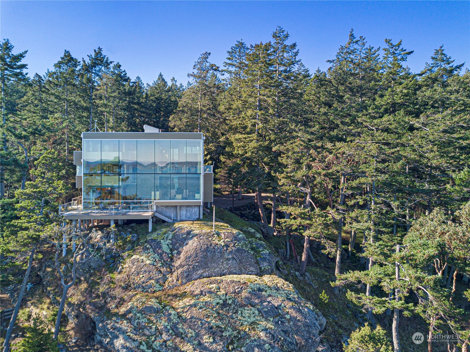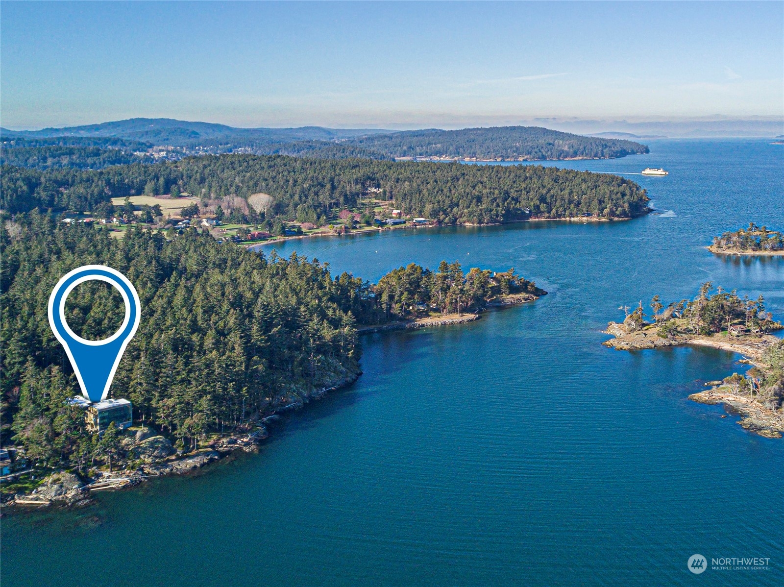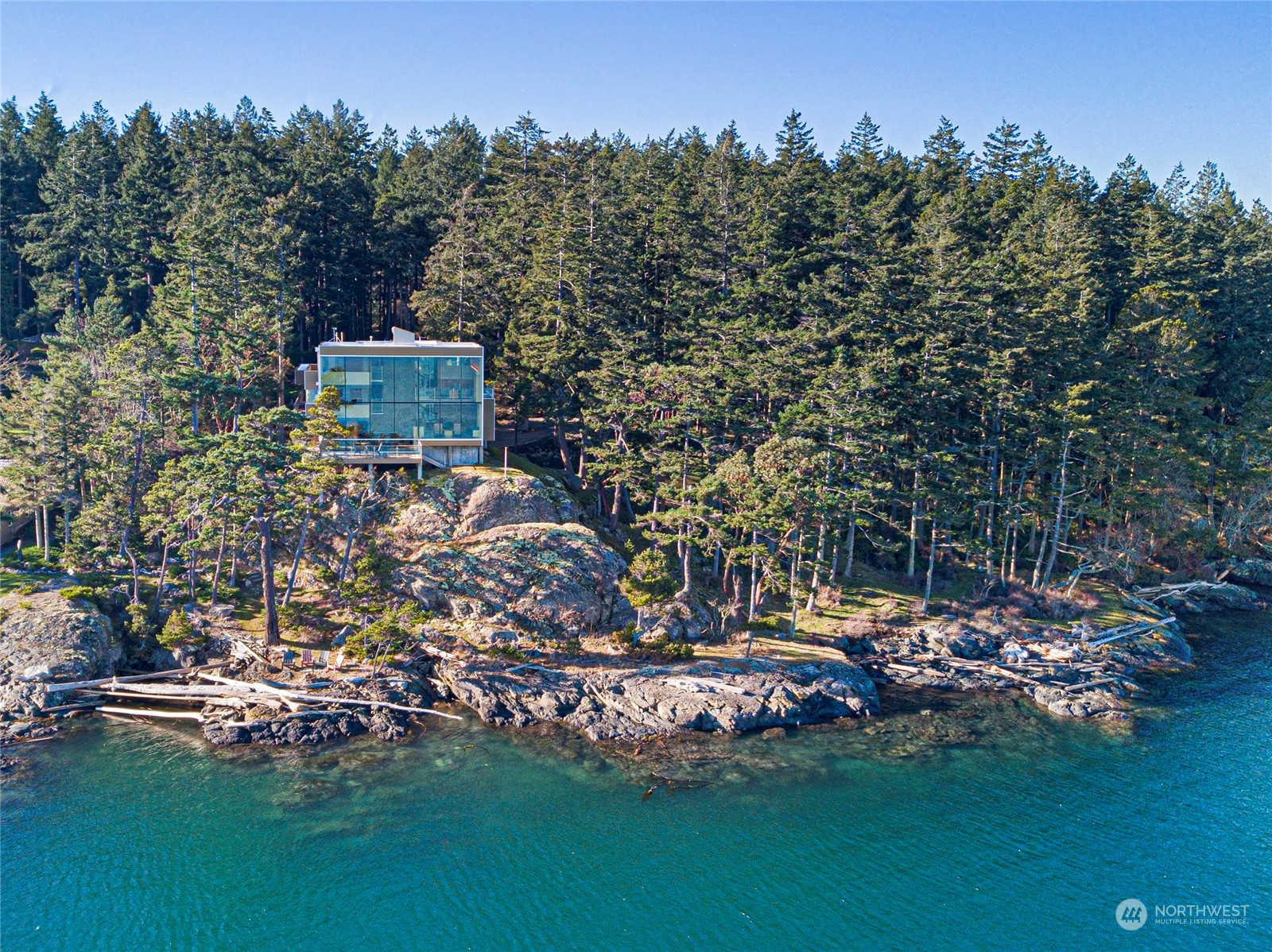 Stunning glass & steel home that could not be duplicated today. Designed by renowned architect Vasso Demetrious. Located in the coveted Pear Point area, just 3 miles from town. Magnificent views of San Juan Channel, the ferry, Lopez, Orcas, Shaw & Mt. Baker. Main house has 3,967 sqft of living space, featuring 2 bedrooms, 2.5 baths, & a spacious office. Plus a 1189 sqft 1 bed/1bath guest house with a kitchen & living room as well as a daylight drenched large 3-car garage/shop. 2.25 acres with 200 feet of waterfront & a forest as a buffer from the road. The home is turn-key ready for immediate occupancy with furnishings & a full suite of voice-activated high-end A/V equipment & lighting. Suitable as either a primary or a 2nd home.