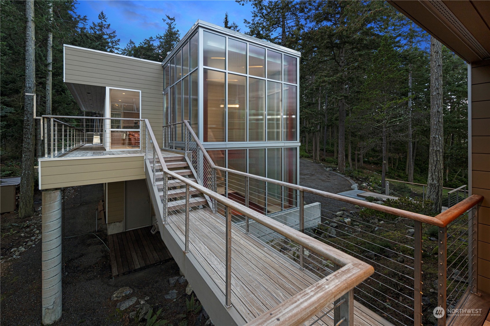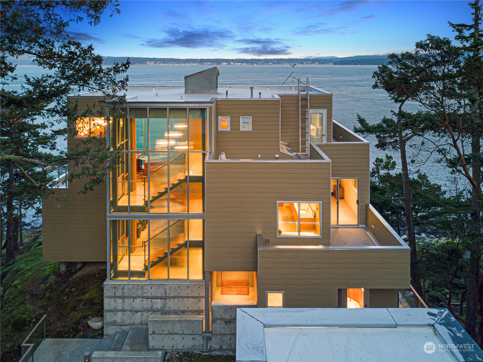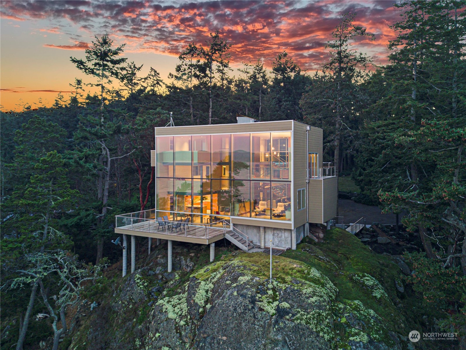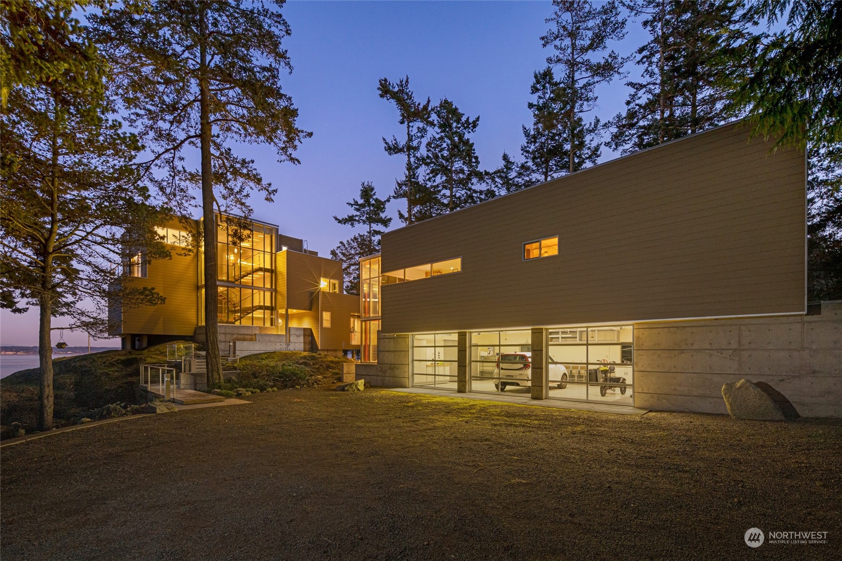 Stunning glass & steel home that could not be duplicated today. Designed by renowned architect Vasso Demetrious. Located in the coveted Pear Point area, just 3 miles from town. Magnificent views of San Juan Channel, the ferry, Lopez, Orcas, Shaw & Mt. Baker. Main house has 3,967 sqft of living space, featuring 2 bedrooms, 2.5 baths, & a spacious office. Plus a 1189 sqft 1 bed/1bath guest house with a kitchen & living room as well as a daylight drenched large 3-car garage/shop. 2.25 acres with 200 feet of waterfront & a forest as a buffer from the road. The home is turn-key ready for immediate occupancy with furnishings & a full suite of voice-activated high-end A/V equipment & lighting. Suitable as either a primary or a 2nd home.