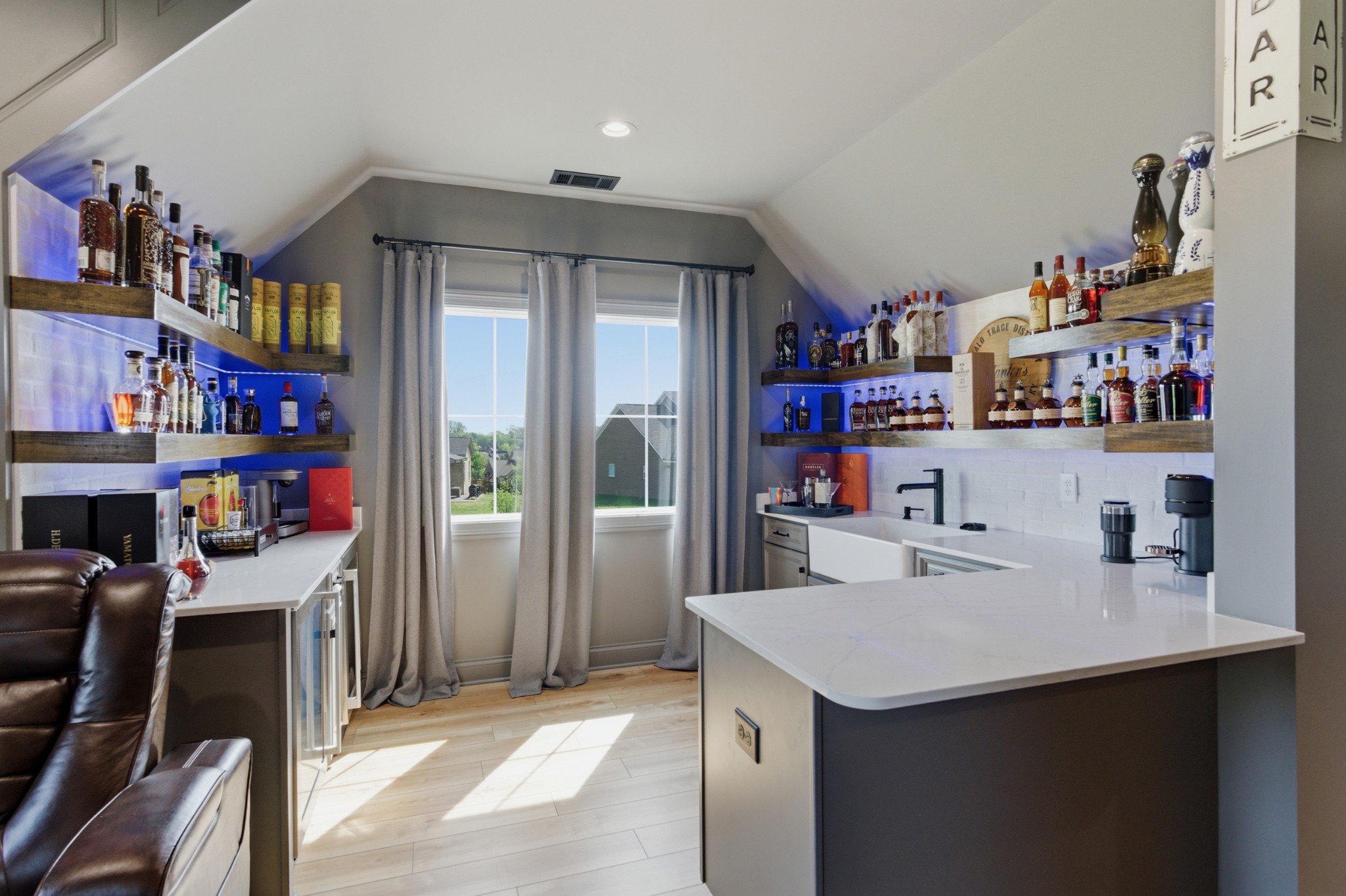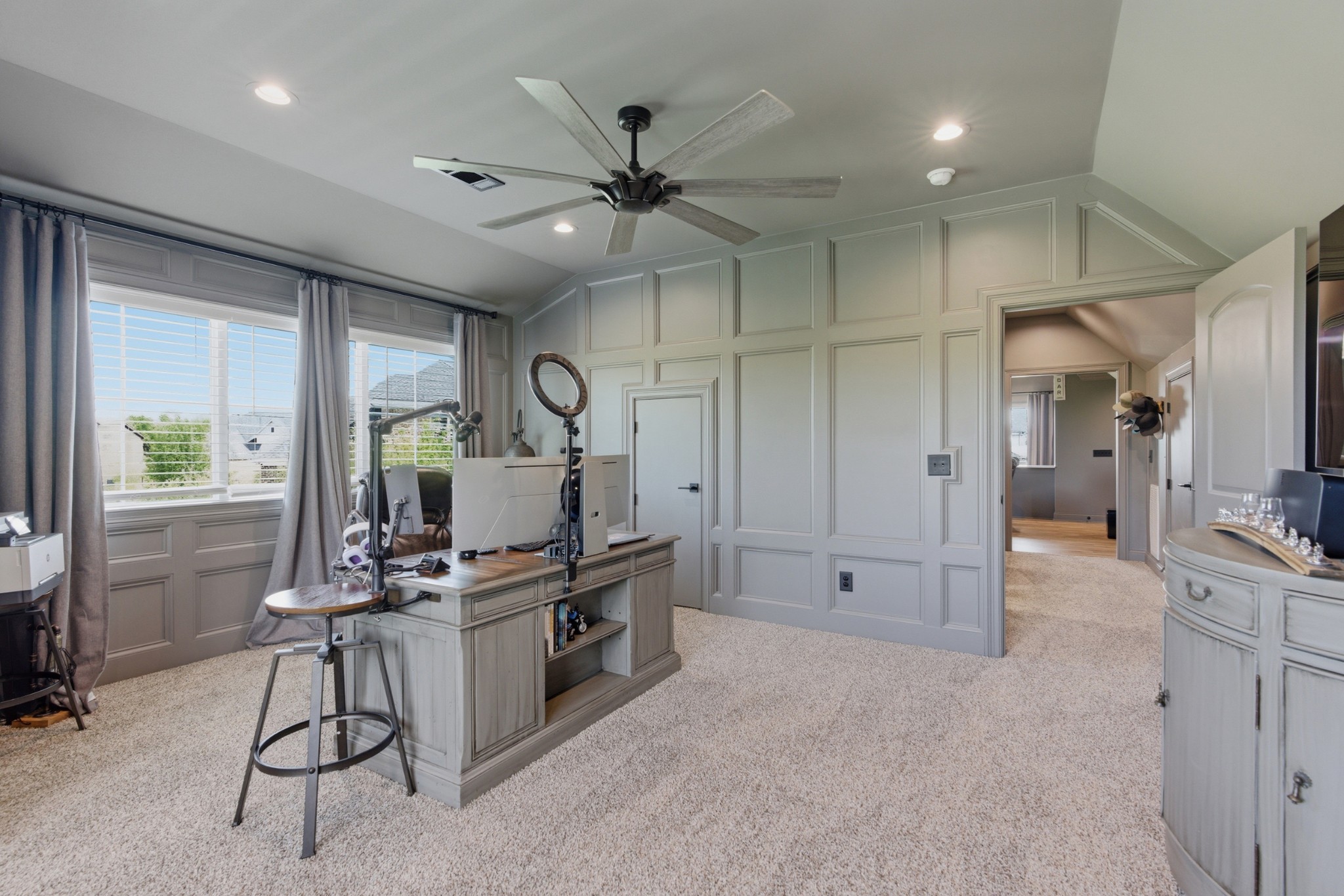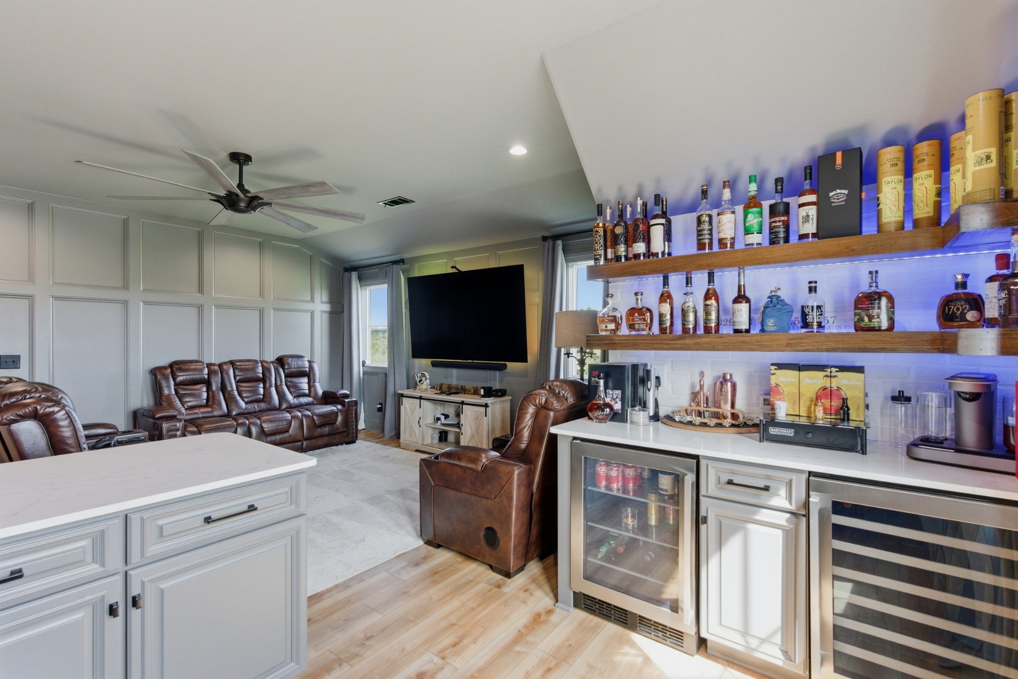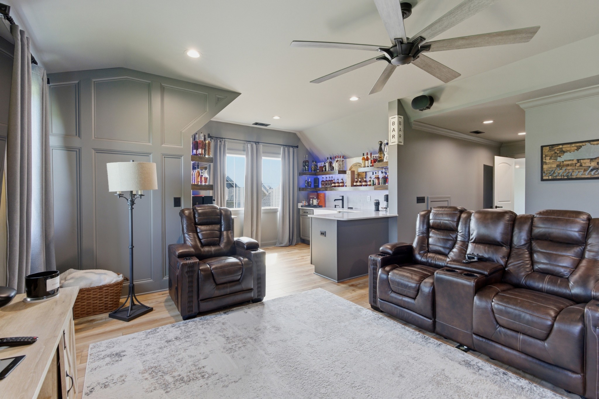The main-level owner’s suite is a true retreat, complete with a spacious custom closet and a spa-like bath featuring a deep soaking tub and walk-in shower with a rainfall showerhead. Upstairs, a large bonus room with a wet bar, beverage fridge, and built-in shelving adds even more space to relax or entertain.