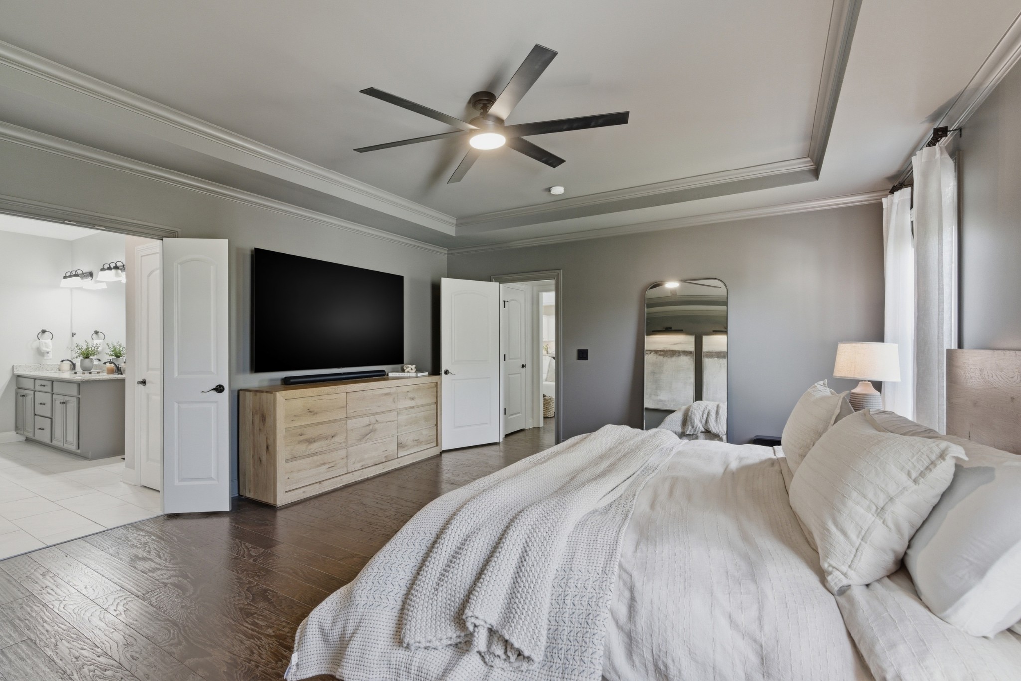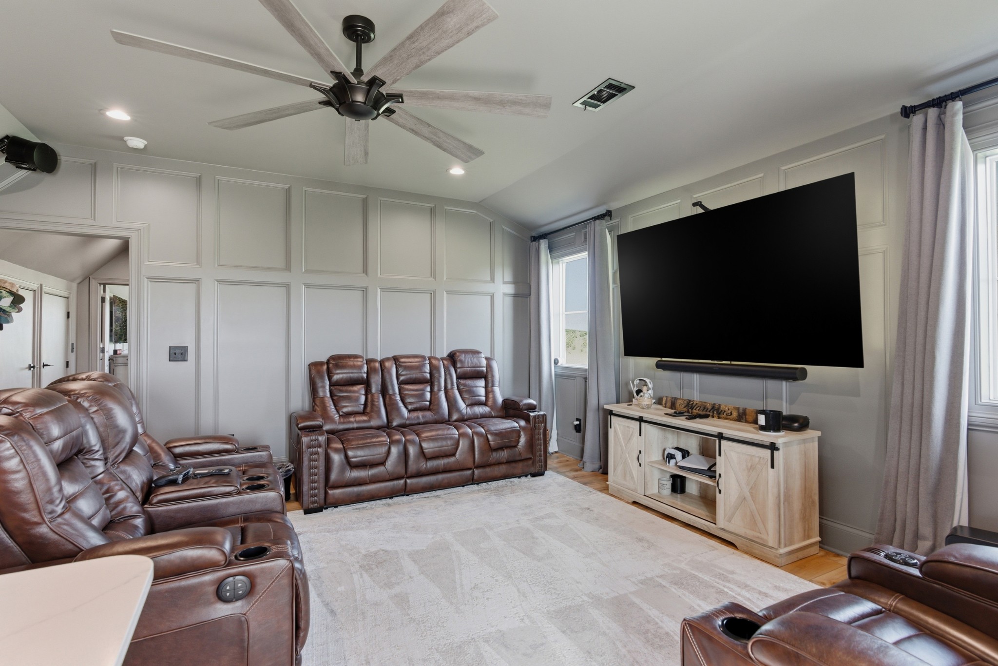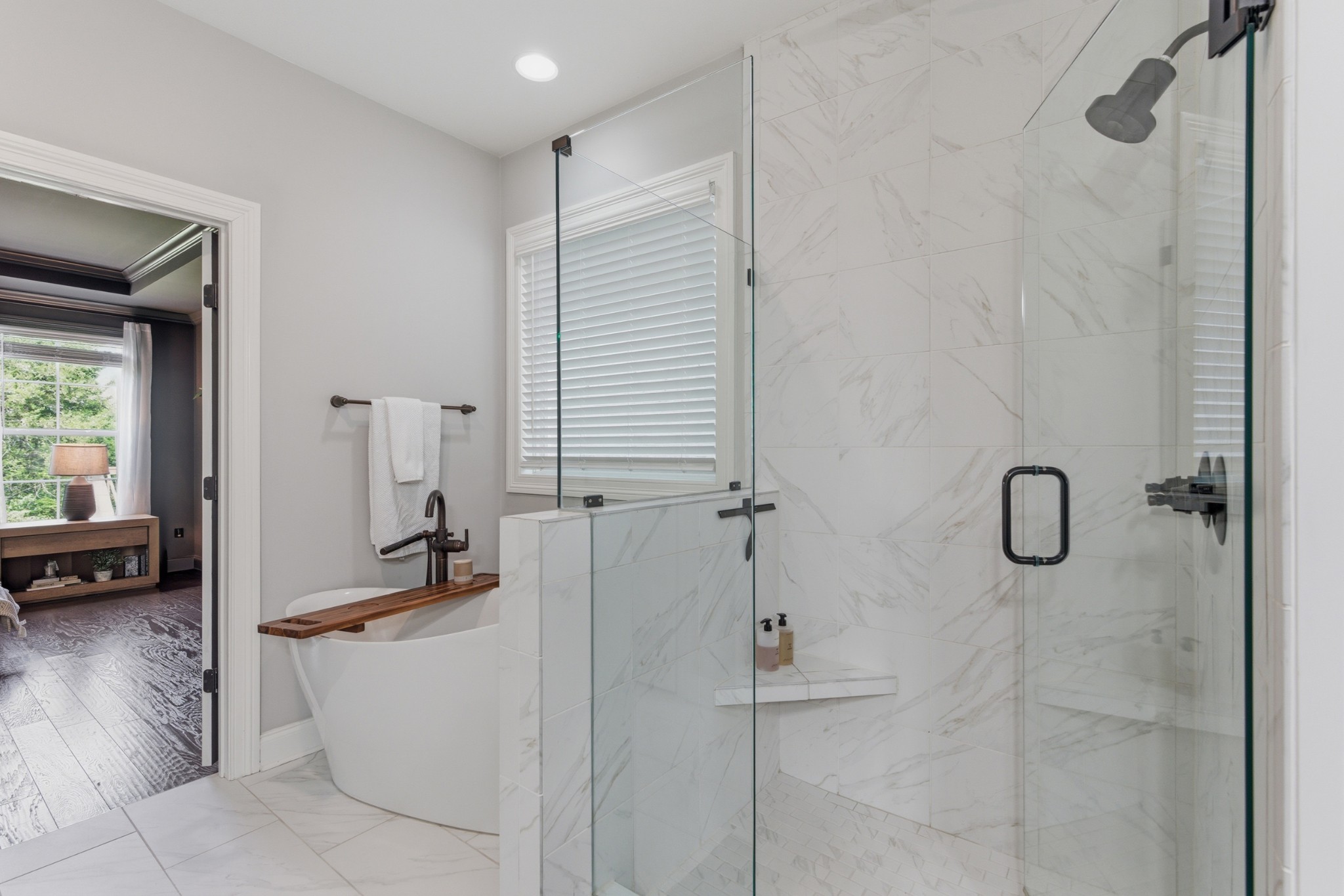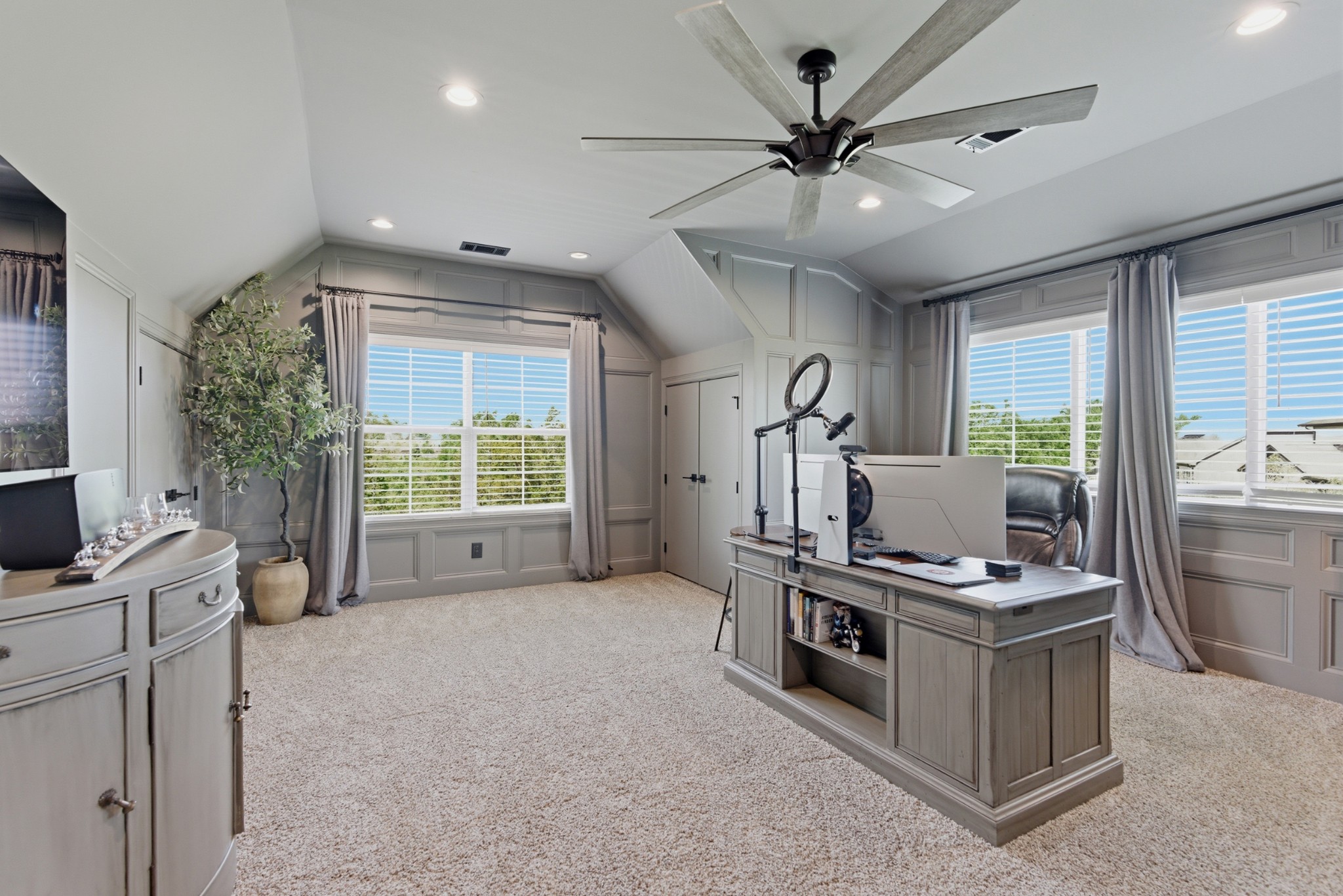 The main-level owner’s suite is a true retreat, complete with a spacious custom closet and a spa-like bath featuring a deep soaking tub and walk-in shower with a rainfall showerhead. Upstairs, a large bonus room with a wet bar, beverage fridge, and built-in shelving adds even more space to relax or entertain.