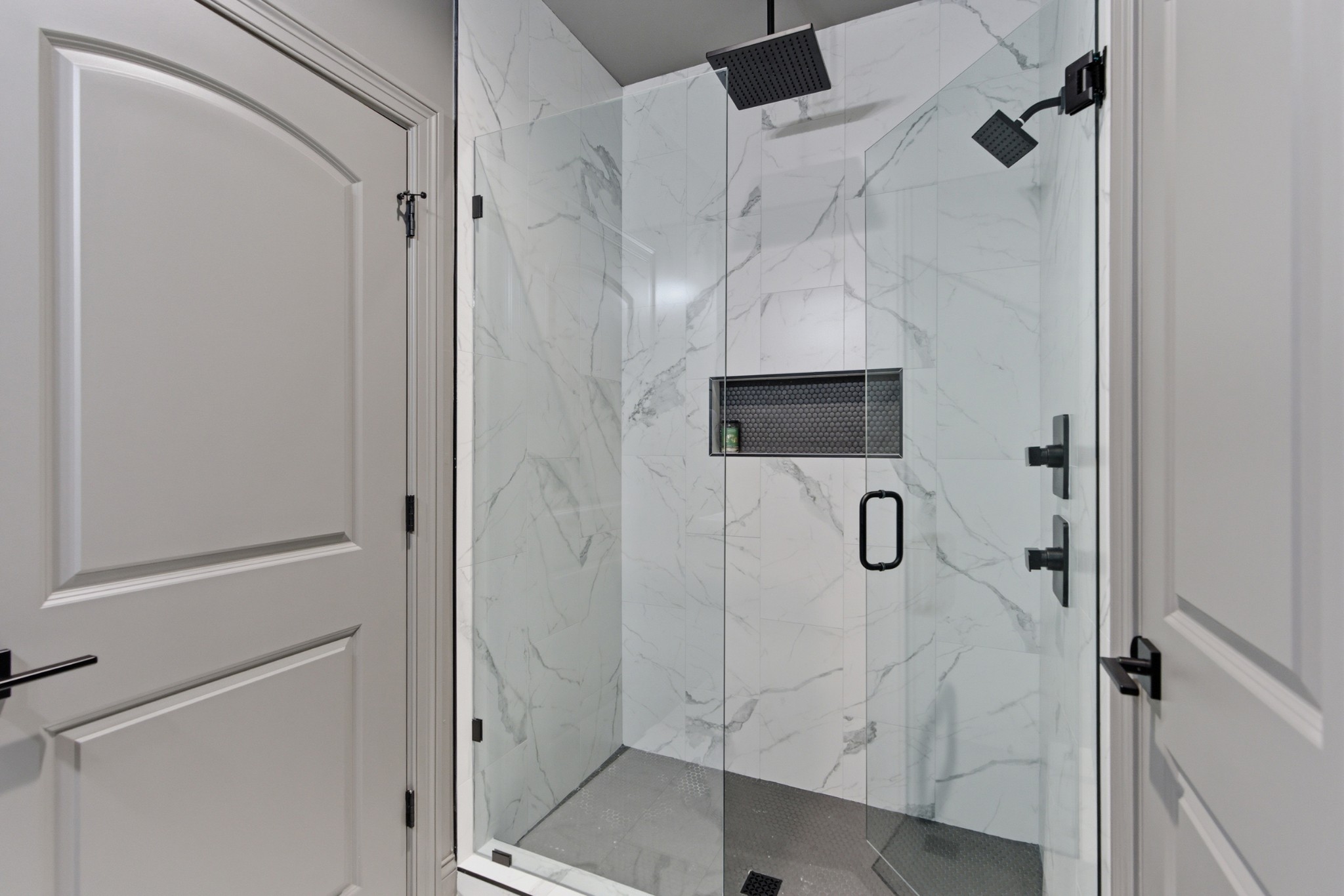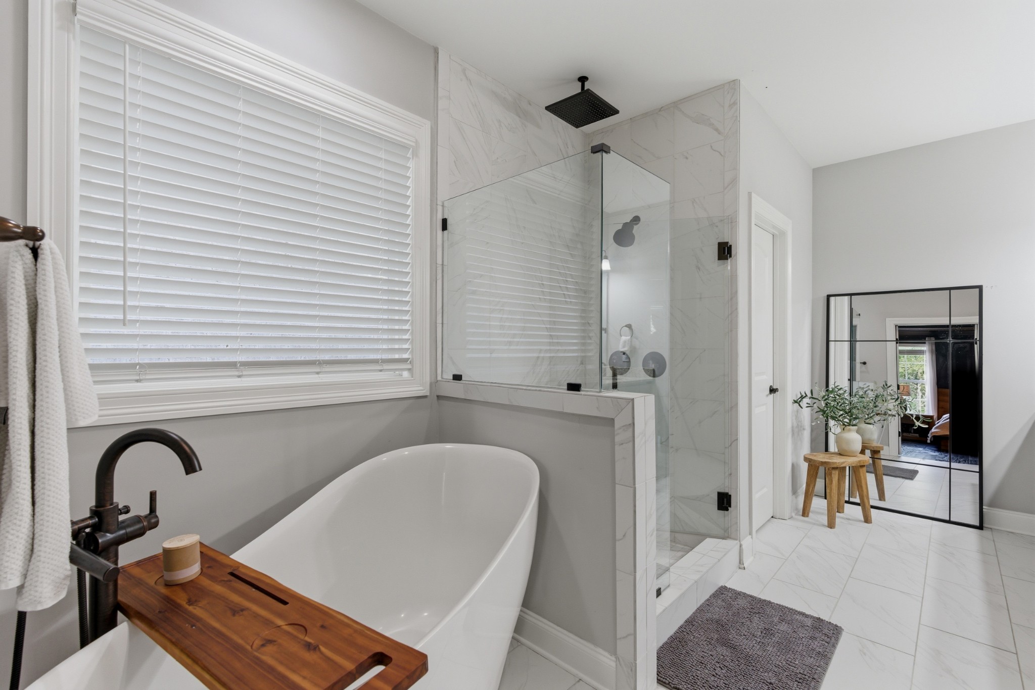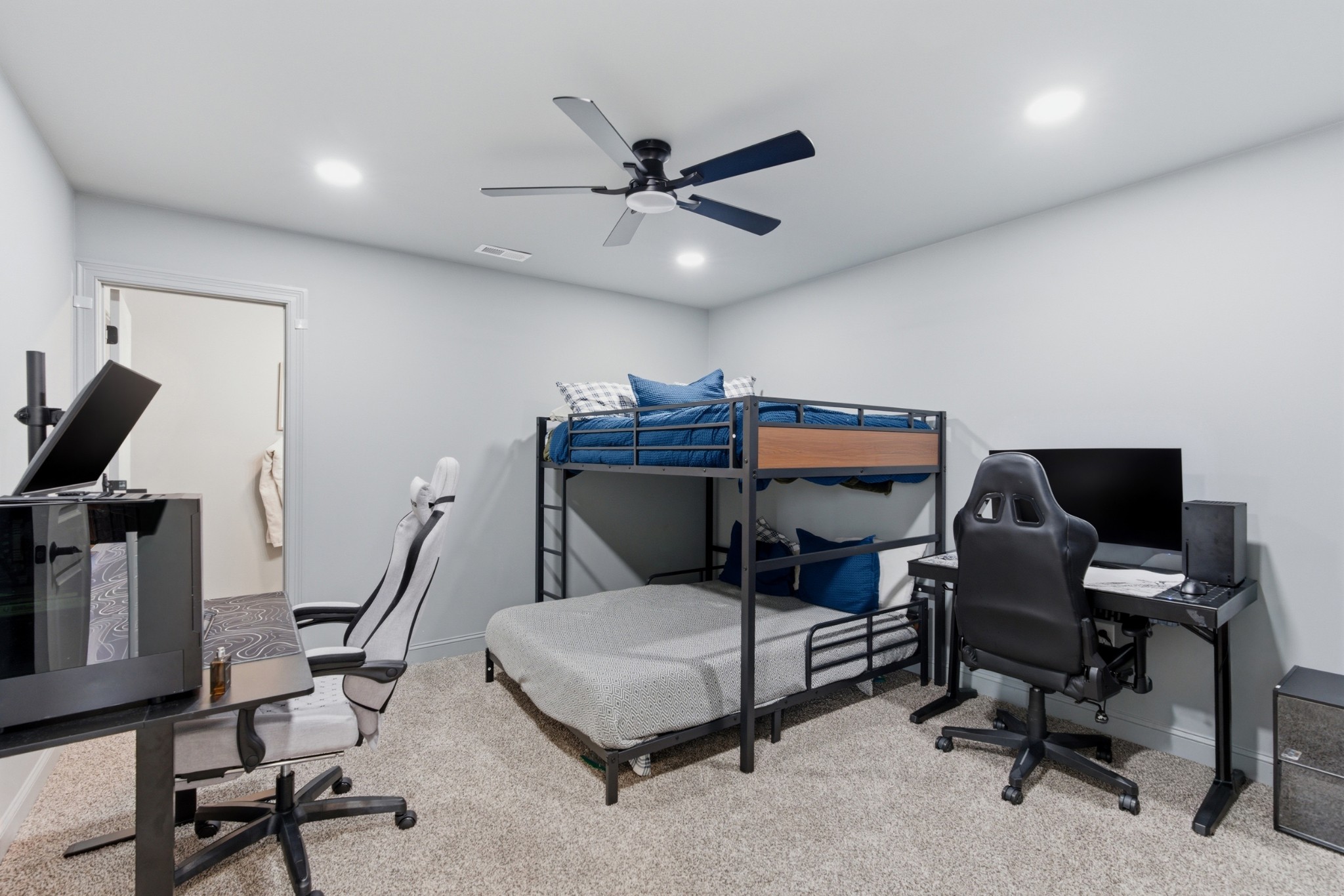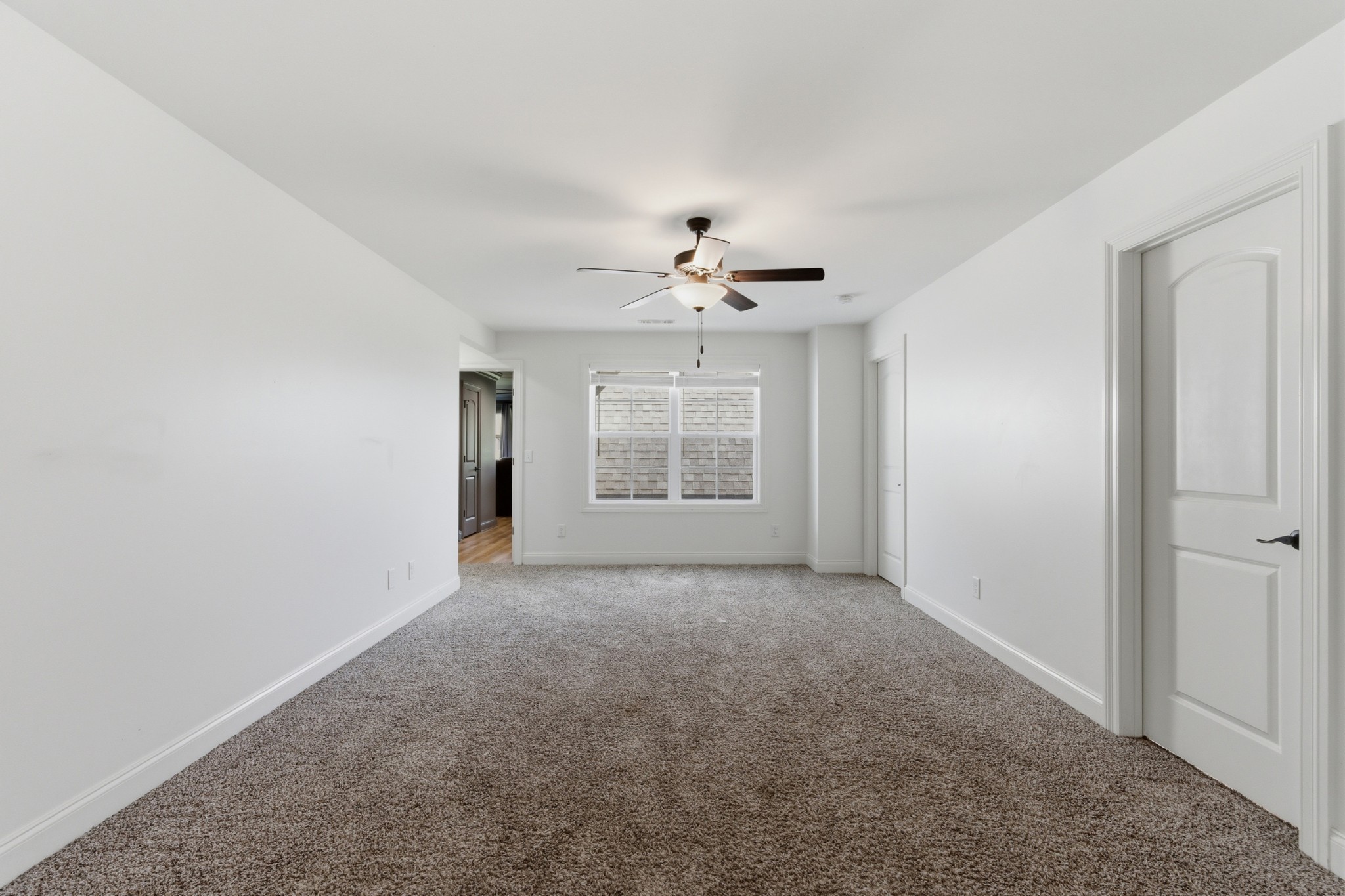 The main-level owner’s suite is a true retreat, complete with a spacious custom closet and a spa-like bath featuring a deep soaking tub and walk-in shower with a rainfall showerhead. Upstairs, a large bonus room with a wet bar, beverage fridge, and built-in shelving adds even more space to relax or entertain.