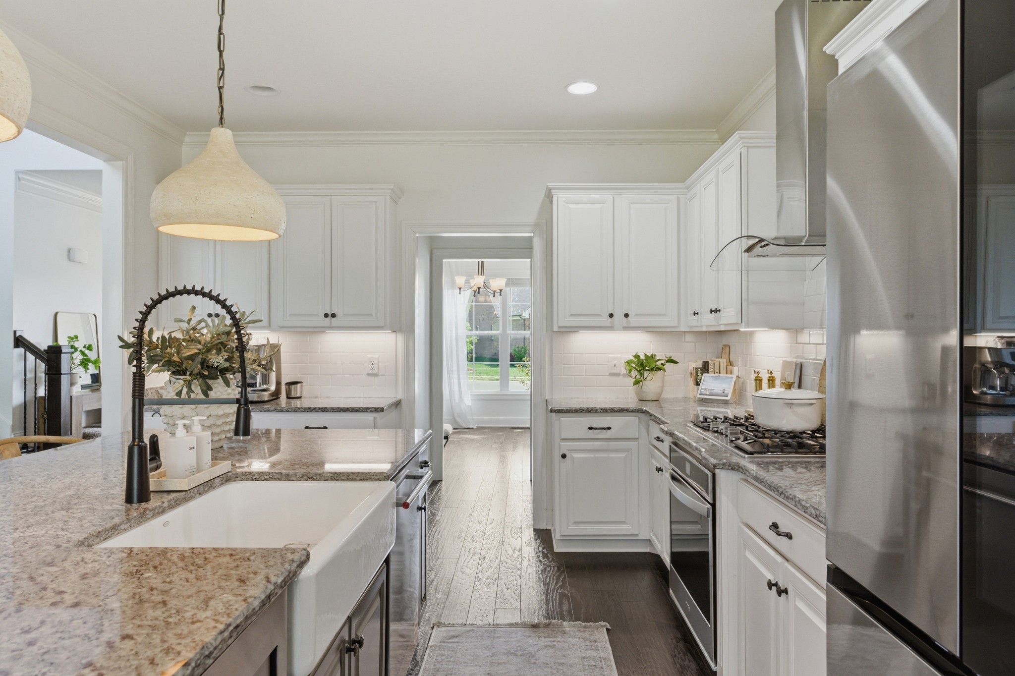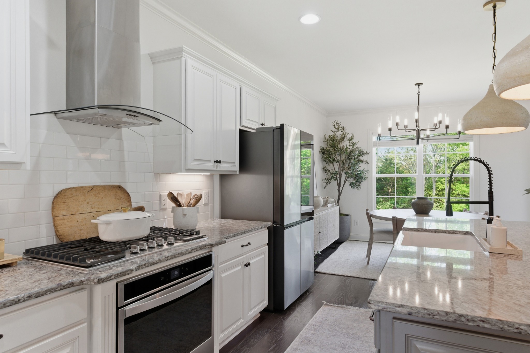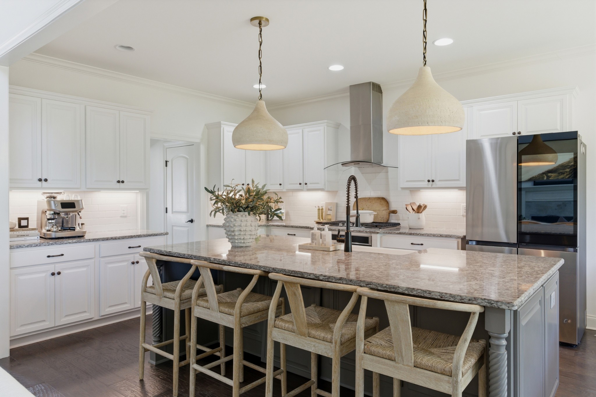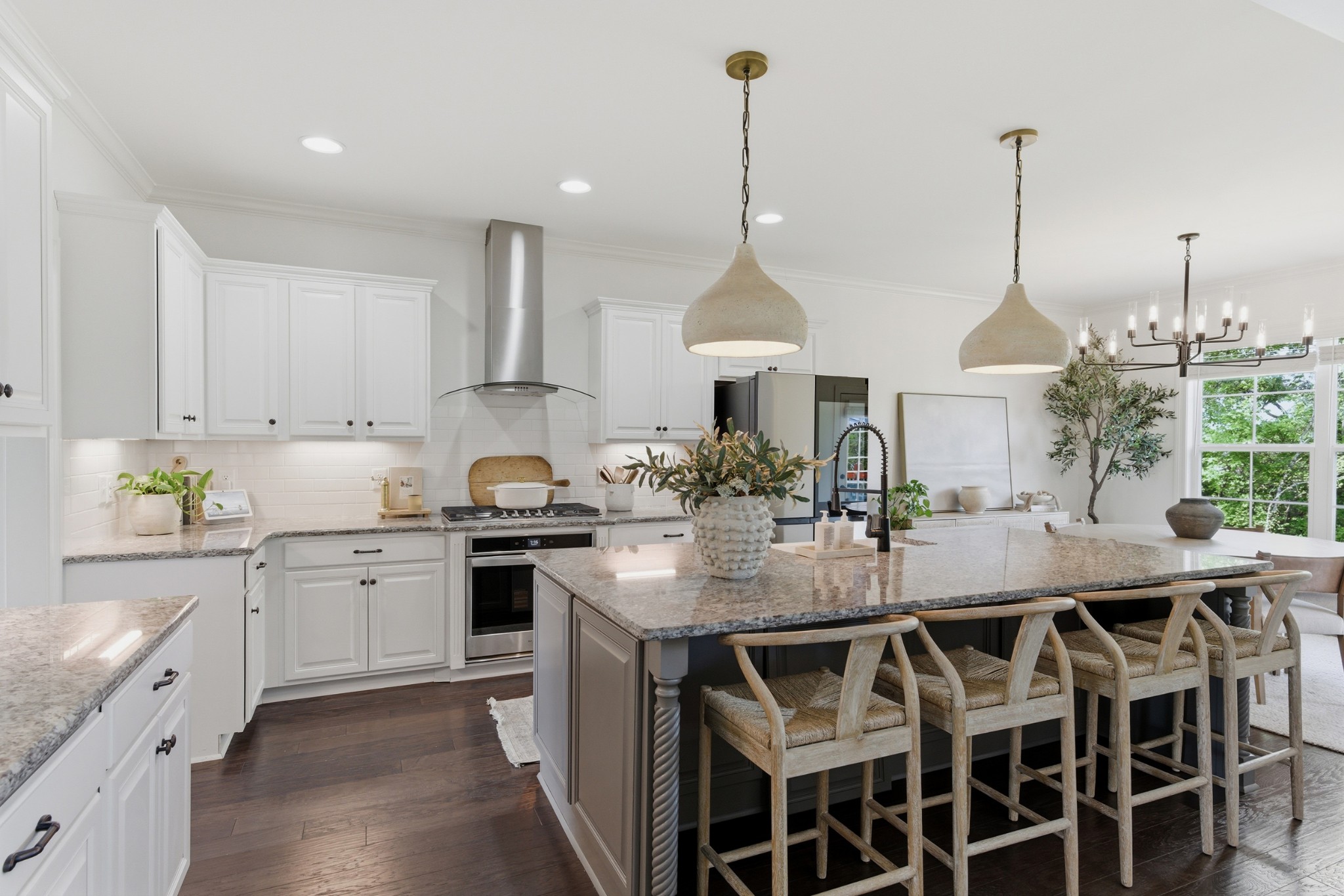 Inside, you’ll find exquisite custom woodwork, rich hardwood floors, and elegant finishes that create a warm yet refined atmosphere throughout. The chef-inspired kitchen is the heart of the home, featuring smart appliances, abundant cabinetry, and an expansive granite island perfect for gathering and entertaining. Multiple living and dining areas provide a flexible layout suited for both everyday living and hosting.