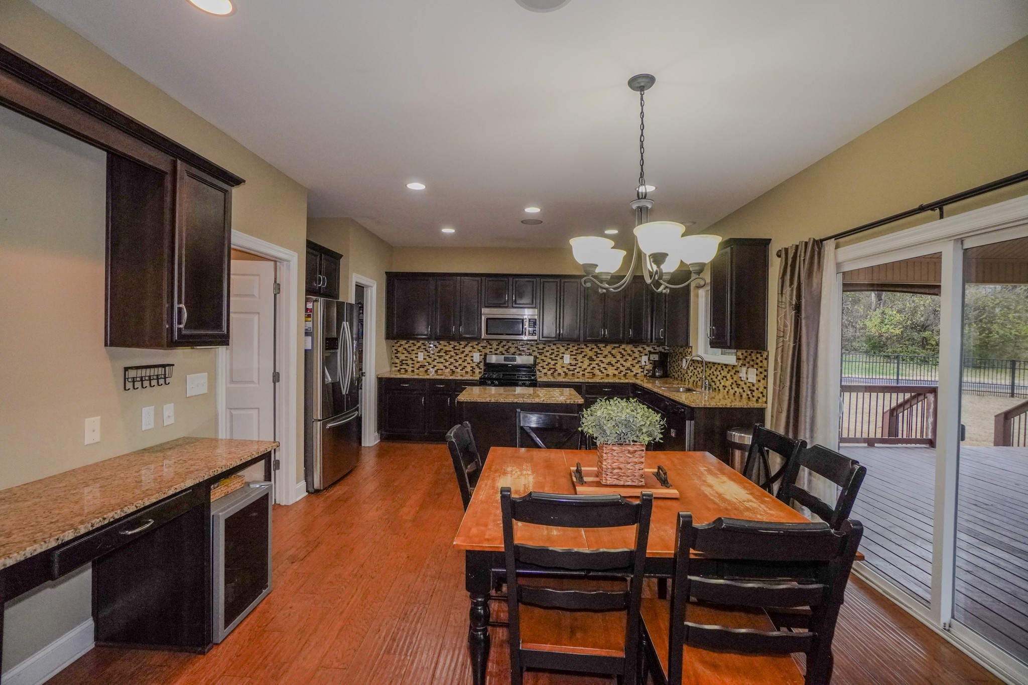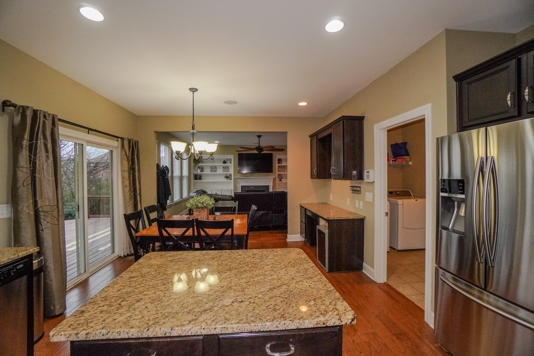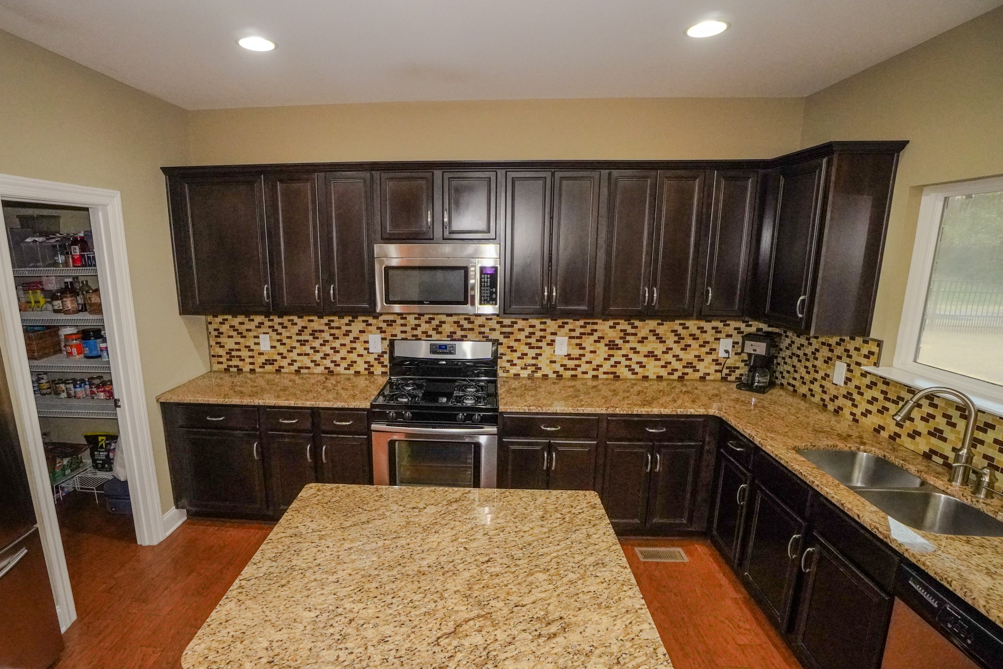 The open kitchen flows into the den and showcases granite countertops, a large island, stainless steel appliances, gas cooktop, tile backsplash, and a massive pantry. The living area features a cozy gas fireplace with logs. You’ll love the hardwood and tile floors, surround sound, newer roof and HVAC units, and true move-in-ready condition.