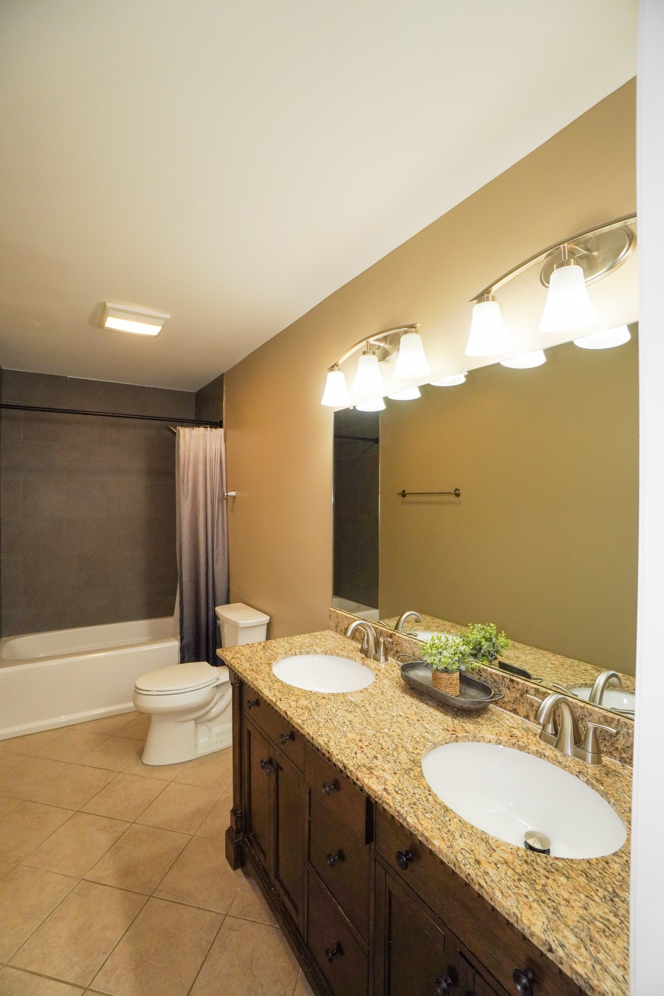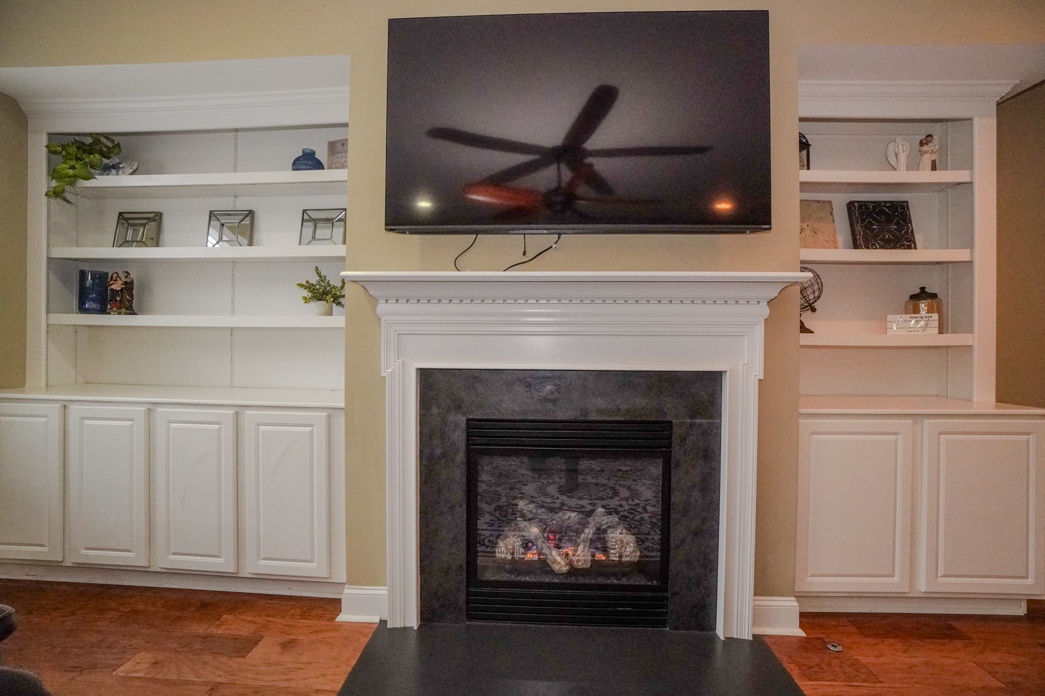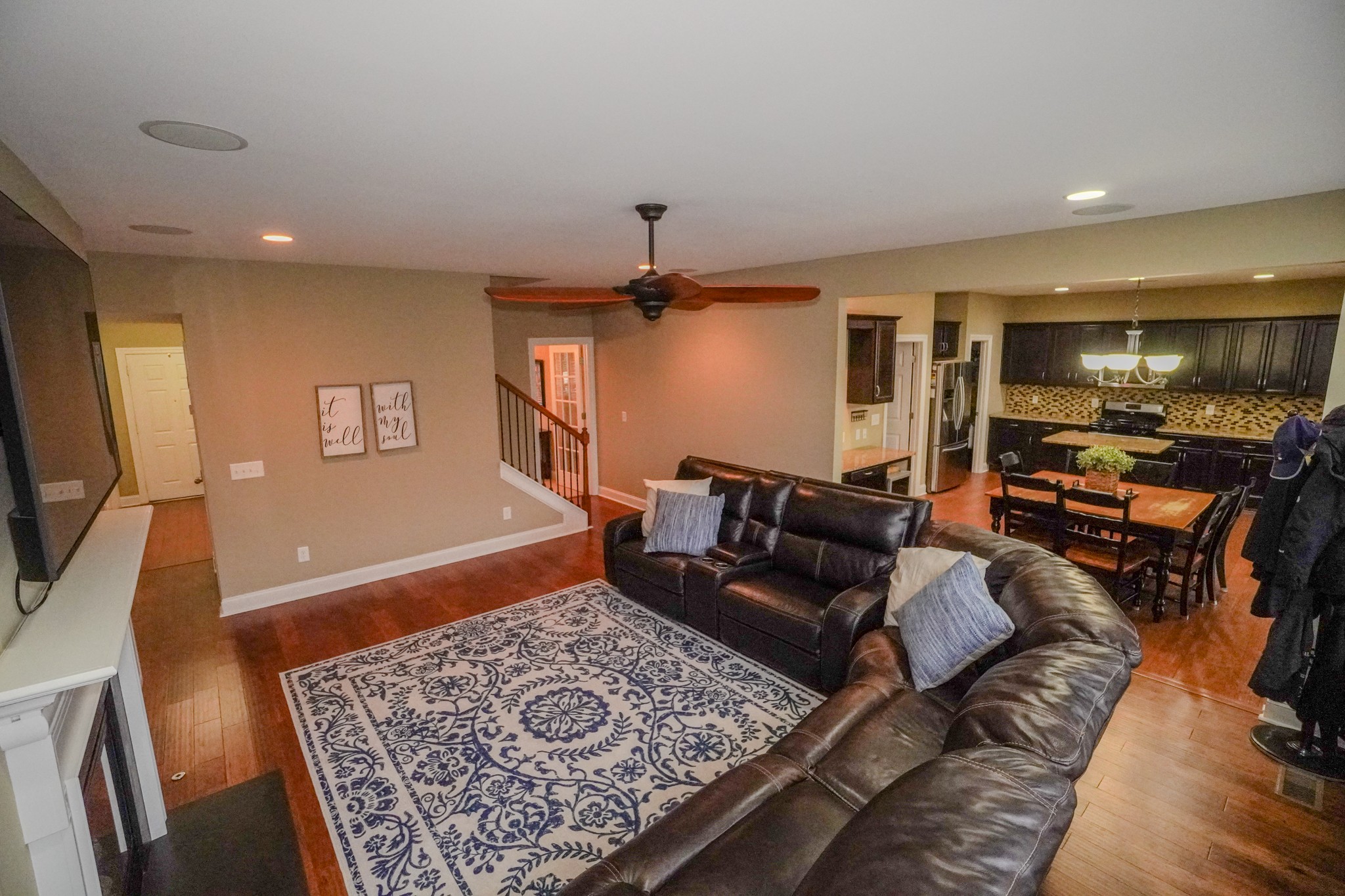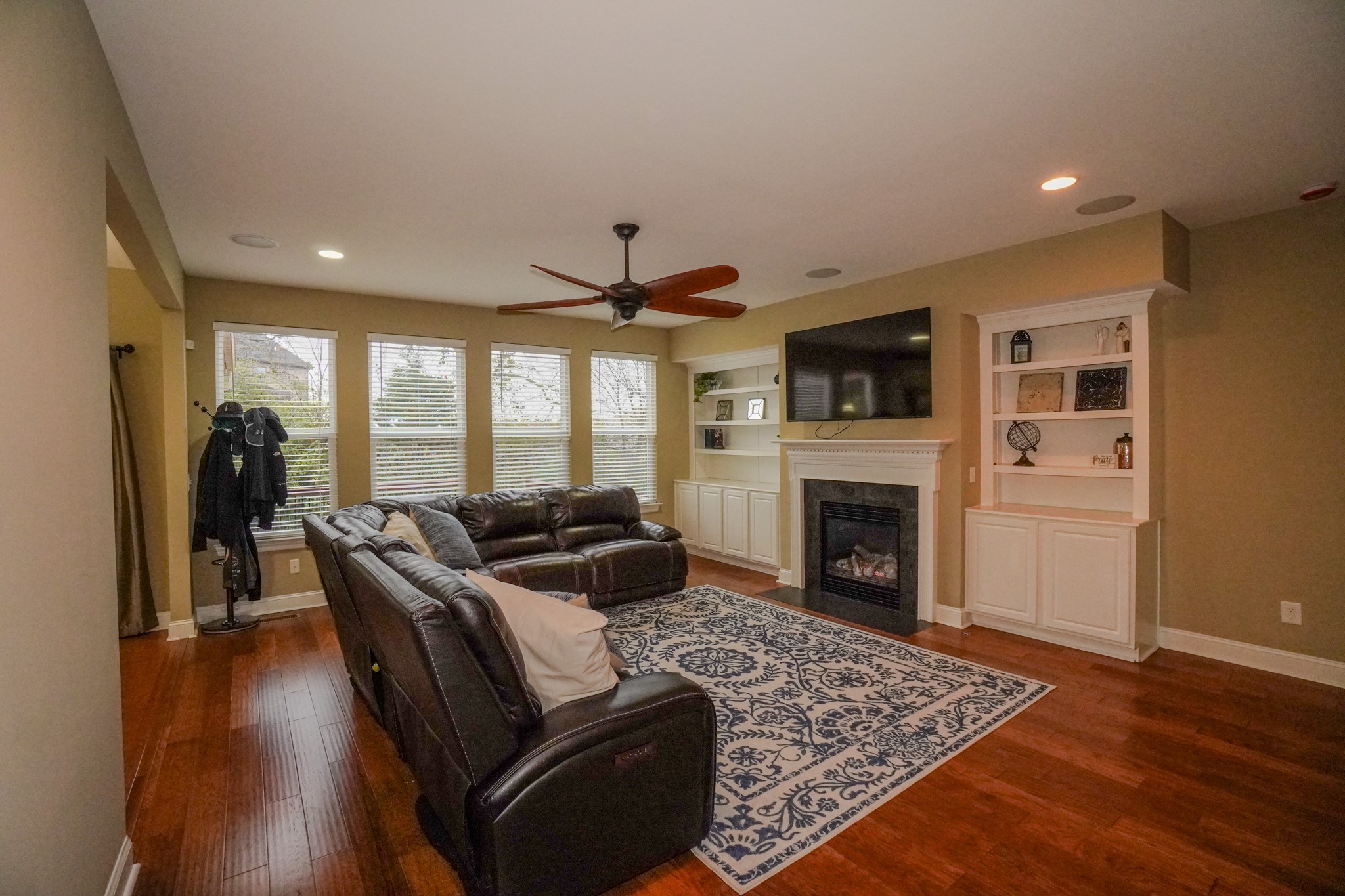 The open kitchen flows into the den and showcases granite countertops, a large island, stainless steel appliances, gas cooktop, tile backsplash, and a massive pantry. The living area features a cozy gas fireplace with logs. You’ll love the hardwood and tile floors, surround sound, newer roof and HVAC units, and true move-in-ready condition.