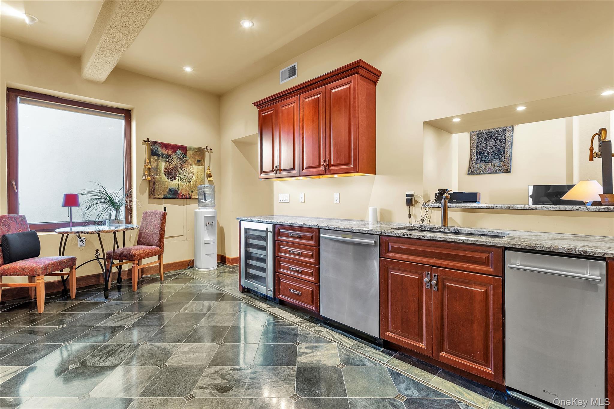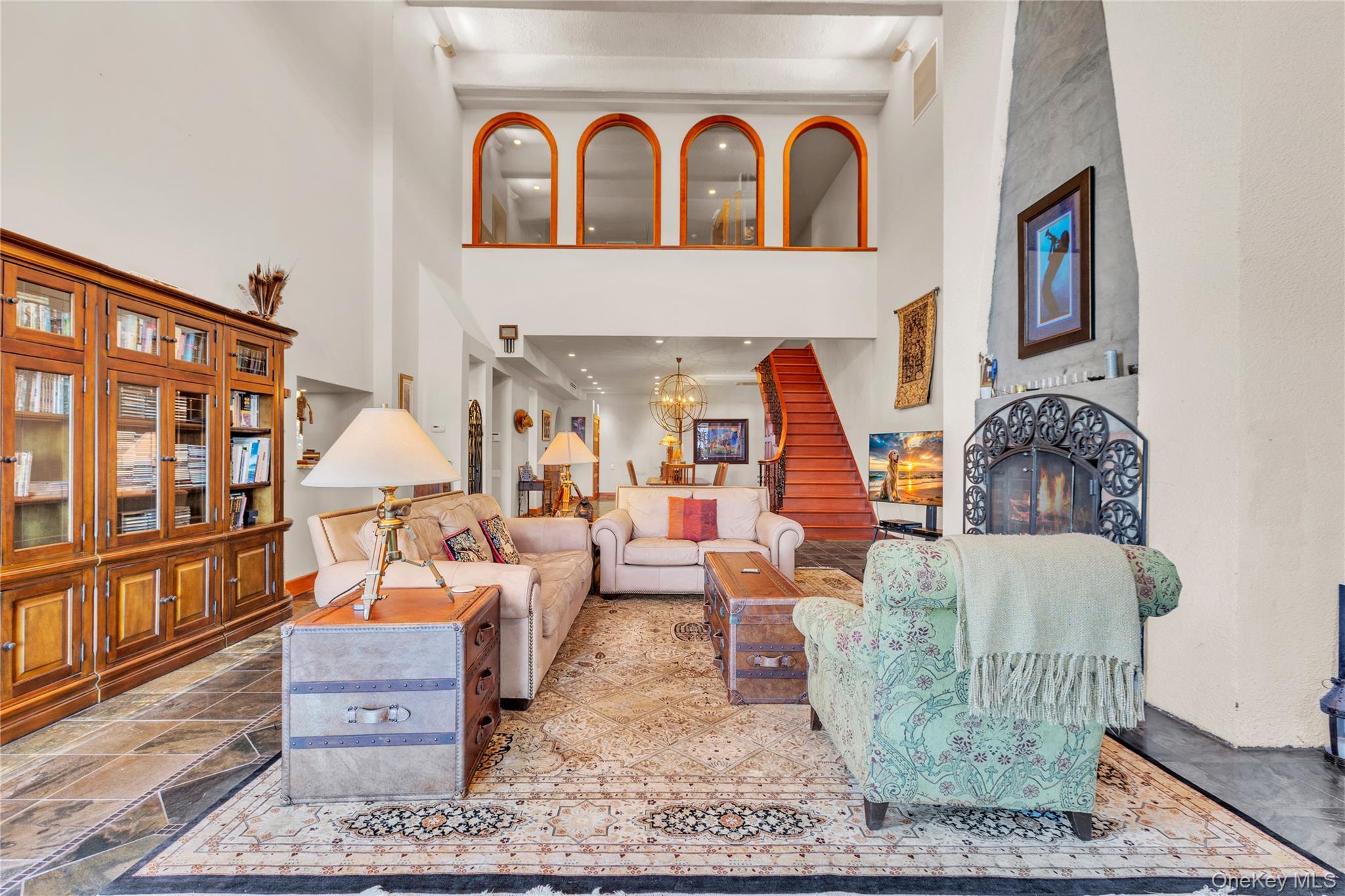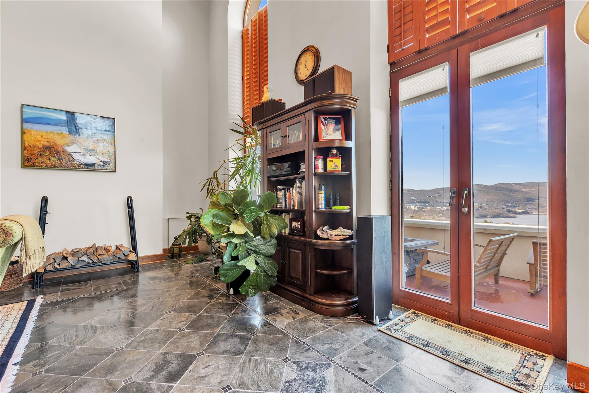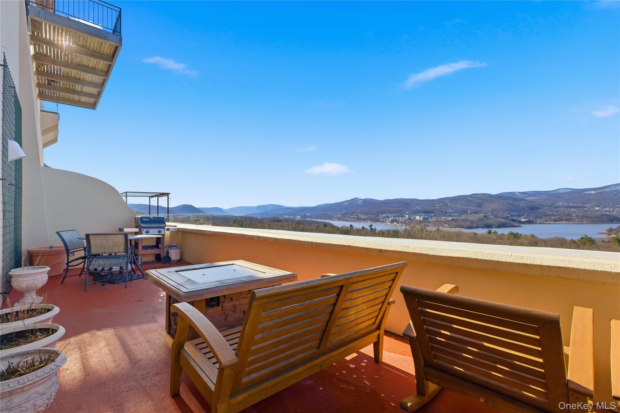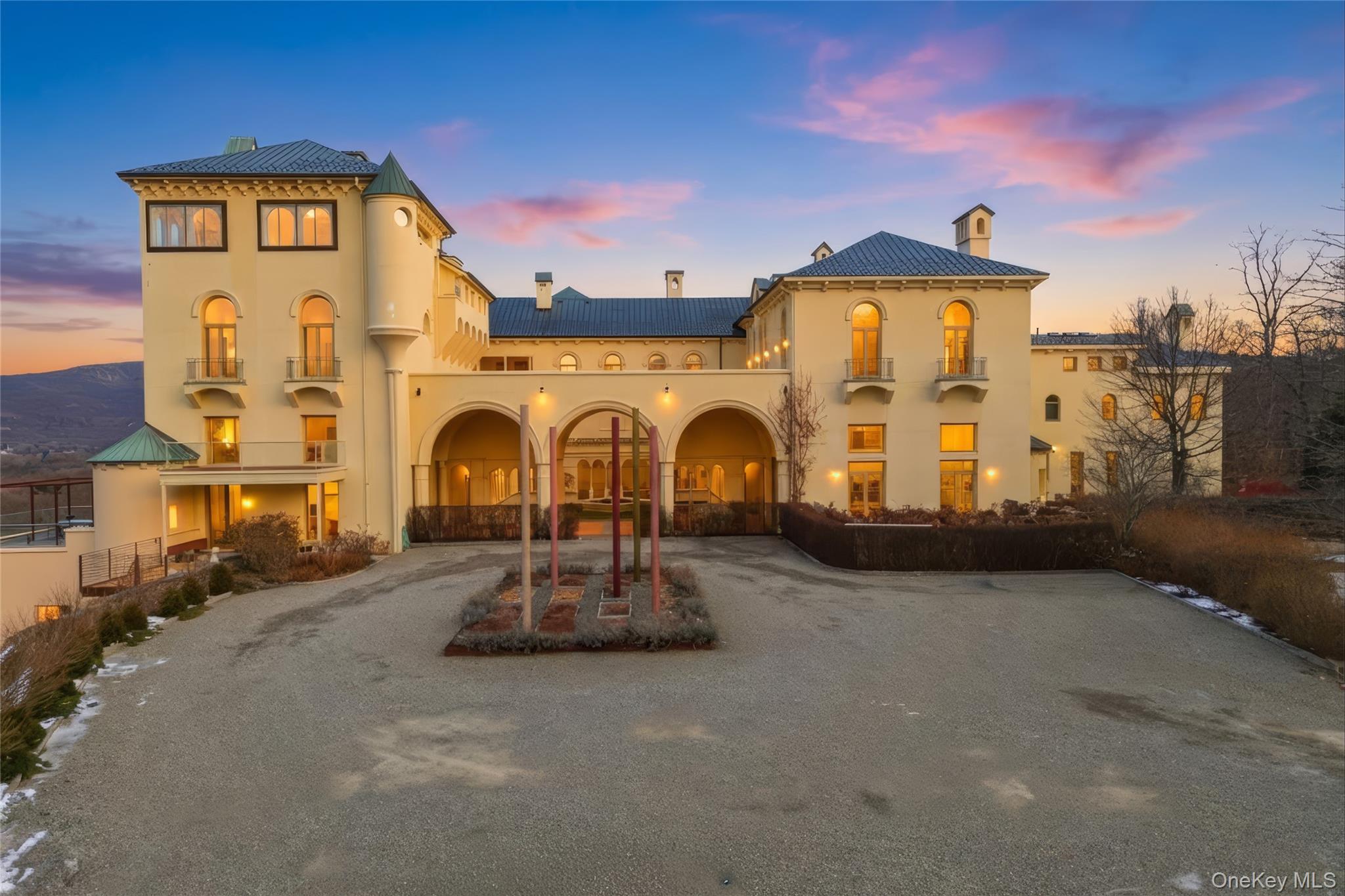 Rising above the Hudson Highlands with commanding views and unmistakable stone architecture, Dicks Castle remains one of the region’s most recognizable and storied landmarks. A Moorish style castle fashioned after Alhambra in Granada, Spain and situated on 26 wooded acres, the exterior features turrets, arches and courtyards surrounded by sculptures and stone walls well over 100 years old. This residence offers an exceptionally rare opportunity: the ability to live inside a piece of Garrison history while enjoying space, privacy, and the contemporary comforts expected of a modern luxury home. This particular home is unlike any other in the castle. At approximately 2,700 square feet, it is the only unit with three full bedrooms and three full baths, a distinction that sets it apart immediately. The interior design elevates the castle’s character with thoughtful updates-tile floors from India with radiant heat, soaring volumes of space, and a layout that blends openness with intimate architectural moments. The heart of the home is a dramatic great room anchored by a fully functional Reynard fireplace and framed by 23-foot ceilings. From this vantage point, two floor-to-ceiling doors and windows open to sweeping panoramas of the Hudson River Valley and the lights of the United States Military Academy at West Point. Few homes in the Hudson Valley offer a view with this level of scale, continuity, and emotional impact. The primary bedroom suite looks out over the great room, giving it a lofted sense of retreat while maintaining connection to the architecture and the views beyond. Two additional bedrooms are generously sized, each appointed with Jacuzzi bathtubs, making them ideal for guests or extended-stay. Every room is positioned to take advantage of natural light and the castle’s unique lines. The floor plan supports both quiet day-to-day living and sophisticated entertaining, with thoughtful storage, a calm material palette, and an overall feeling of permanence that only legacy structures can provide. Exterior living is equally compelling. A private deck extends the living space outdoors, complete with a propane-fueled fire box — perfect for warm evenings under the stars, watching river traffic drift below or the night-time glow of West Point across the valley.There is no other property like this. Inventory within Dicks Castle is scarce, and homes with this scale, bedroom count, and vantage point are almost never available. For buyers who want something that stands apart — architecturally, historically, and emotionally — this is a chance to own a singular residence in one of the Hudson Valley’s most iconic landmarks.