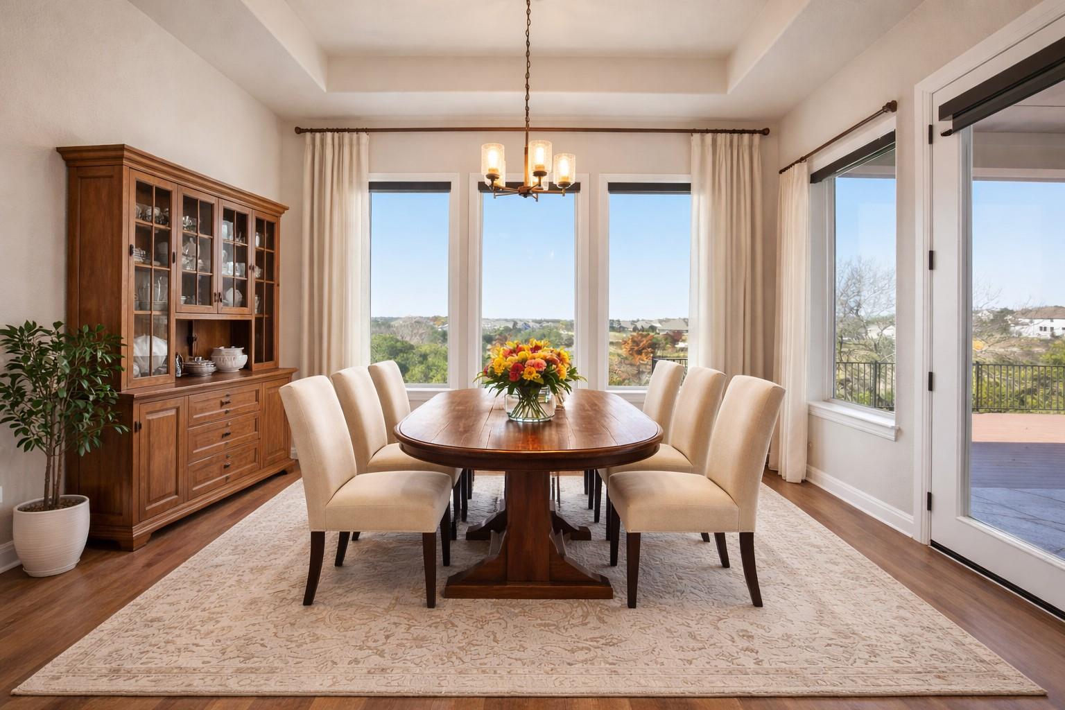 NOW $800,000 - Exceptional Hill Country Golf Course VIEWS!!! Home is East Facing for a beautiful morning exposure! Set against breathtaking Hill Country and greenbelt views, 1441 River Vista offers rare privacy, expansive outdoor living, and thoughtful upgrades throughout. Enjoy serene vistas from the rear deck, just minutes from shopping, dining, and downtown Georgetown. Homes with this level of view and care rarely become available in Wolf Ranch. This beautifully maintained home features four bedrooms, with three located on the main level, including two private en-suite bedrooms ideal for guests or multigenerational living. The fourth bedroom upstairs includes a hall bath, while the third main-level bedroom is served by a hall bath, offering flexibility and privacy. The home offers two living areas plus a dedicated study. The main living area features a gas fireplace with a custom fireplace door and opens seamlessly to the kitchen and dining area—perfect for entertaining. Double doors lead to a spacious study, ideal for a home office or quiet retreat. The dining area is positioned to capture stunning views, creating a memorable setting for everyday meals and special occasions. Interior finishes include acacia wood flooring in the main living spaces, granite countertops, and custom plantation shutters installed throughout the home. Motorized blinds in the family and dining rooms, UV-protective window film on upper foyer windows, and a new microwave with a Bosch dishwasher. Outdoor living is exceptional, featuring a custom oversized wraparound Trex rear deck with raised planter beds and privacy walls, plumbed with natural gas for a future outdoor kitchen. The gently sloped backyard offers ample space for a pool, fire pit, or expanded entertaining area, all with complete privacy and greenbelt views. Additional features include a whole-house water softener with reverse osmosis, stained and sealed garage floors, and other upgraded features.