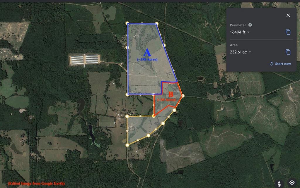 A rare find for east Texas property of its size. This is beautiful rolling land, comprised of some wooded area, but about 75% pasture acreage that is currently serving as the ranch home of a livestock operation raising bison and cattle. The property has premium fencing of 6 ft high, 6 strand wire surrounding the external boundary, and similar internal fencing separating pastures. It encompasses the northern 158 acres (designated as A in the first aerial photo) of a 232 acre plat, which will be divided at closing. The owner is willing to sell an additional 34 acres (designated as B in the first aerial photo), but only in conjunction with the sale of the offered 158 A acreage. The 34 acres are improved with a building site containing access to city water, electric, propane hookup, and septic. It also has the aforementioned external fencing, is cross fenced, has a large set of pipe fenced working corrals, and a loafing shed. A cattle or bison squeeze chute is also available.
