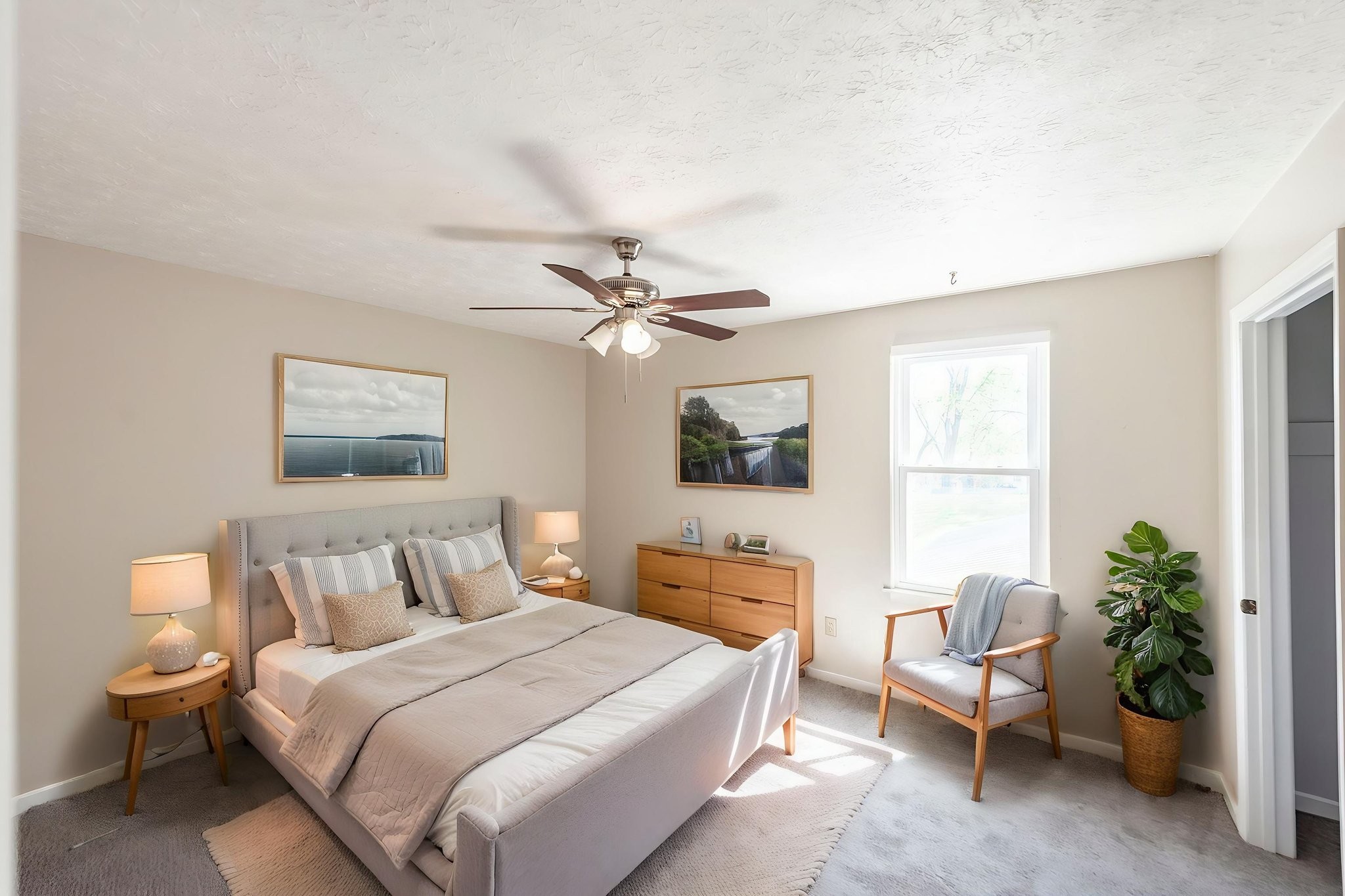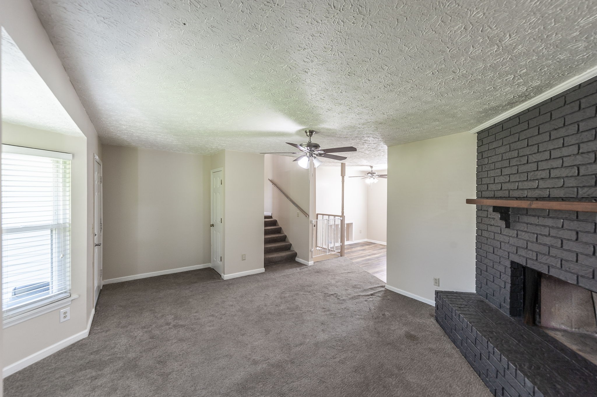 Inside, you’ll find a warm and welcoming living room featuring a cozy wood-burning fireplace. The eat-in kitchen offers plenty of room for dining, while large windows throughout the home provide an abundance of natural light.