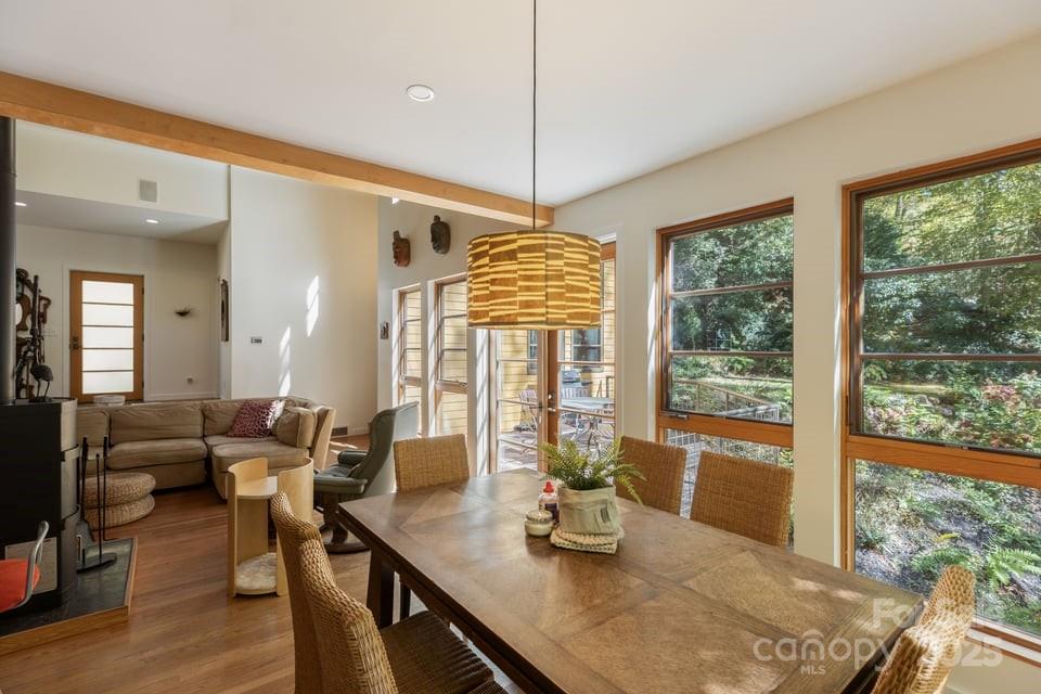 The home’s inviting exterior features open and screened porches designed to capture unobstructed views of the creek, where mornings begin with birdsong and evenings end with the peaceful rhythm of the water. Inside, a welcoming great room centers around a woodstove that adds warmth and ambiance on cool mountain nights. Hardwood floors run throughout the main living areas and bedrooms, while natural light enhances the warm wood tones and open flow of the space.