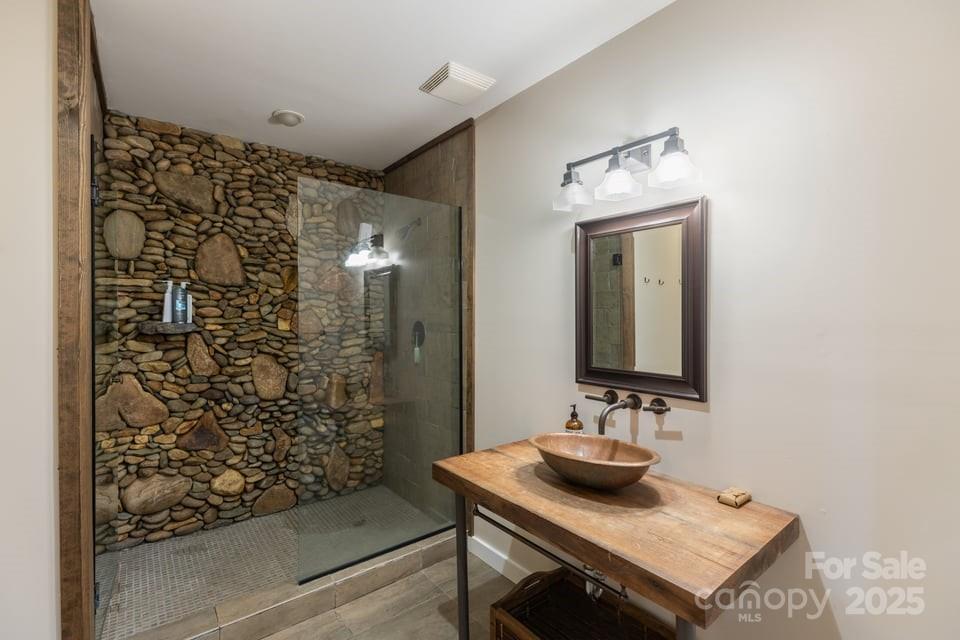 The entire lower level is dedicated to the primary suite, creating a private retreat designed for relaxation and renewal. A gas stone fireplace adds cozy comfort, while the ensuite bath features a river stone walk-in shower that blends natural beauty with modern design. The screened porch off the primary suite overlooks Buck Creek and offers direct access to the lower-level open deck and stone patio, perfect for enjoying the sights and sounds of the water.