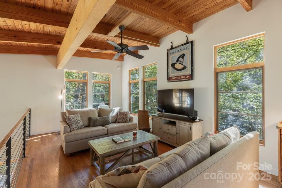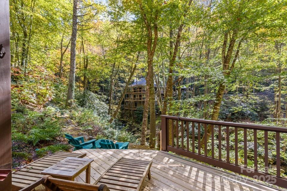 Upstairs, a spacious open loft serves as a quiet sitting area or home office—ideal for reading, creative pursuits, or remote work—all while offering a bird’s-eye view of the surrounding forest and the soothing sound of Buck Creek below.