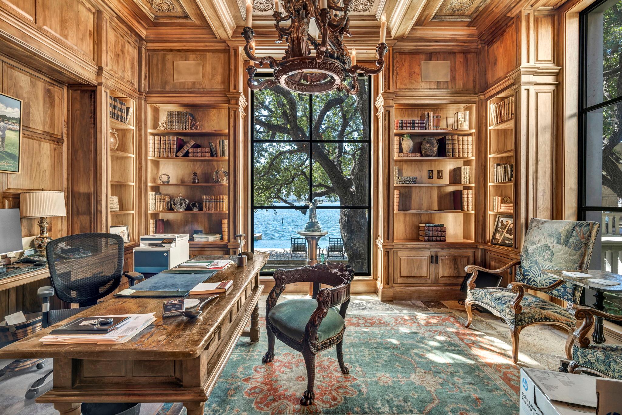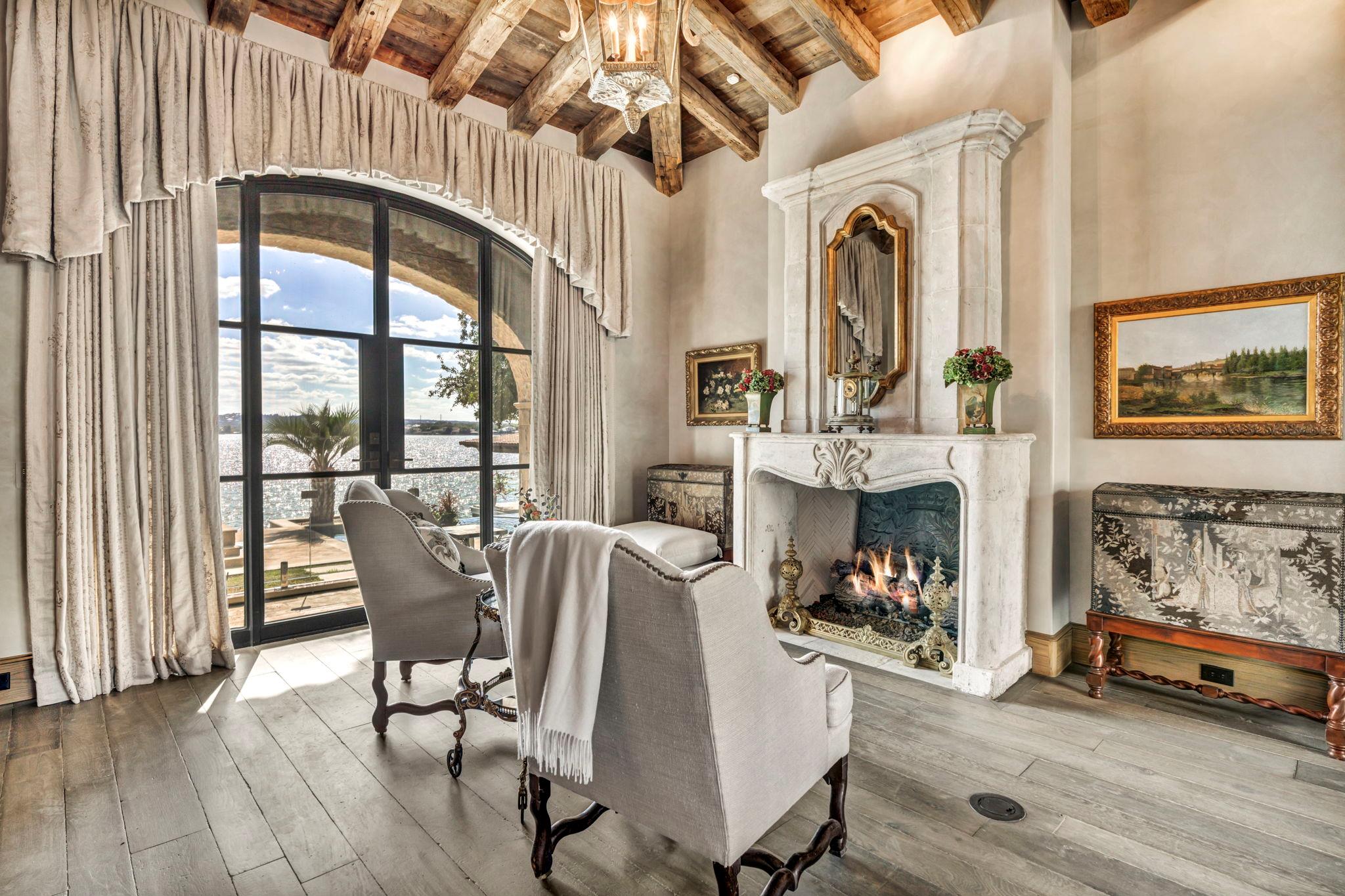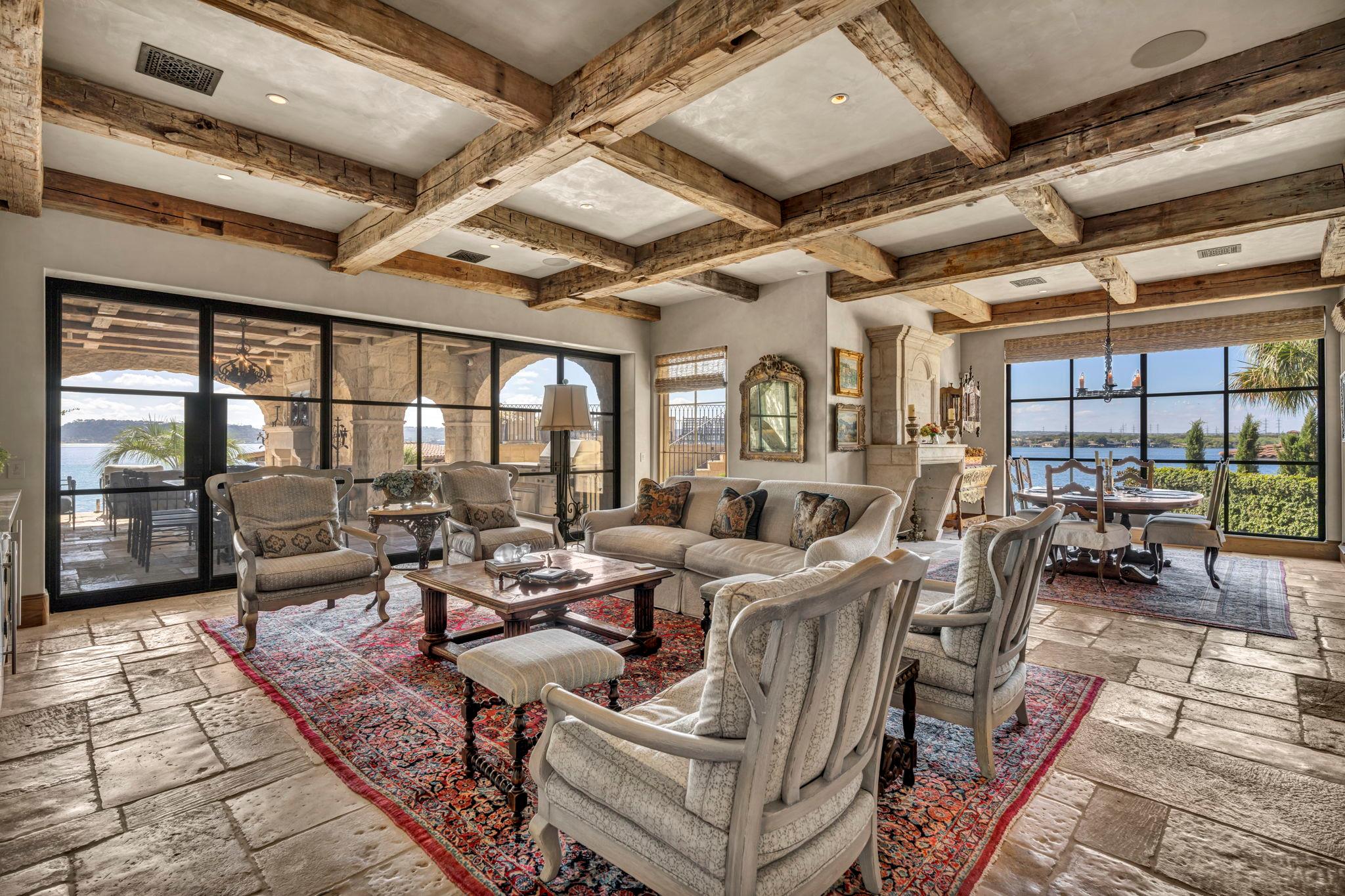 Grandeur and simplicity describe this Spanish Colonial-style lake home in the heart of the Texas Hill Country. Perfectly situated on two lots in the middle of the coveted Lighthouse Drive peninsula in Horseshoe Bay, this waterfront estate boasts a lake view in every direction. Exterior walls are constructed of solid, hand-cut limestone blocks, creating a majestic presence that is carried into the great rooms of the home. Timeless luxury exudes from the elegant key-stoned archways which lead through the interior and exterior living spaces, blending the beauty of the Central Texas landscape into every room. The classic steel and glass doors and windows enhance the indoor/outdoor feel of this spectacular lakefront estate. Venetian plaster walls and reclaimed wood ceiling beams add a rustic sophistication. A suite of antique carved 17th century doors, reclaimed ceiling beams, antique French limestone floors and French Oakwood floors are a few of the bespoke architectural elements that complete the masterpiece of 419 Lighthouse Drive.