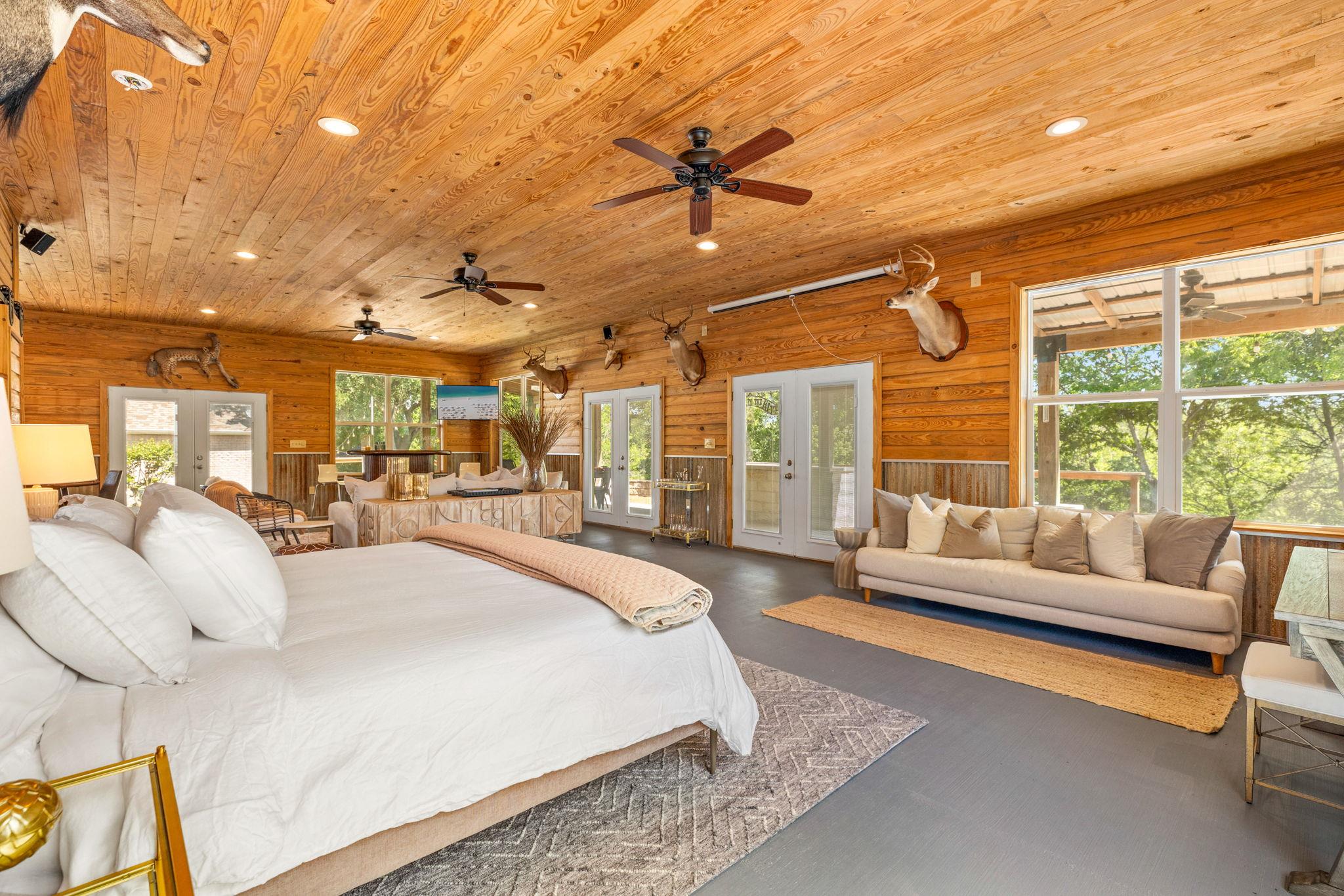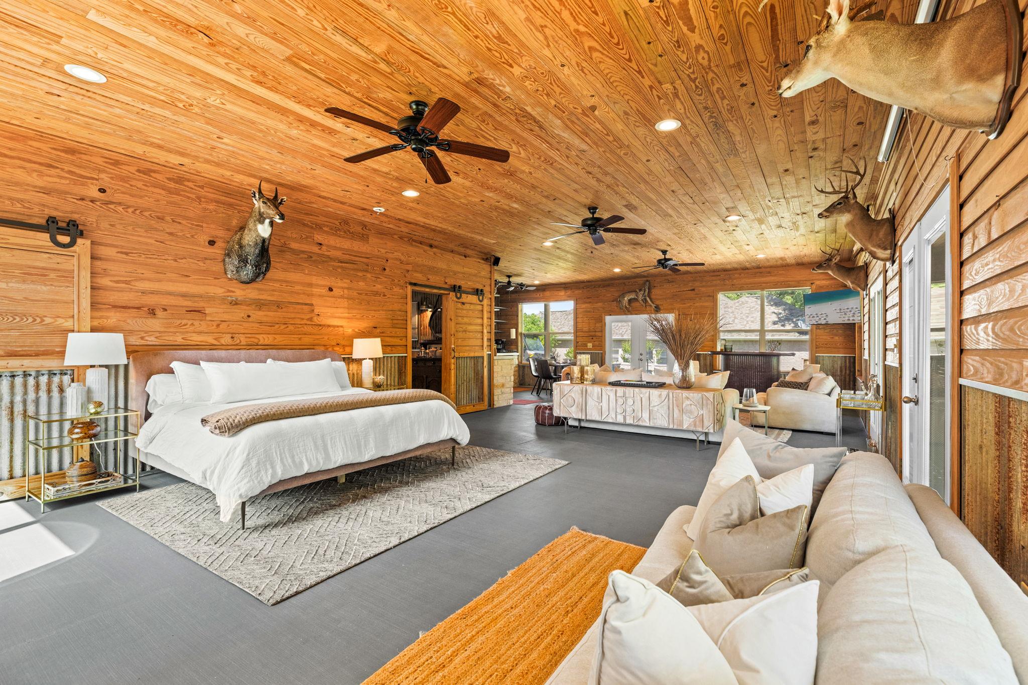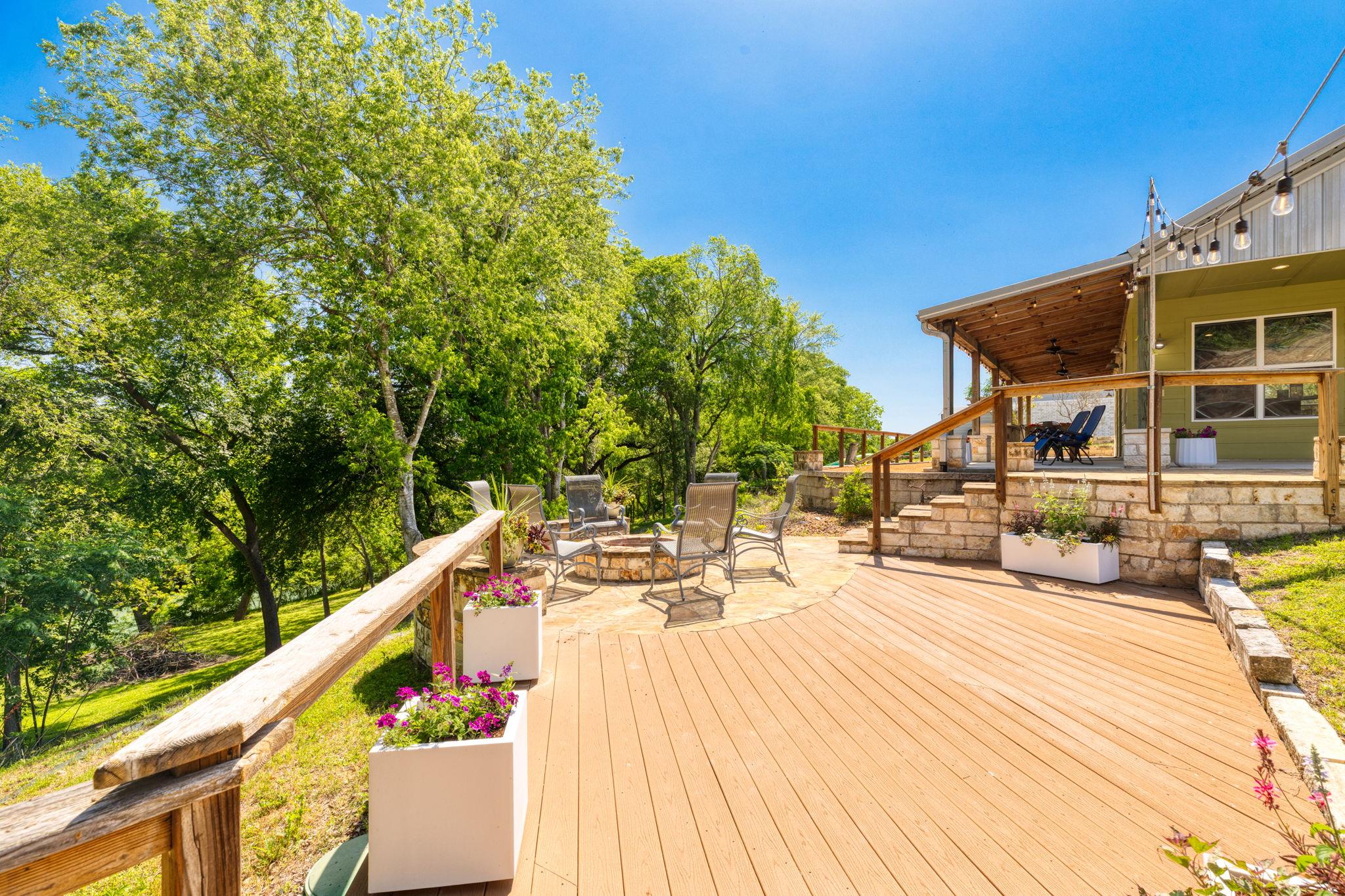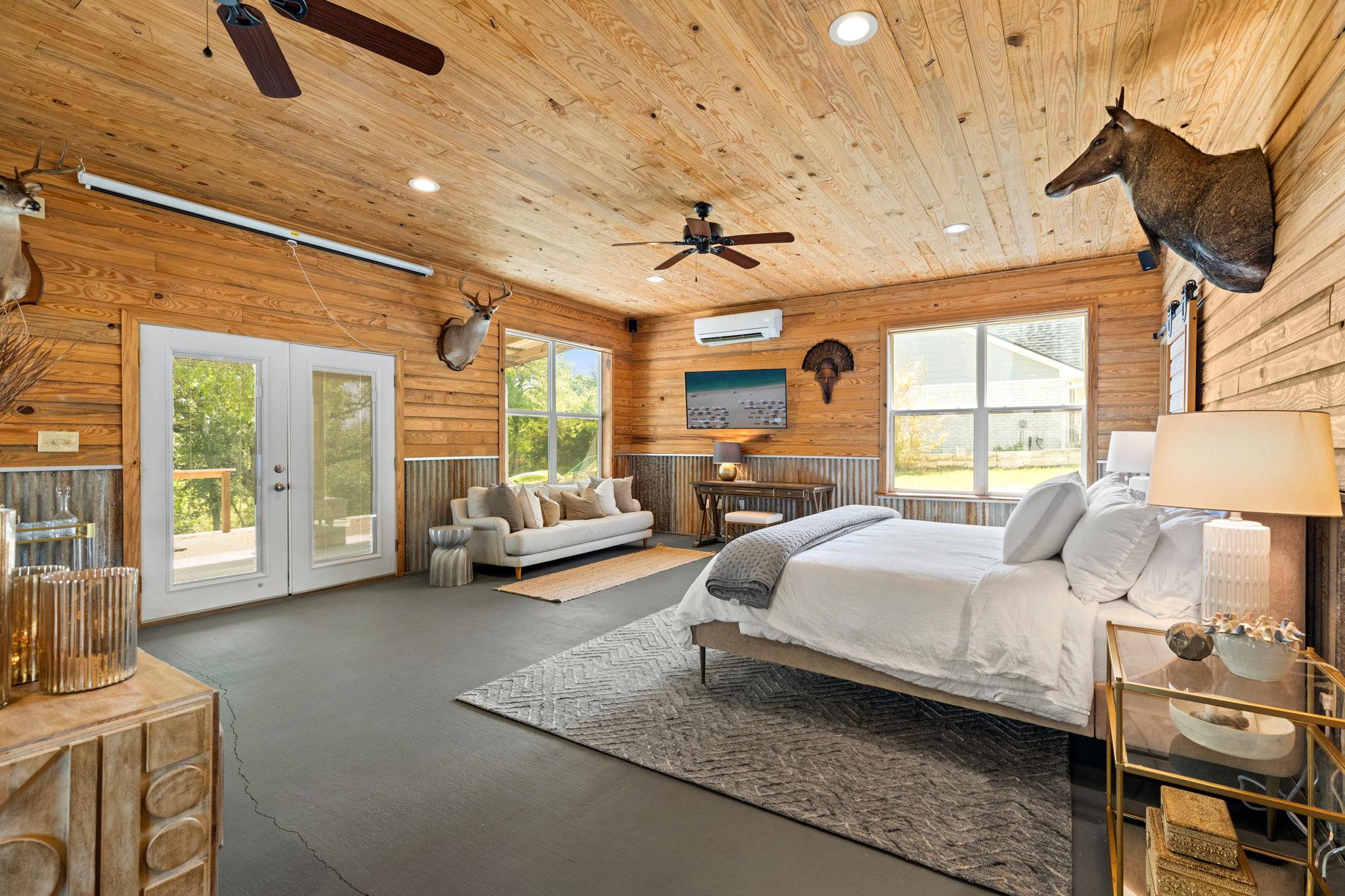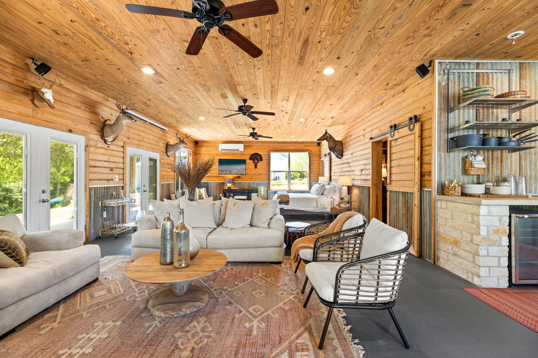 Nestled along the serene San Marcos River in Kingsbury, TX, this 1.44-acre retreat offers 190’ of pristine river frontage, two beautifully crafted homes, and a peaceful setting beneath mature oaks and pecans. The main home features an open-concept layout with high ceilings, neutral tones, and a chef’s kitchen with custom cabinetry, Silestone counters, large island, and designer lighting. A spacious pantry and breakfast nook overlook the river, while the living room is anchored by a custom electric fireplace. The primary suite offers stunning river views, a spa-like ensuite with steam shower, dual vanities, makeup station, LED mirrors, custom cabinetry, and a large walk-in closet. Two guest bedrooms in a split layout share a stylish bath. Thoughtful upgrades include dimmable lighting, a spacious laundry room, two-car garage, and paved drive. The 1,200 sq ft “Party Barn” features a full kitchen with stainless appliances, concrete counters, vaulted ceiling, and full bath with antique vanity—ideal as a guest house, rental, or entertainment space. French doors lead to a wrap-around porch beneath shady trees. Outside, a large deck overlooks the river, and boulders form a natural path to the water with shallow and deep areas perfect for swimming, kayaking, and relaxing. Not in a floodplain! Wildlife abounds, from deer and birds to fireflies and butterflies. With endless potential as a short-term rental, multi-gen home, or personal escape—and just a short drive to Austin, San Antonio, I-10, 130 Toll & I-35—this move-in ready property is a rare riverfront gem.