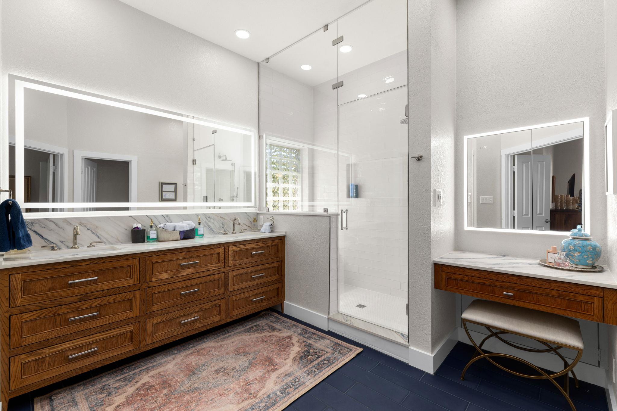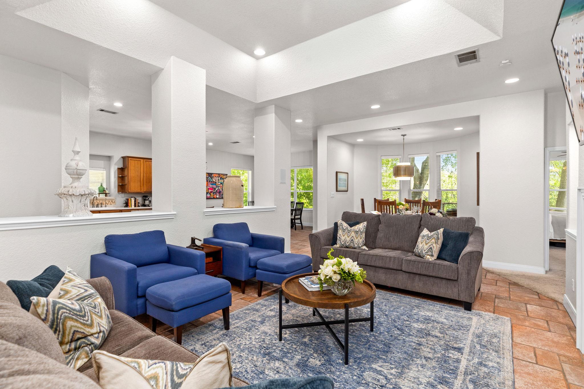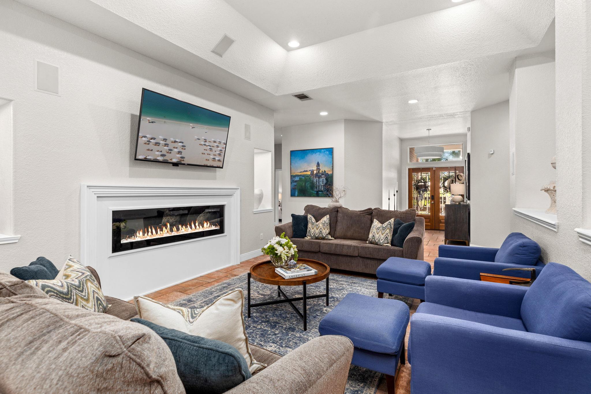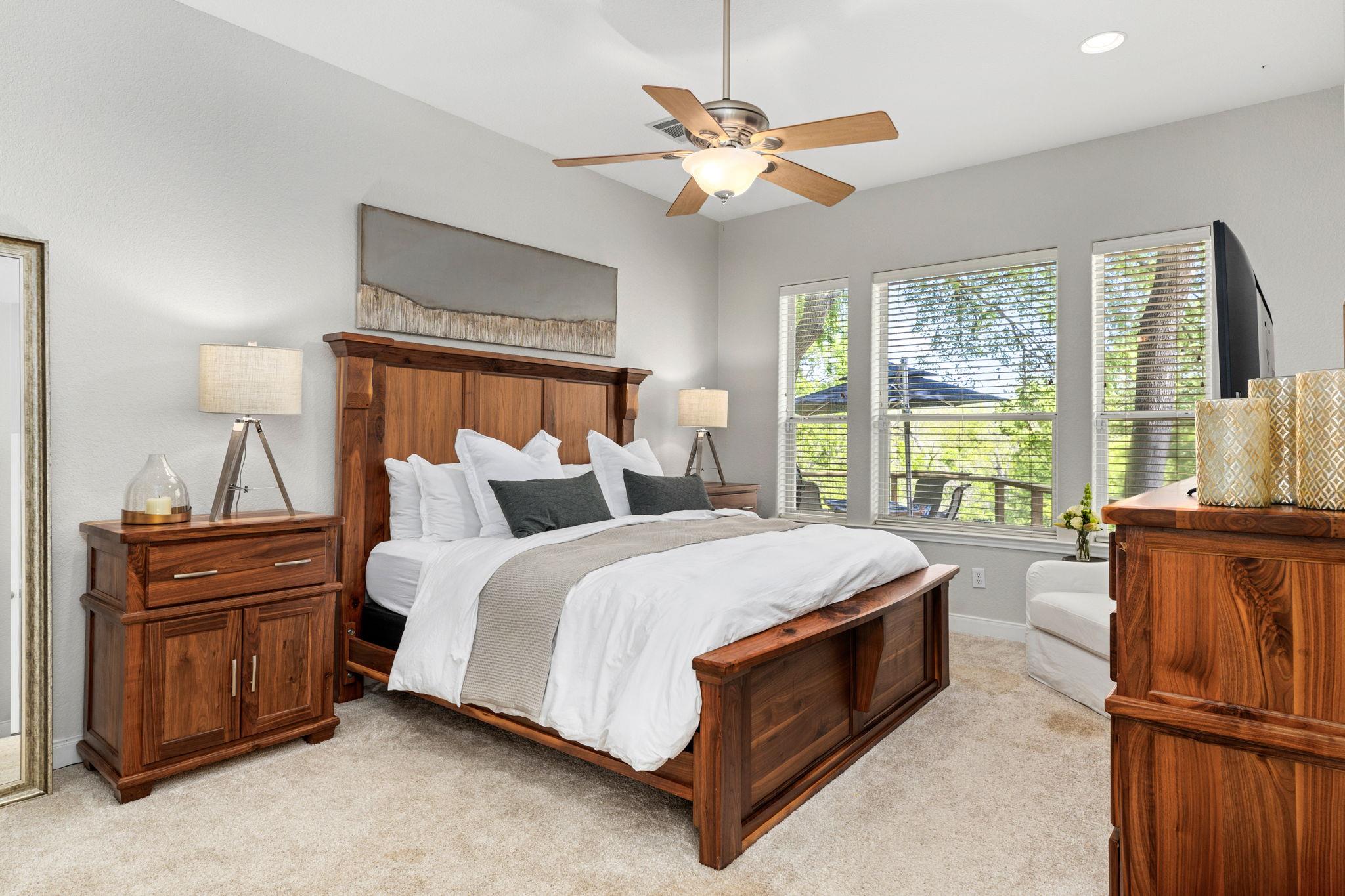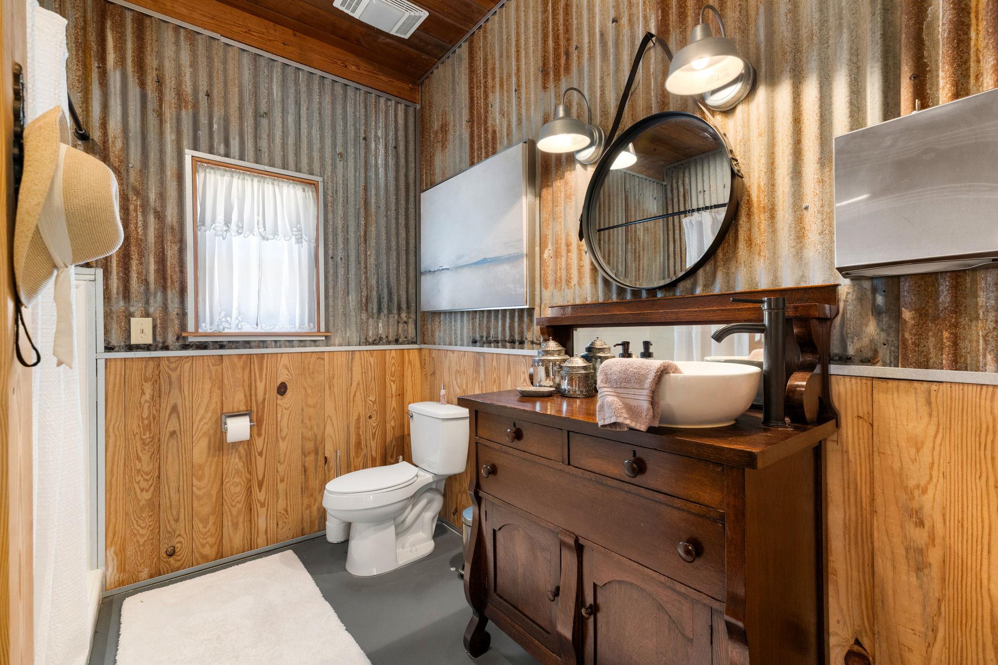 Nestled along the serene San Marcos River in Kingsbury, TX, this 1.44-acre retreat offers 190’ of pristine river frontage, two beautifully crafted homes, and a peaceful setting beneath mature oaks and pecans. The main home features an open-concept layout with high ceilings, neutral tones, and a chef’s kitchen with custom cabinetry, Silestone counters, large island, and designer lighting. A spacious pantry and breakfast nook overlook the river, while the living room is anchored by a custom electric fireplace. The primary suite offers stunning river views, a spa-like ensuite with steam shower, dual vanities, makeup station, LED mirrors, custom cabinetry, and a large walk-in closet. Two guest bedrooms in a split layout share a stylish bath. Thoughtful upgrades include dimmable lighting, a spacious laundry room, two-car garage, and paved drive. The 1,200 sq ft “Party Barn” features a full kitchen with stainless appliances, concrete counters, vaulted ceiling, and full bath with antique vanity—ideal as a guest house, rental, or entertainment space. French doors lead to a wrap-around porch beneath shady trees. Outside, a large deck overlooks the river, and boulders form a natural path to the water with shallow and deep areas perfect for swimming, kayaking, and relaxing. Not in a floodplain! Wildlife abounds, from deer and birds to fireflies and butterflies. With endless potential as a short-term rental, multi-gen home, or personal escape—and just a short drive to Austin, San Antonio, I-10, 130 Toll & I-35—this move-in ready property is a rare riverfront gem.
