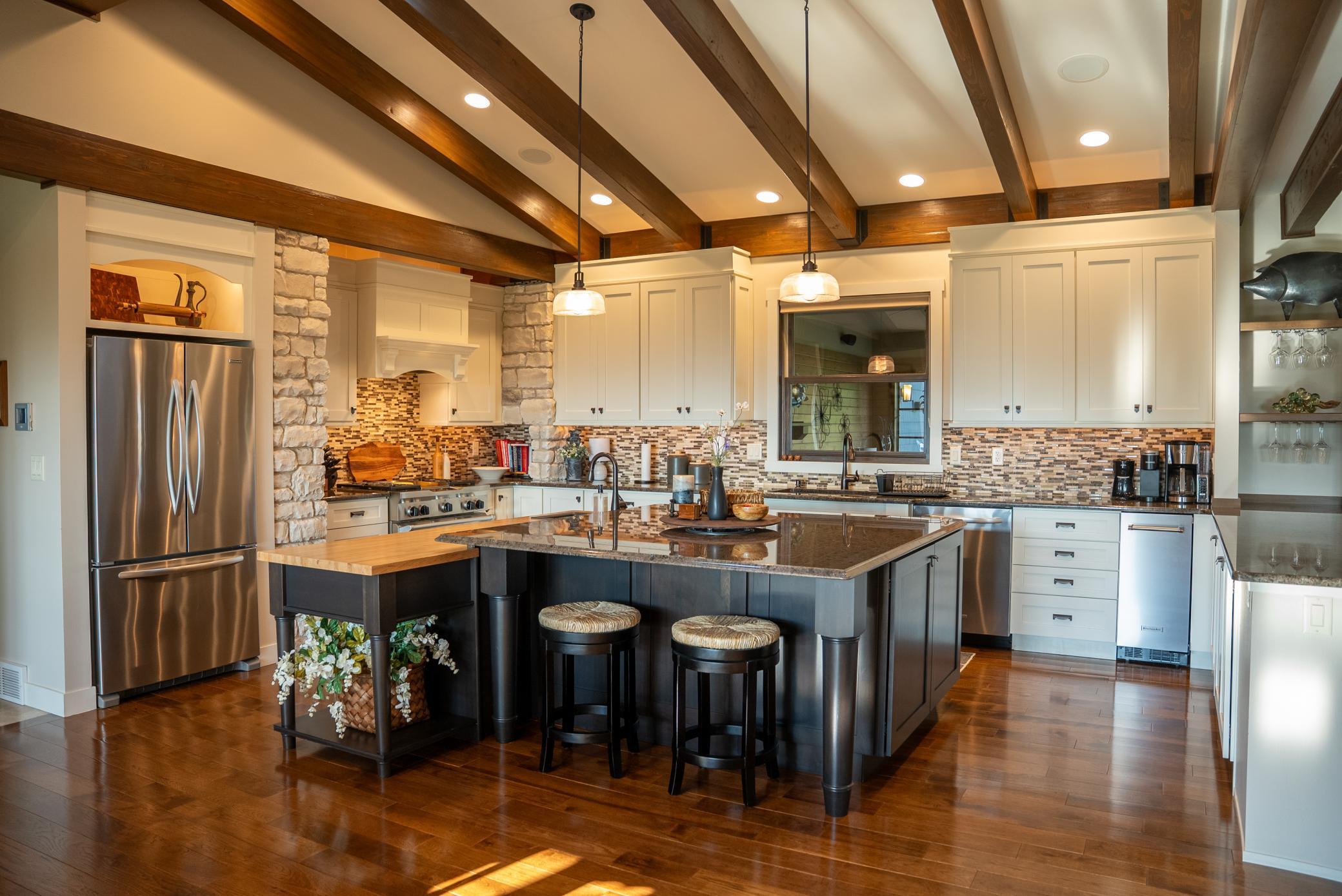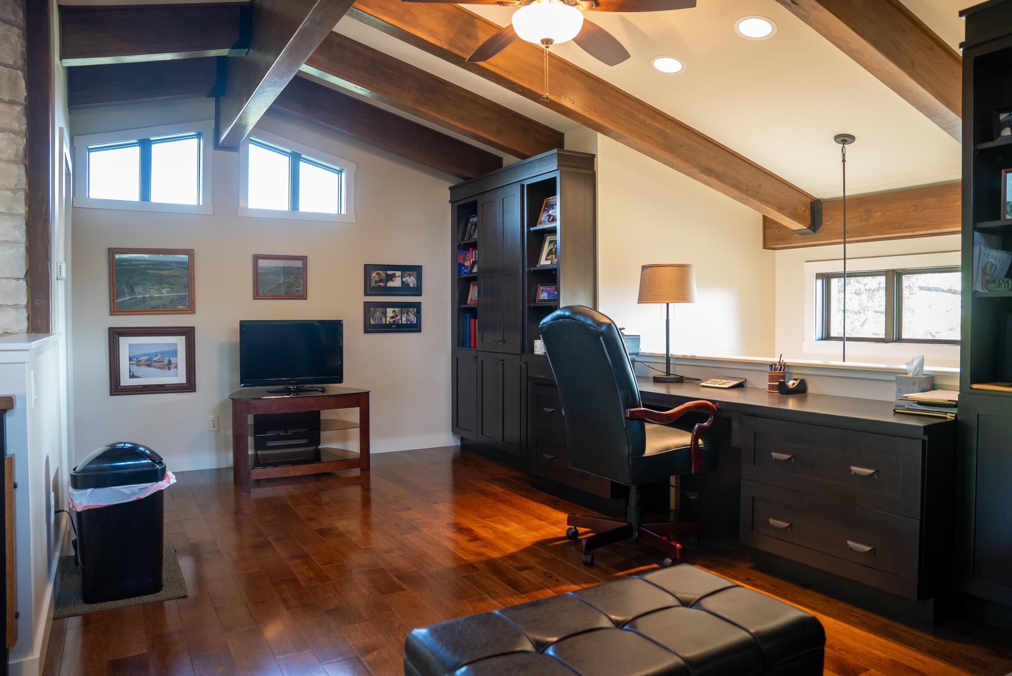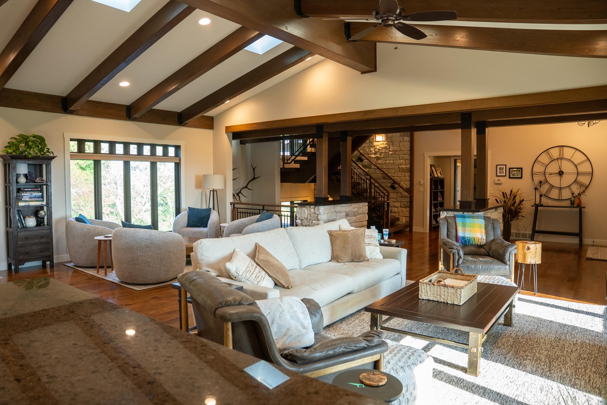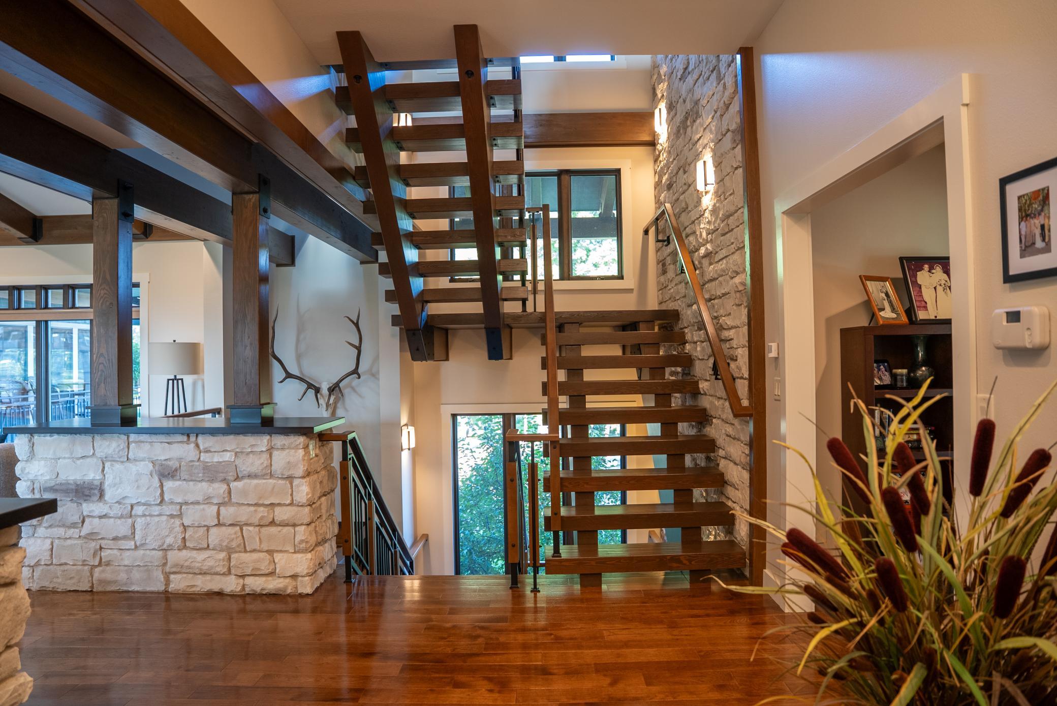 The main floor of the home has expansive windows that showcase the view from the ridgetop to the Mississippi River and Lake Onalaska below. The stone and beam work is both inside and outside of the home. The main floor is nothing short of a retreat with tile floors, ¾” hickory floors, granite countertops throughout the home, in the chef’s kitchen you will find an large island and butcher block top, prep sink, stand along icemaker, high-end appliances, custom cabinetry throughout the entire house, large main floor laundry and walk-in pantry, Spa like owner’s suite on the main level with heated tile floors in the owner’s private bath. The 3-story staircase is a stunning piece of work and a point of conversation. The owner’s private loft office features a built-in desk with a jaw dropping view for miles. In the lower level of the home you will find 3 bedrooms plus another room with egress but without a closet that could be used for an office, workout room or bonus room.