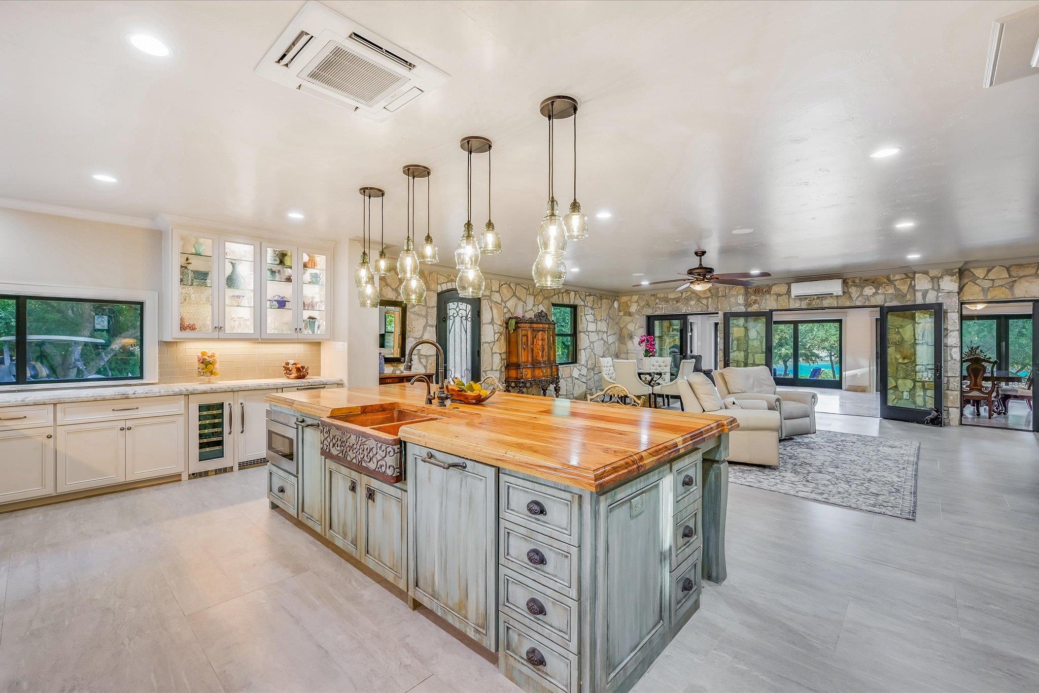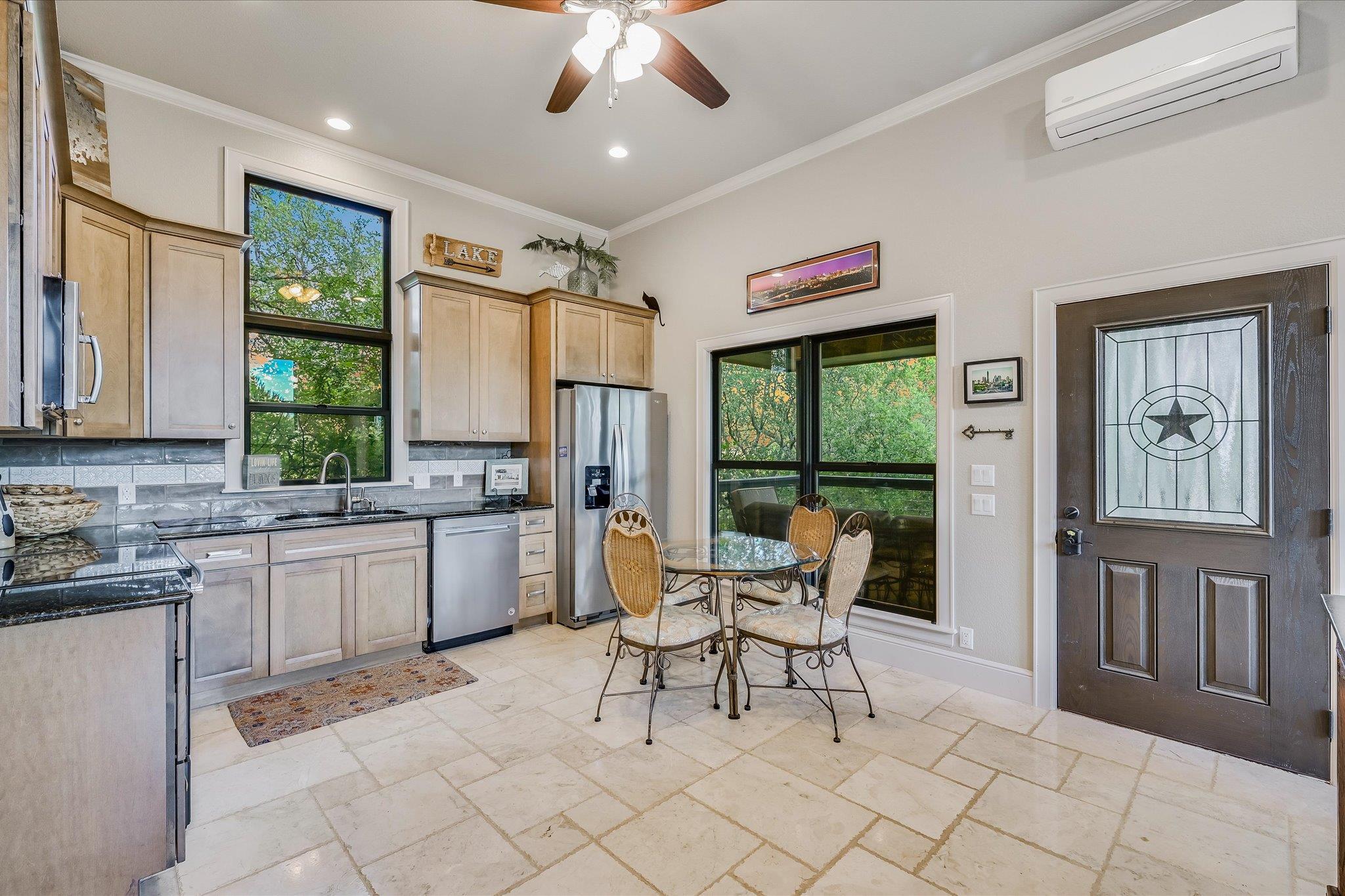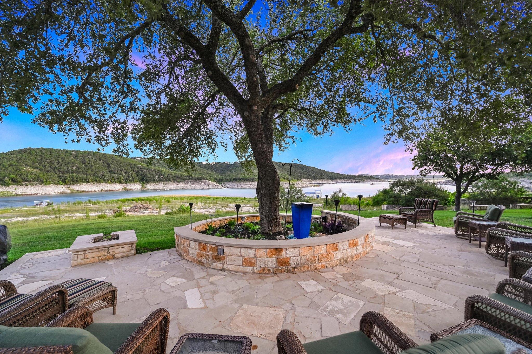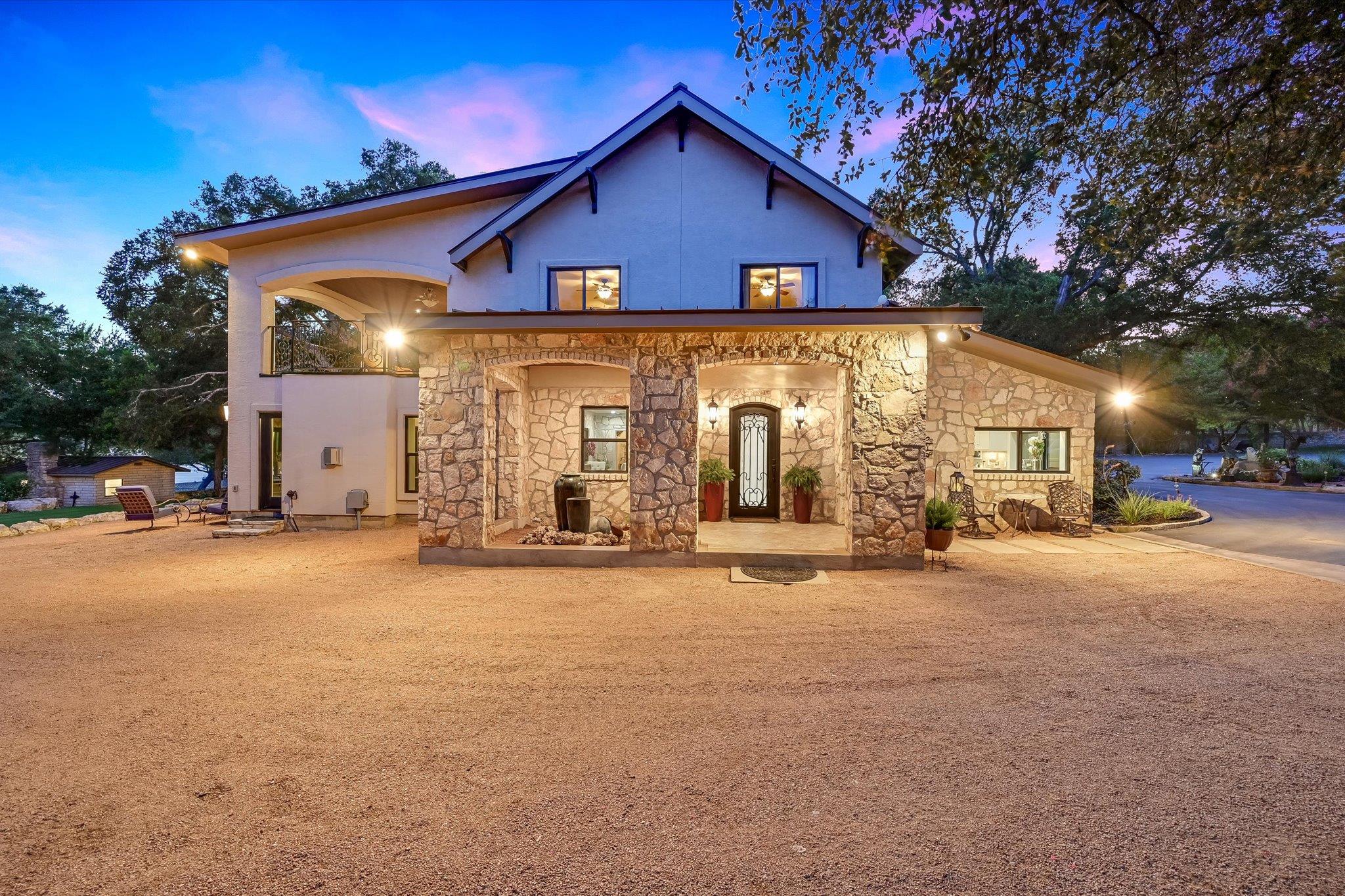 CONTACT AGENT #2: Josh/512-845-5423 for a showing or questions. A rare opportunity to acquire one of the most distinctive waterfront estates on Lake Travis. Set on 2.26 landscaped acres with a gradual slope to deep water and 222 feet of private shoreline, this multi-structure compound was designed for generational living, elevated entertaining, and lasting legacy. The primary residence spans 3,387 square feet (3 bedrooms, 2.1 bathrooms) and features refined Hill Country architecture, expansive window walls, and seamless transitions between indoor and outdoor living spaces. Views stretch across the lake from nearly every vantage point, with upper balconies and covered patios positioned to capture morning light and sunset color. In addition to the main home, the property includes two 724 sf guest houses, both with full kitchens (4 bedrooms, 2 full baths), a 238 sf casita with kitchenette (1 bed, 1 full bathroom), and a 225 sf studio/salon — each thoughtfully sited and privately accessed. Whether hosting extended family, providing long-term accommodations, or creating dedicated workspaces, the layout offers exceptional versatility with no compromise in design or privacy. As you enter through the beautiful stone and large privacy gate - the grounds are curated, not just maintained — mature oaks, manicured lawns, and native stone pathways lead to multiple gathering areas, including a firepit lounge and waterfront viewing decks. A short walk or golf cart drive to the private boat dock down the gradual slope to your private dock and covered boat slip with HydroHoist completes the experience. Don't miss this amazing opportunity to own one of the rarest properties on Lake Travis. With a enough yard space to add your own private pool/spa (rendering available) and driveway space to expand the garage to accommodate up to 4 car garage - this property is a true must see to believe. A true hidden oasis on Lake Travis!