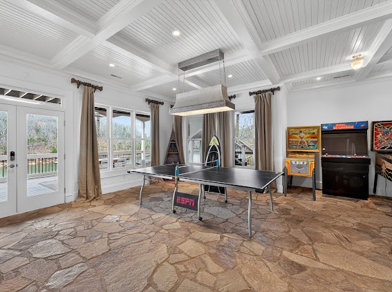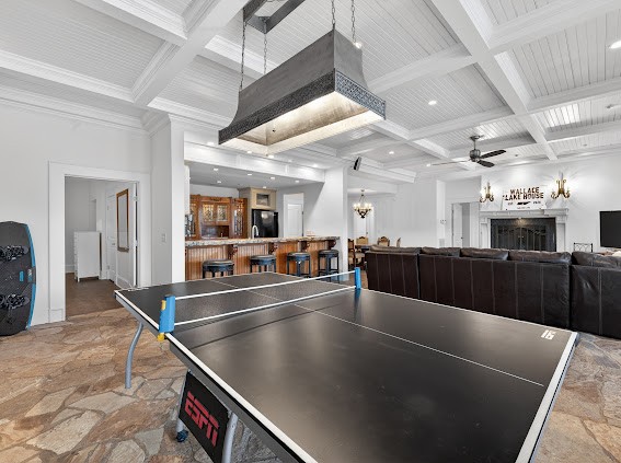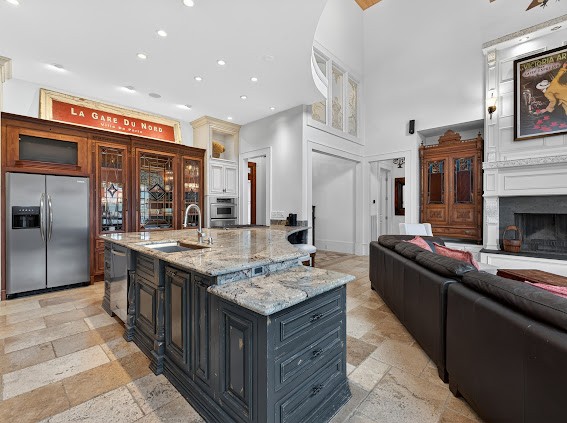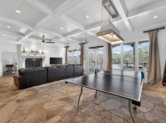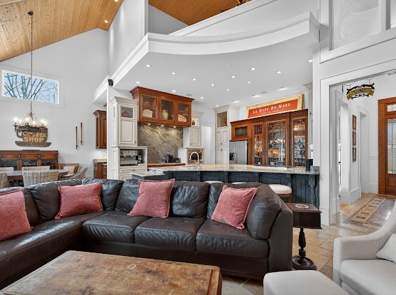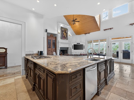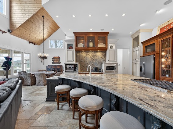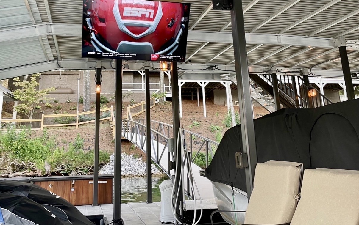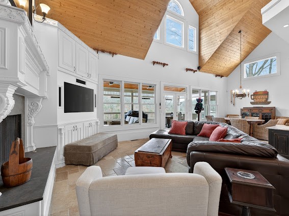 The two-level dock on full year water is a standout feature,equipped with two boat slips with lifts,two covered jet ski lifts,an additional jet ski space,a swimming deck,TV,canoe holder,storage boxes and a spacious upper-level lounge deck with jumping access.Just steps from the shoreline,a lakeside gazebo with a fireplace and TV creates the ultimate resort-style setting.