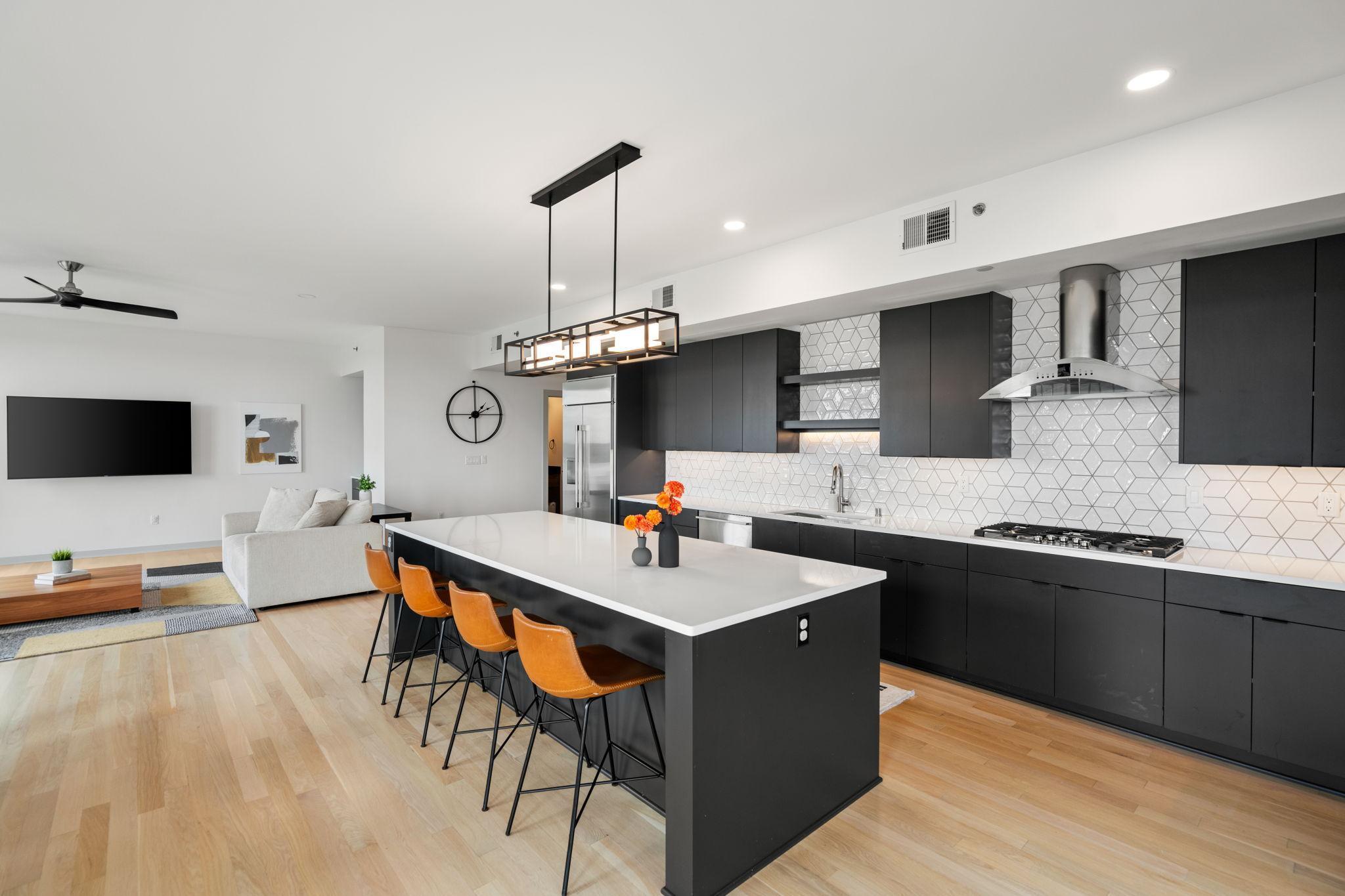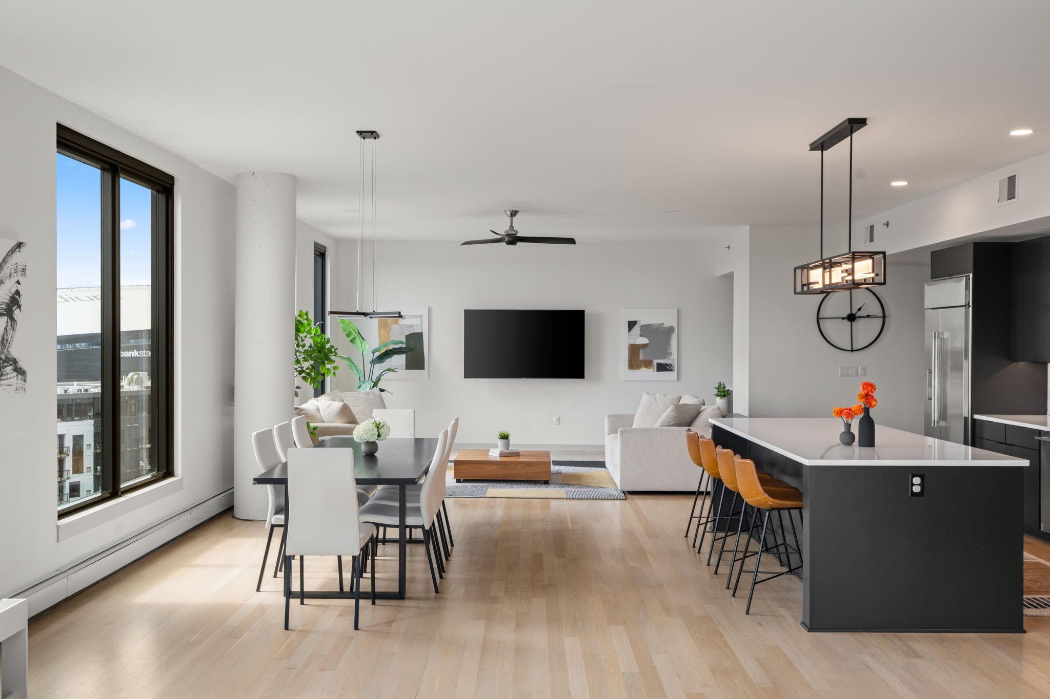 Experience urban living at its finest in this top floor residence at Legacy Lofts, where sophisticated design meets thoughtful upgrades throughout. This is an exceptional opportunity to own one of the most desirable homes in the building, offering unmatched value at this price point. With south and west exposures, this rare three bedroom, three bath corner home is filled with natural light and offers an open, airy feel throughout, highlighted by beautiful white oak flooring. Designed for both comfort and entertaining, it offers two spacious living areas and an open concept layout with floor to ceiling windows, a custom dry bar, and seamless flow between the kitchen, dining, and living spaces. The chef’s kitchen features an oversized quartz island, custom tile backsplash, GE Monogram appliances, upgraded cabinetry, and designer lighting. Bedrooms are thoughtfully separated for privacy, including an owner’s suite with dual walk in closets and a well appointed private bath with designer selections. Includes two premium, oversized parking spaces conveniently located near the elevator. Residents enjoy resort style amenities such as a rooftop deck with lawn bowling, outdoor pool, hot tub, sauna, fitness center, game room, golf simulator, and elegant community room. Additional conveniences include 24 hour staff, secure access, heated parking, storage, pet spa, and car wash. The building also offers conference rooms, rotating art exhibits, a library, and a gated playground.