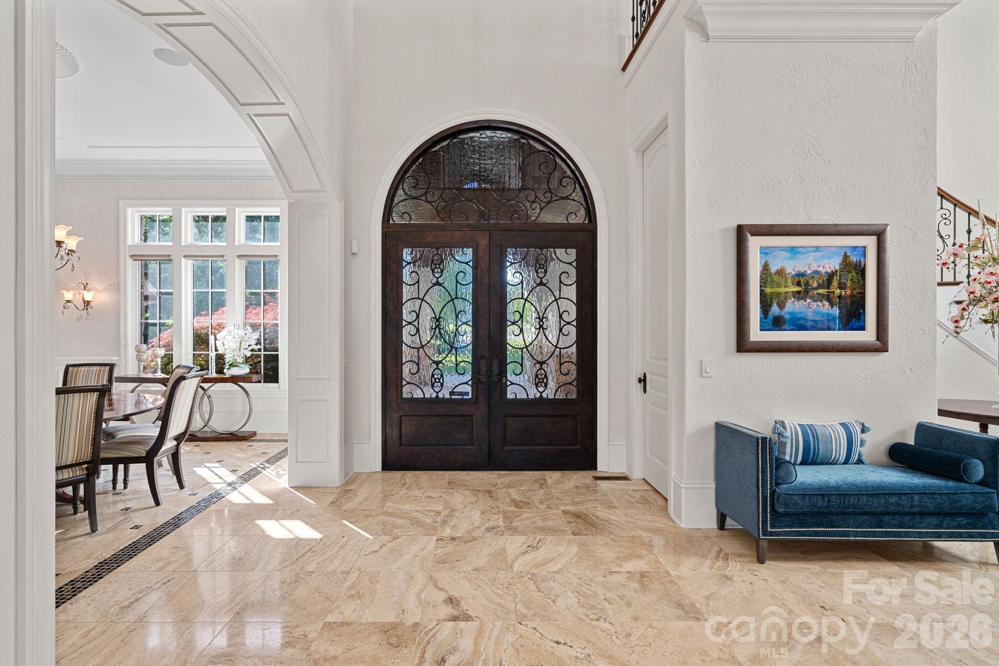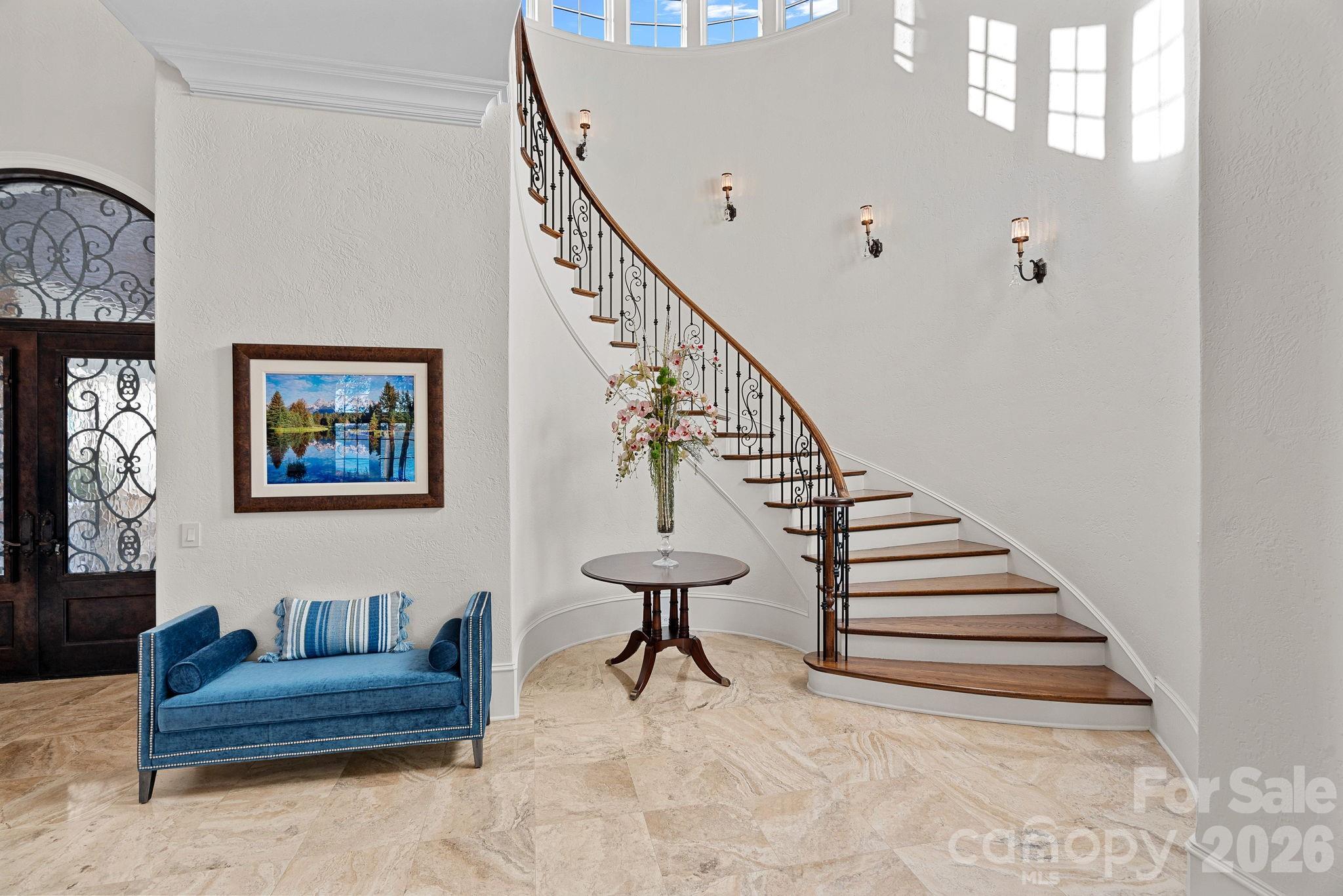 A dramatic arrival begins with a cobblestone motor court and four-car attached garage, leading to a grand entry with a soaring two-story foyer featuring walls of glass and a striking custom circular staircase of wrought iron and wood. The home’s exterior is a timeless blend of brick, stone, wood, and stucco.