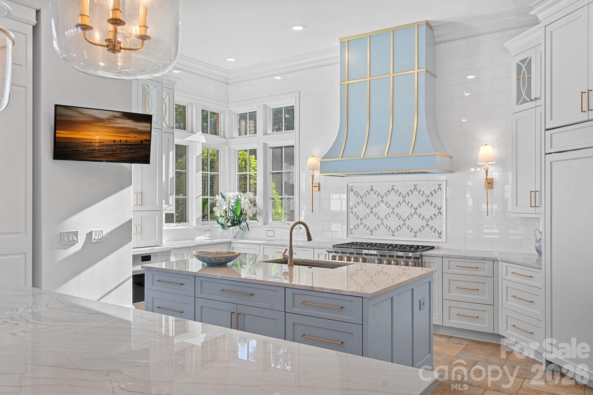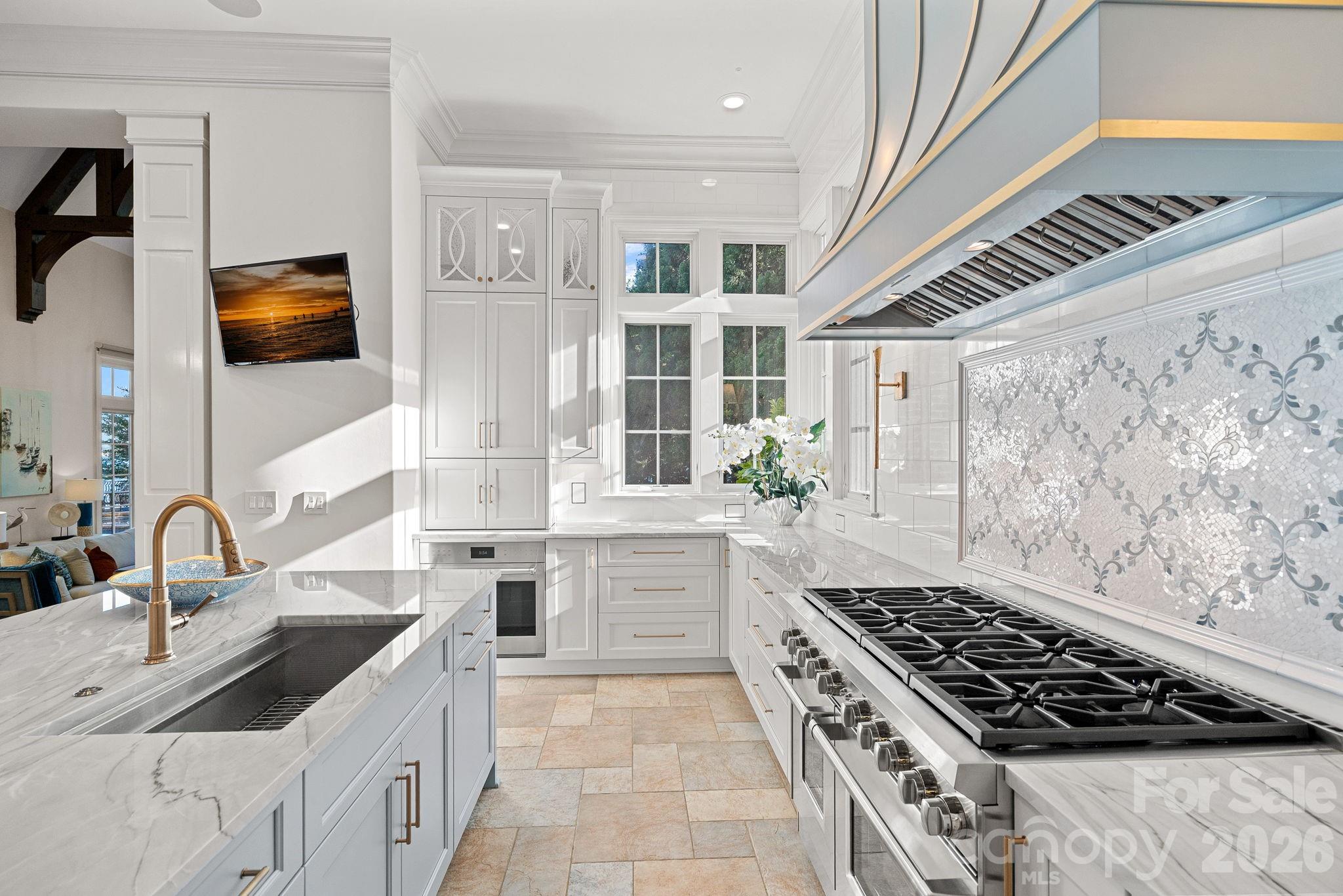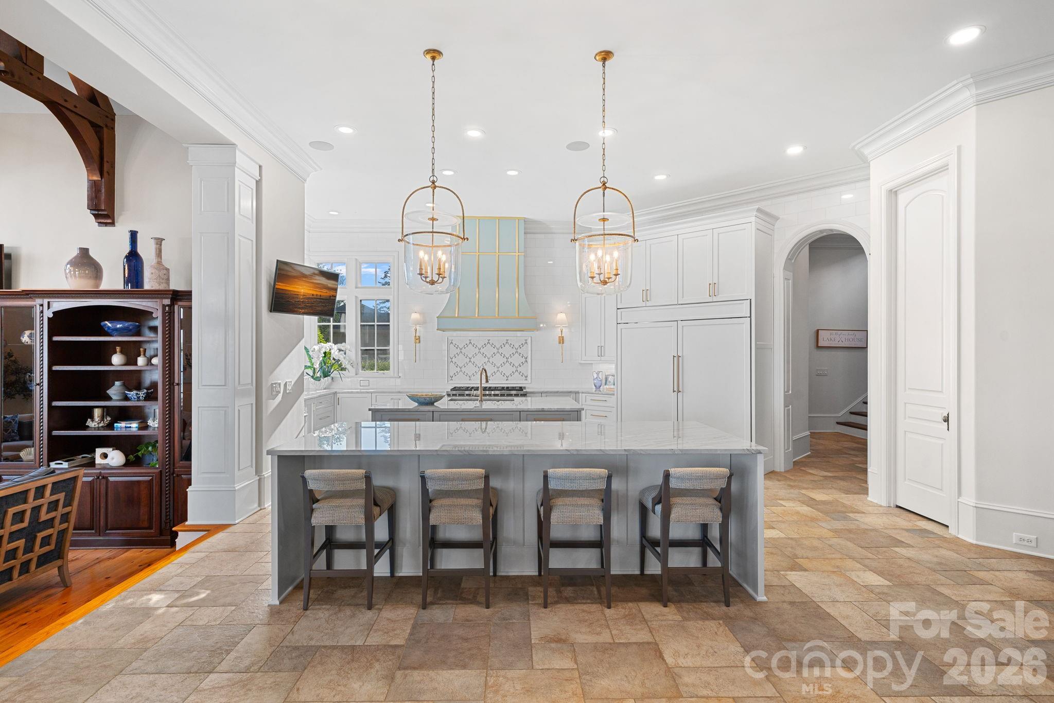 Designed for both everyday living and large-scale entertaining, the gourmet chef’s kitchen features custom cabinetry by Impact Fine Design, exotic quartzite countertops, heated floors, two Bosch dishwashers, Miele coffee maker, and professional-grade appliances including Wolf and Sub-Zero refrigeration with multiple beverage drawers. Designer lighting curated from Visual Comfort completes the space.