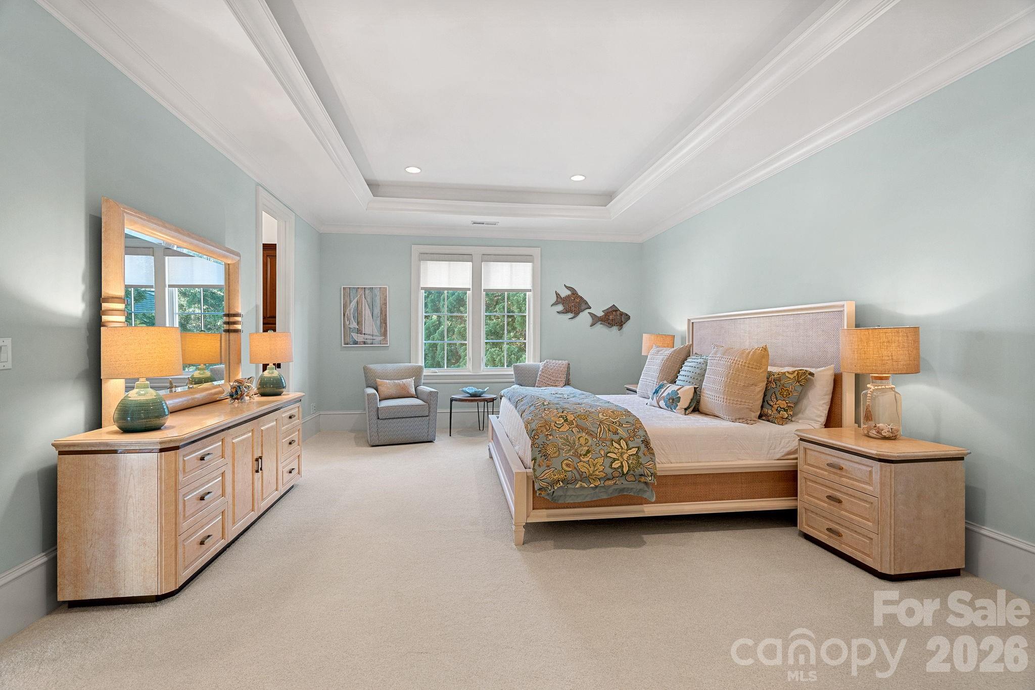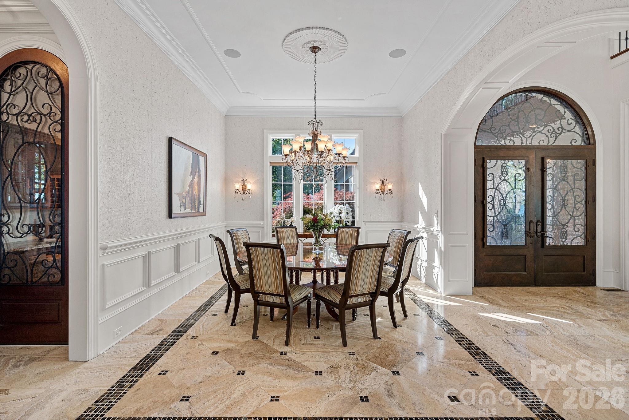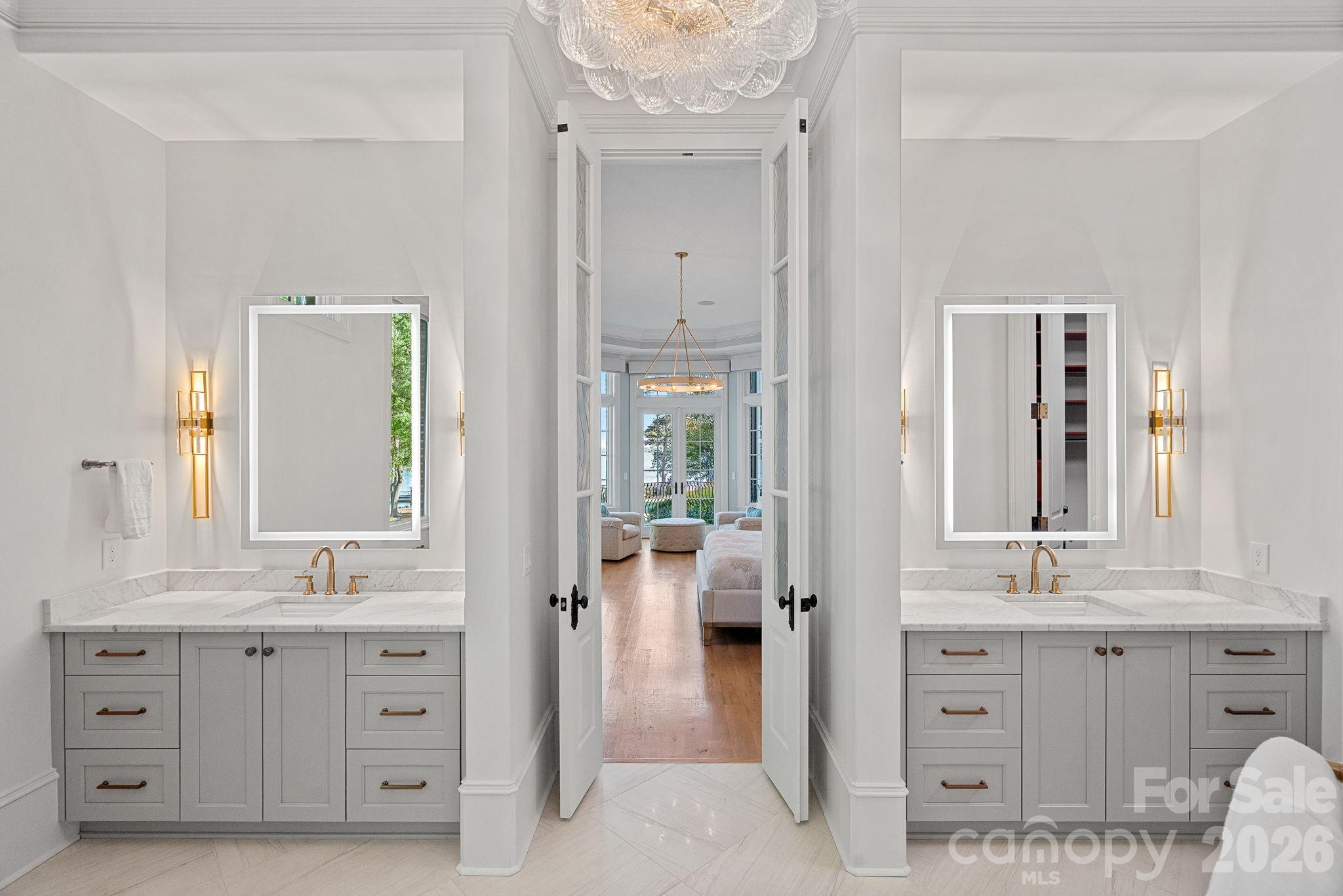 Designed for both everyday living and large-scale entertaining, the gourmet chef’s kitchen features custom cabinetry by Impact Fine Design, exotic quartzite countertops, heated floors, two Bosch dishwashers, Miele coffee maker, and professional-grade appliances including Wolf and Sub-Zero refrigeration with multiple beverage drawers. Designer lighting curated from Visual Comfort completes the space.