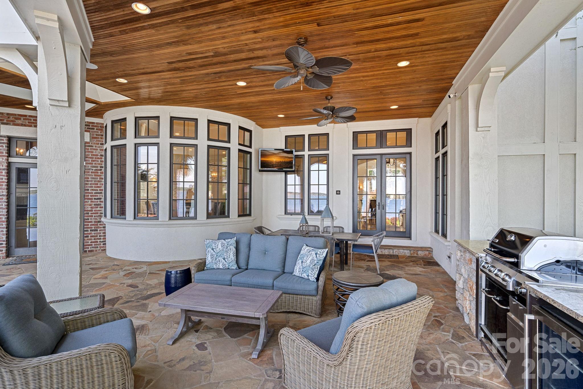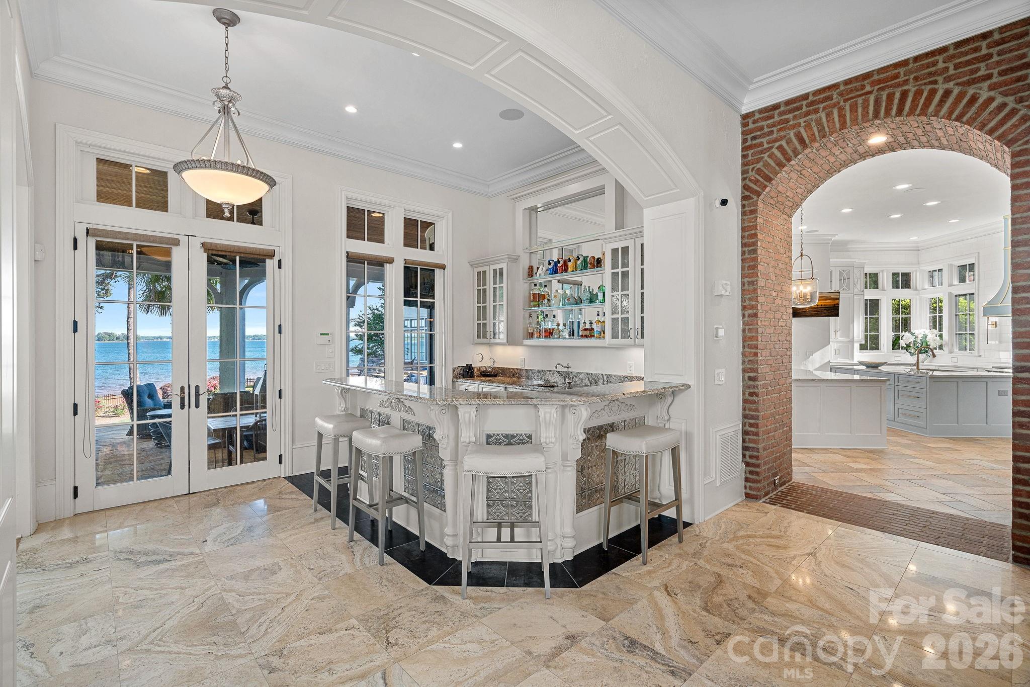 Entertaining spaces include a breathtaking two-story living room with custom bar opening to a covered waterfront patio, expansive great room with custom wood detailing, formal dining with butler’s pantry, temperature-controlled wine cellar (400–500 bottle capacity), and a second-level entertainment area with full bar and private lakefront terrace.