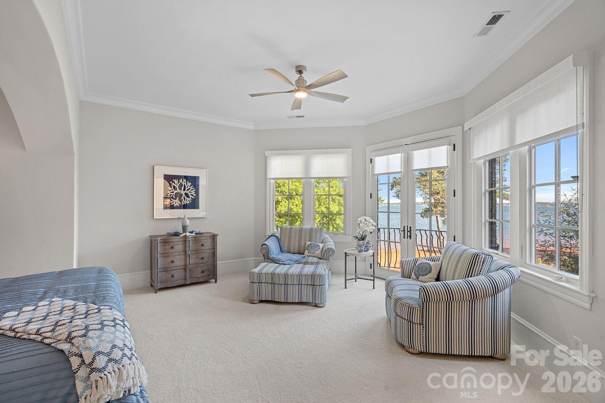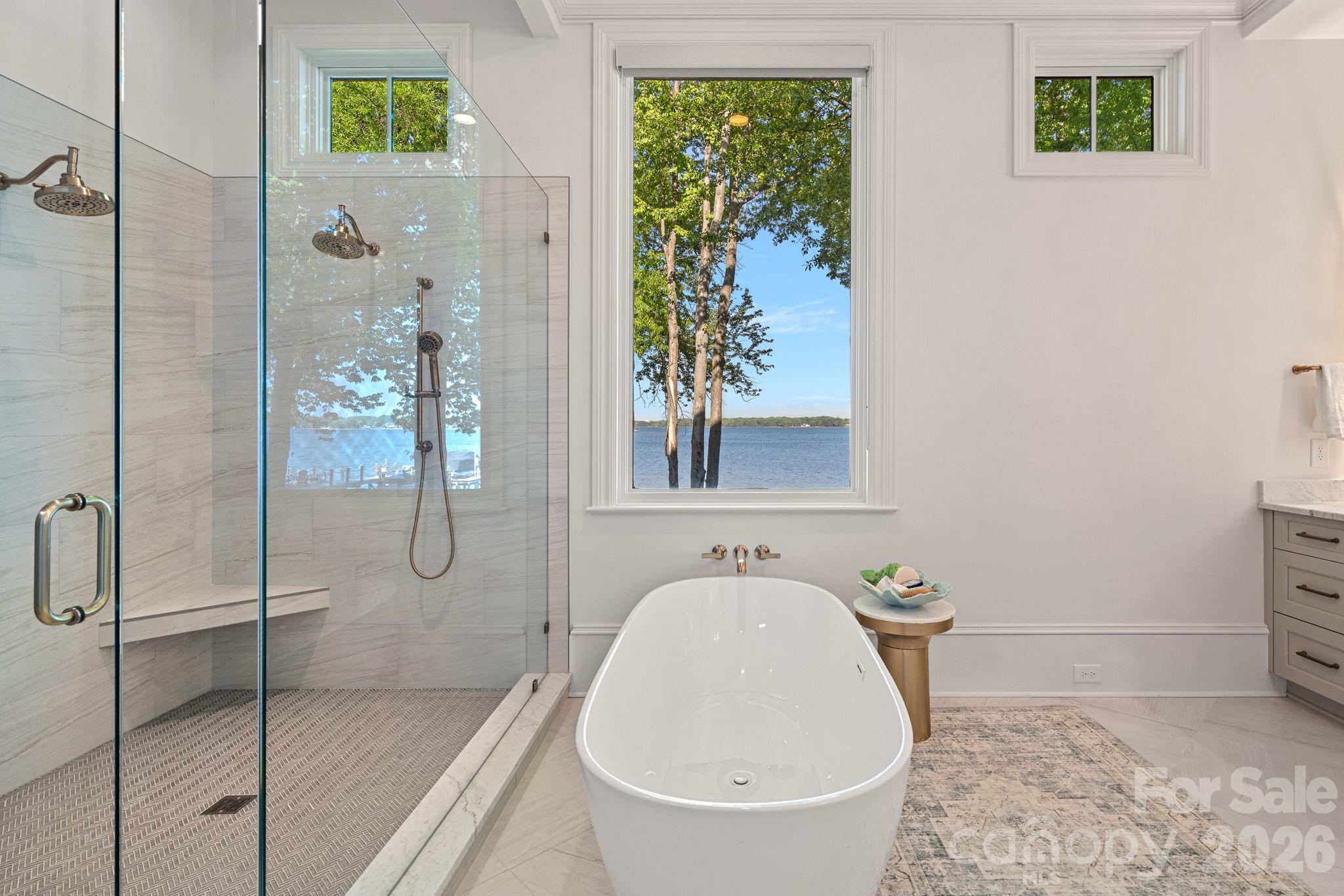 The primary suite is a private lakeside sanctuary featuring a stone-surround fireplace, power blackout shades, cedar-lined walk-in closets, a private laundry room, and direct access to a waterfront patio. The spa-inspired bath includes radiant heated floors, freestanding soaking tub, luxe gold fixtures, marble vanities, Toto washlet, and designer lighting.