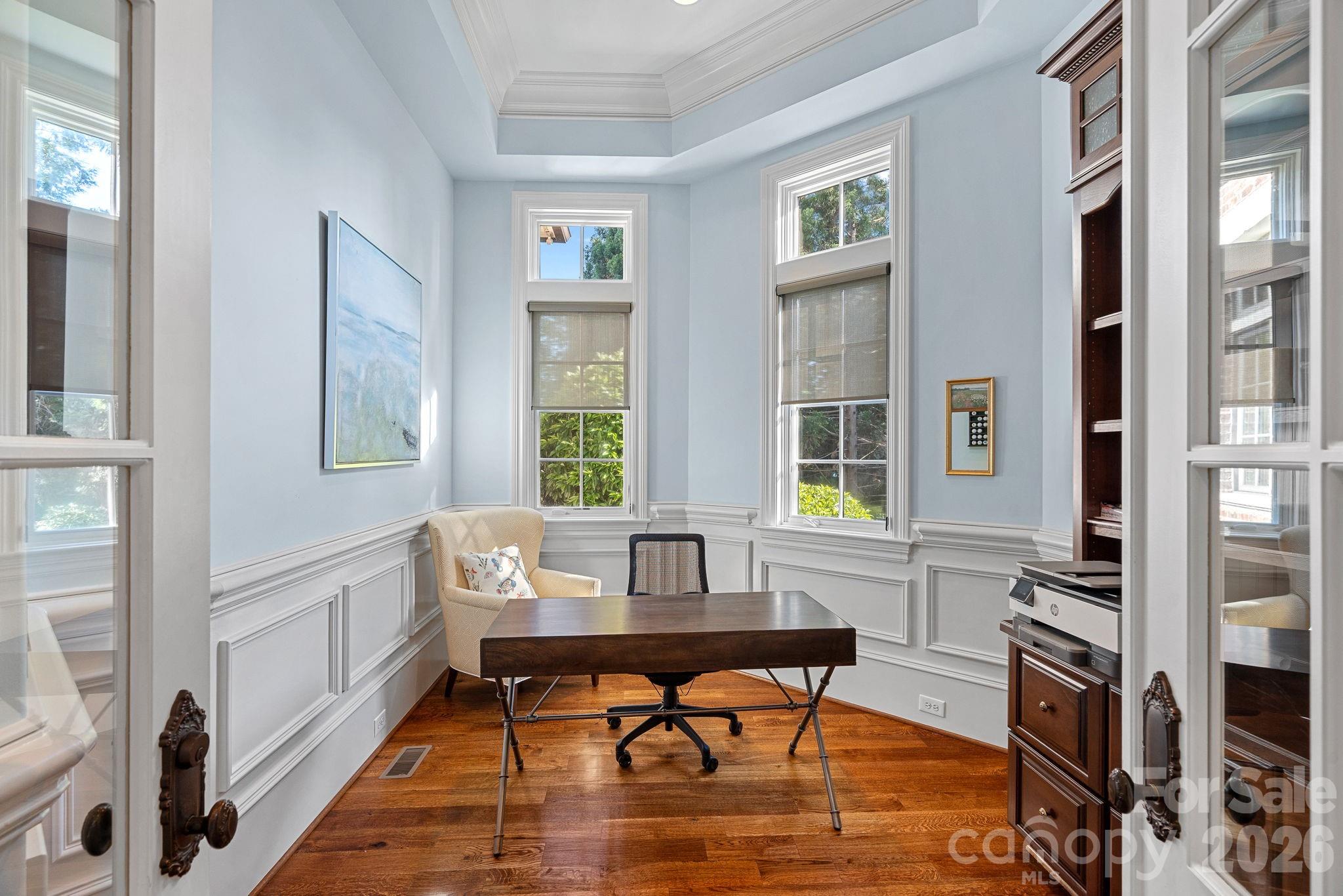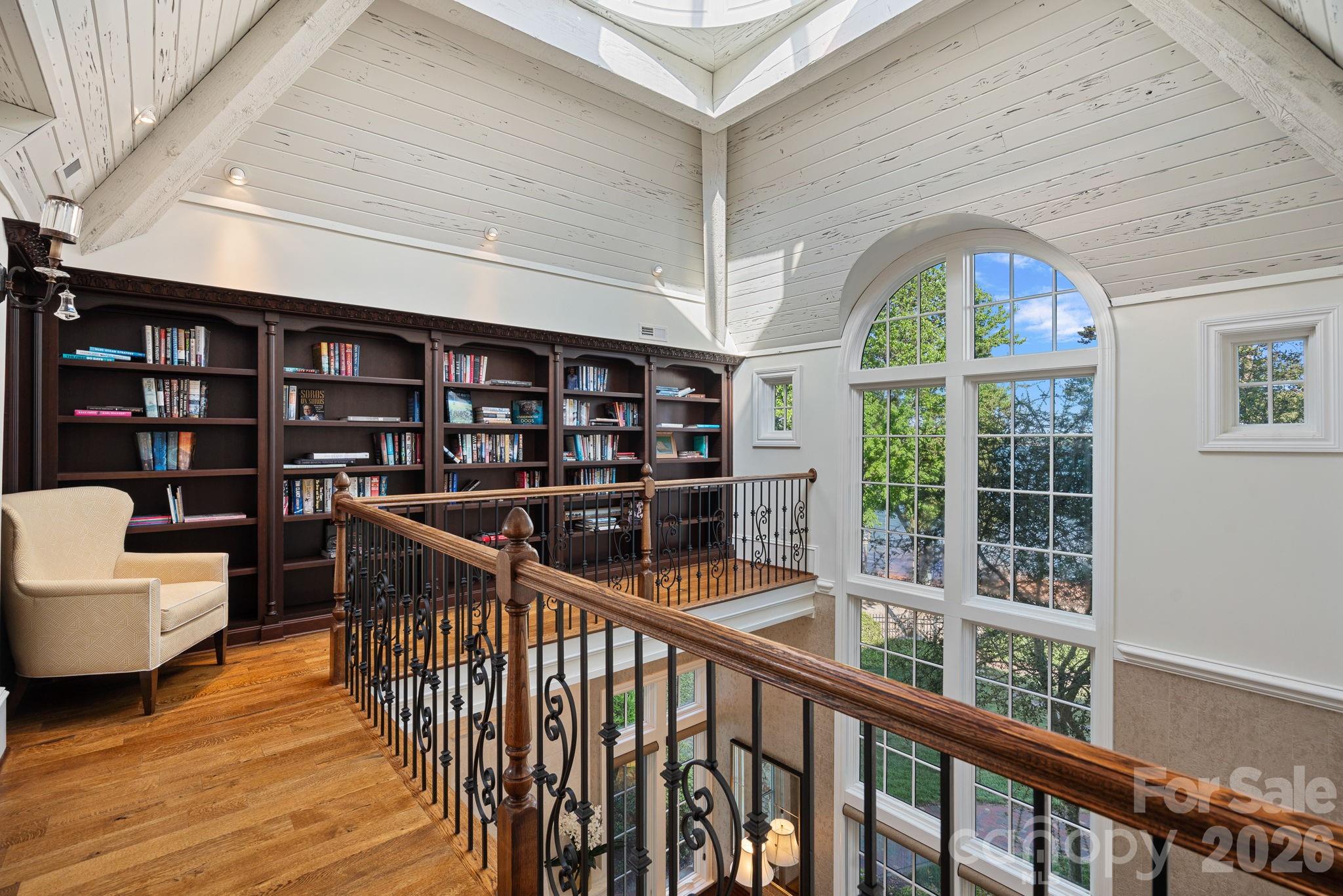 Guest accommodations include four upper-level ensuite bedrooms, a richly detailed loft/library, and a separate approximately 675 sq ft waterfront guest house with full bath and steam shower. A private executive study on the third floor offers panoramic lake views through a curved wall of windows.