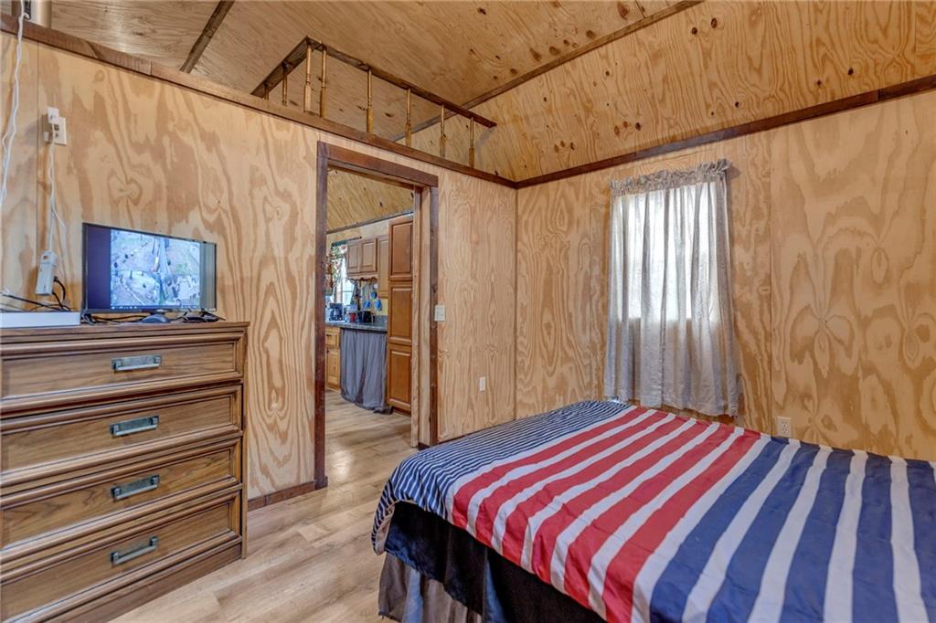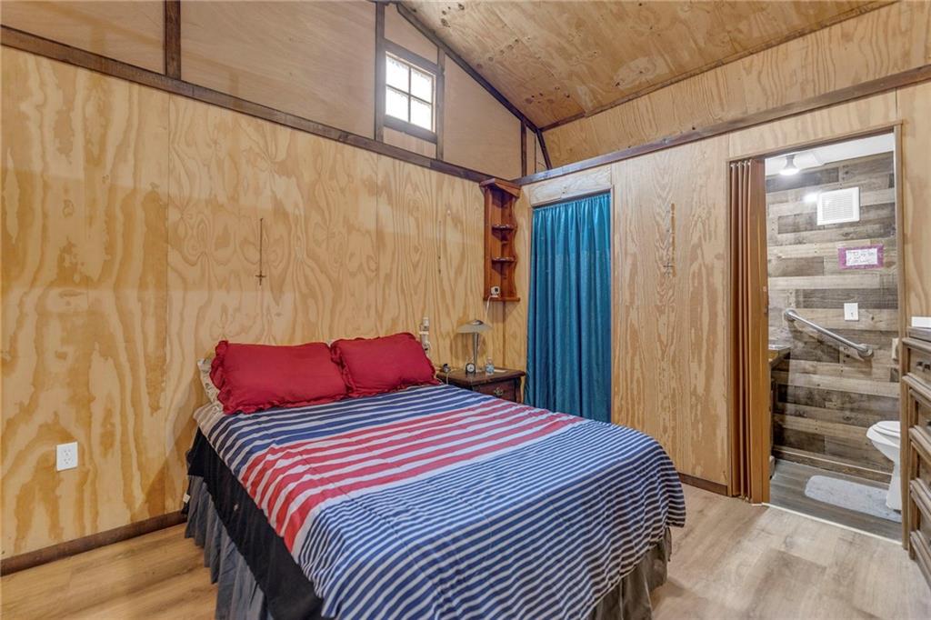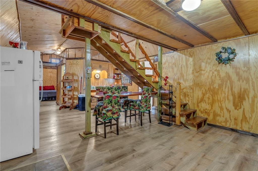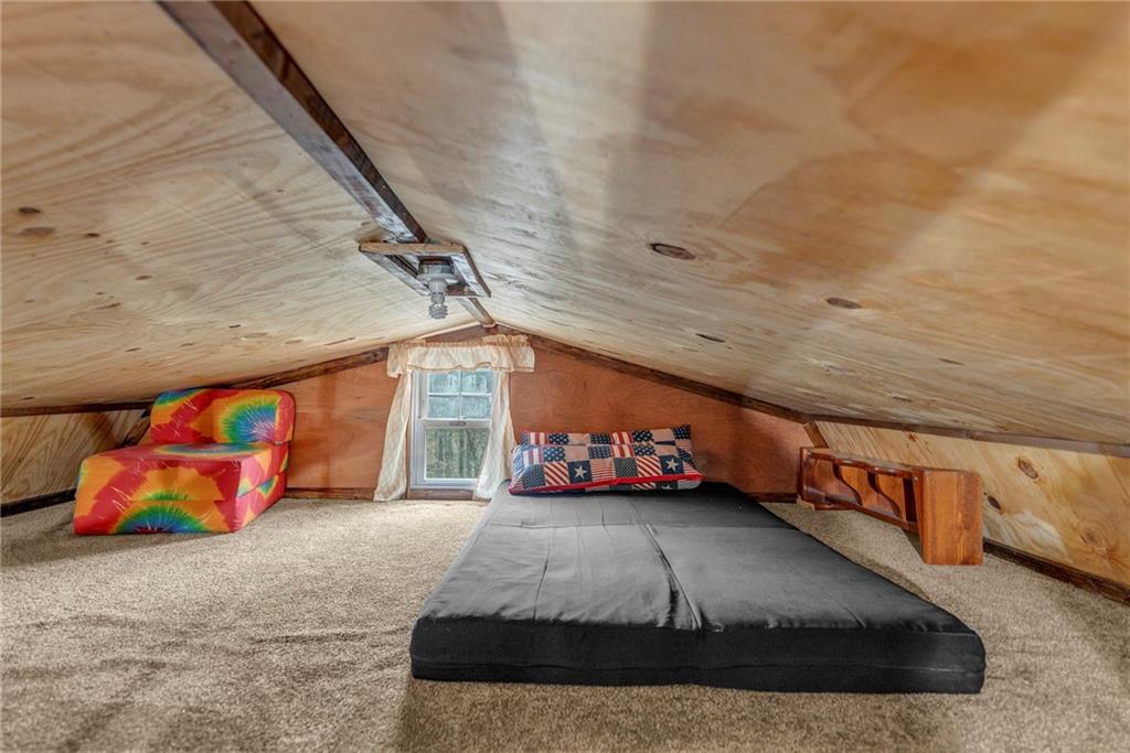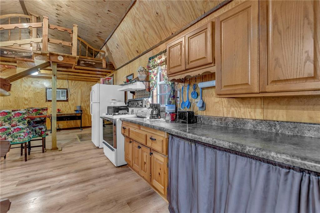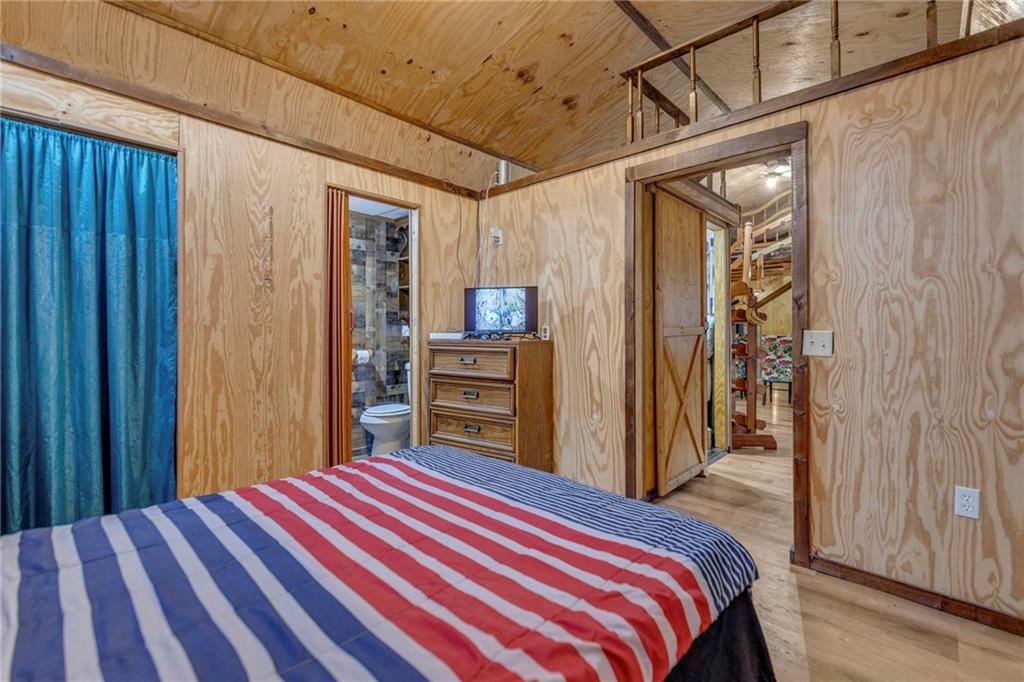 The cabin features 1 spacious master bedroom with walk-in closet and half bath, a full bathroom with shower, and a large 10x15 sleeping loft—ideal for kids, grandkids, or extra guests. The open-concept kitchen and living area is designed for both relaxation and entertaining, complete with a folding dining table for flexible space. Modern amenities include a full kitchen (all electric), washing machine, a heat pump/AC system, and even an antique wood stove for cozy evenings.
