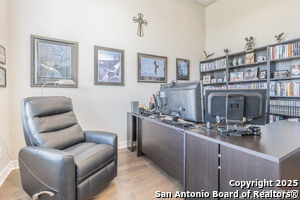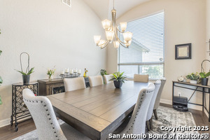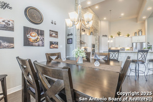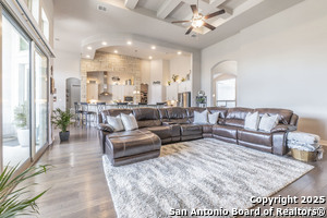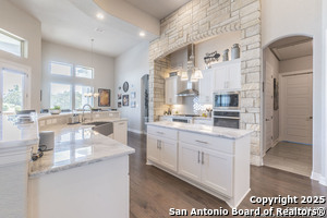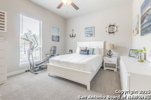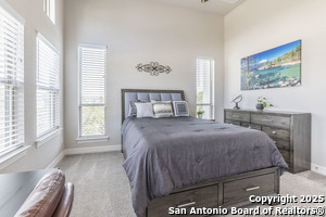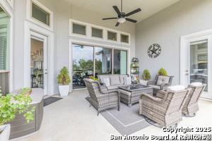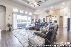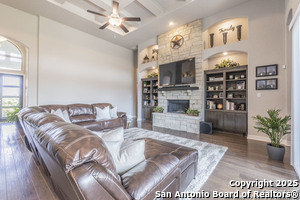 This home feels like a house on the hill as it is situated upward and away from the street with unique privacy from immediate neighbors and a beautiful sunset view from the front porch. No homes are directly visible from the back porch area as the neighbor's house to the East is located on 2 acres with foliage in between, and the rear of the neighbor's house to the West sits mostly in front of the front of this home with cedars in between. There is great lighting in the front of and around the house with flood lights on each corner to light up the whole yard. Inside this home, there is lots of natural light with many large windows, triple sliding doors to the patio, and an open floor plan perfect for entertaining or enjoying a cozy night at home. Some interior highlights include a gourmet dream kitchen with a gas cooktop, farmhouse sink, upgraded appliances, 13 foot stone wall wrapped around the cooking area, an interior island, and a large quarter circle counter area with a stone facade that encloses the kitchen that can support up to 8 barstool chairs. Additionally, rich brown hardwood flooring is continuous throughout the great room, kitchen, breakfast area, dining area, den or office, and a 13-foot tall stone fireplace is shown opposite from the kitchen with custom bookshelves on each side, and much more. All bedrooms have gray low-shag carpets. Interior wall colors are Agreeable Gray with white baseboards throughout the house with gray tile in the appropriate walking areas. In the back of the house, there is a large high-ceiling covered patio with an extended porch and railings with a built-in fan, a garden seating area under a cluster of oaks, and lots of opportunity to further build out the large backyard. The Vintage Oaks is a master planned community that offers resort-style amenities such as 3 swimming pools and spas, including an Olympic size pool, a lazy river, jogging and walking trails, a fitness center with saunas, tennis courts, concerts in the park at Timber Ridge Park and much more.