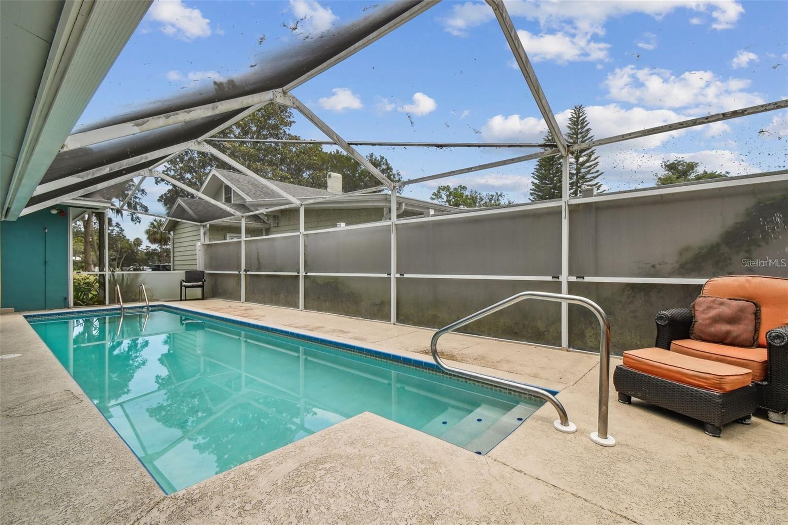 Historic waterfront pool home with dock and legal guest house in downtown New Port Richey. Set on Grand Boulevard on one of the largest lots in the district, this 4 bedroom, 3 bath estate has never flooded and offers direct Cotee River access with a private dock, boat lift, and deep-water connection. A rare Sears Roebuck “Osborn” model, the residence showcases original hardwoods, wide baseboards, vintage glass windows, and a show-stopping stone fireplace. The main home features a spacious dining room, sun-filled enclosed porch overlooking the river, and an updated kitchen with granite counters and modern appliances. The primary suite opens to the pool and includes an ensuite bath and interior laundry; secondary bedrooms offer tall ceilings and abundant natural light. Outdoors is a true Florida oasis with lush landscaping, screened pool, private courtyard, and majestic oaks for shade and privacy. The permitted detached in-law suite/guest house/ADU provides a full kitchen, living room, bedroom, and bath—ideal for multigenerational living, guests, or rental income. A newer oversized 2-car garage with workshop and storage loft, gated driveway, and ample off-street parking complete the property. Enjoy walkable access to downtown shops and restaurants, golf-cart-friendly streets, and a front-row seat to historic New Port Richey living—an exceptional riverfront opportunity with character, functionality, and location. (ROOF-2012)(A/C-2013)(W/H-2013)(IMPACT FRONT DOOR-2025)