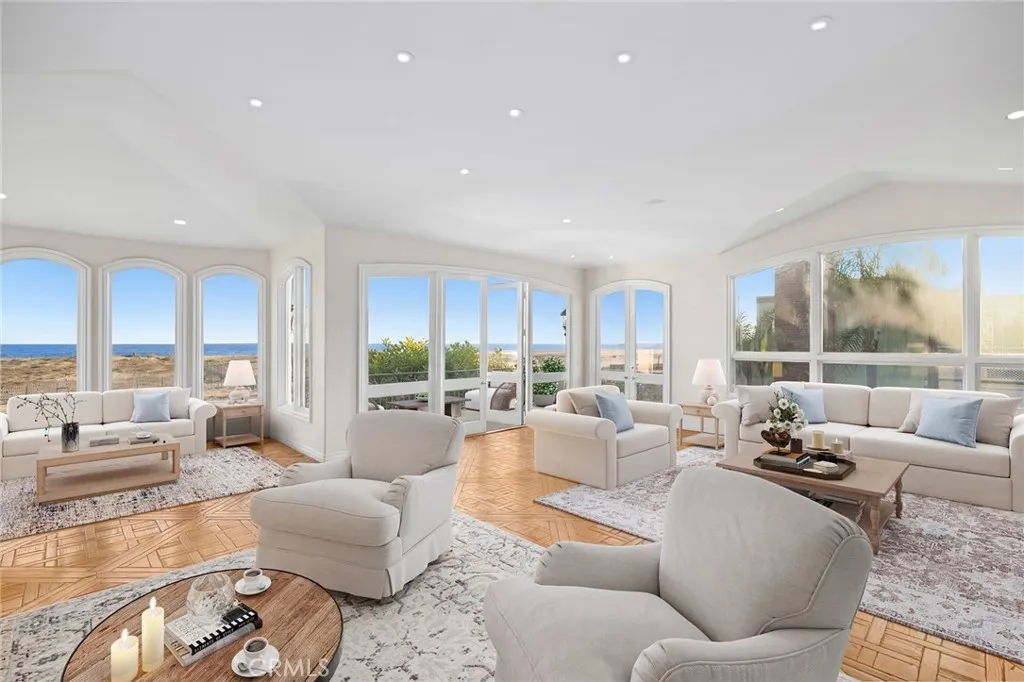 A truly exceptional opportunity to own a front-row oceanfront residence directly on the sand along one of Newport Beachs most iconic stretches of coastline. Set on a rare, oversized corner lot with 41 feet of coveted beach frontage, this Brion Jeannettedesigned home offers sweeping, unobstructed views of the Pacific Ocean, the bay, and the coastline beyond - an irreplaceable setting where the sand and sea become an extension of the home itself. Designed to embrace the ultimate beach lifestyle, the residence opens seamlessly to an oceanfront patio where mornings begin with coffee and crashing waves and evenings unfold with sunset skies and the sound of the surf. This extraordinary indoor-outdoor connection creates a true beachfront living experience - step outside and your backyard is the beach. The thoughtfully designed floor plan offers exceptional flexibility, featuring a main-level primary suite with direct ocean views, two additional guest bedrooms on the main level, and a fourth bedroom on the upper level. An elevator services all three interior levels, including a dramatic rooftop deck showcasing panoramic, unobstructed views in every direction - a breathtaking vantage point for entertaining or quiet reflection. A lower-level wine cellar adds a refined touch to the homes coastal elegance. Upon arrival, a graceful curved staircase leads to a light-filled, open-concept living space where expansive windows frame endless water views. Anchored by a striking stone fireplace, this elevated living area is designed to capture the beauty of the coastline from nearly every angle