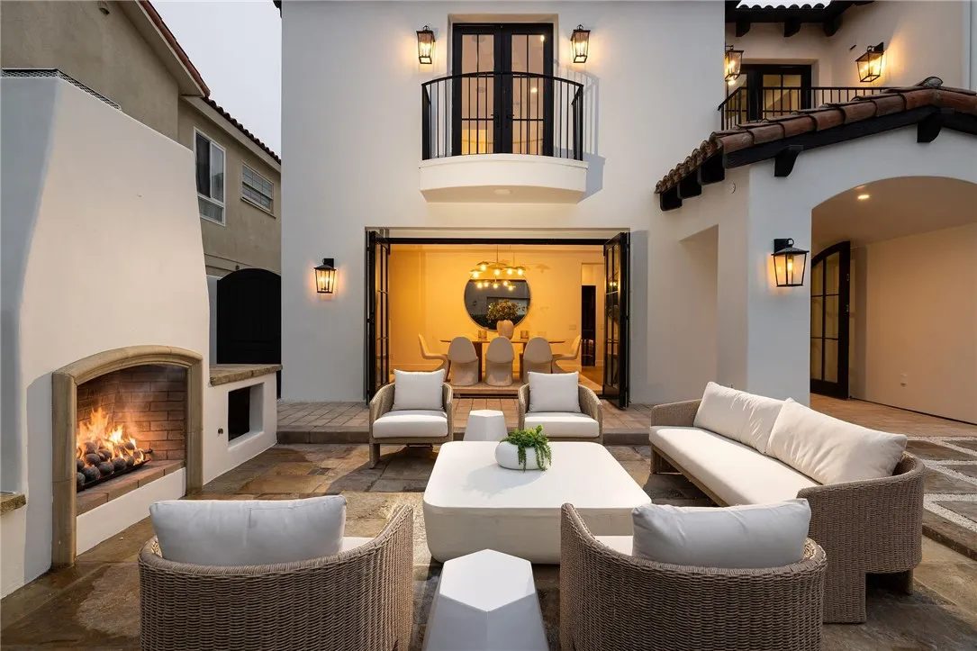Located on the exclusive enclave of Lido Isle, this newly and completely renovated residence blends timeless traditional architecture with refined California coastal elegance. Sited on a highly sought-after oversized 58-foot-wide lot, the home offers six bedrooms, including a main-level en-suite, plus a dedicated office. Upon entry, a dramatic two-story foyer, seldom found on Lido Isle, sets the tone for the homes thoughtful scale and architectural presence. The floorplan is ideally suited for both everyday living and sophisticated entertaining, anchored by a light-filled great room that flows seamlessly into the heart of the home. The gourmet kitchen is a chefs showpiece, appointed with a Wolf 6-burner range with grill, 36" Sub-Zero separate refrigerator and freezer, Miele coffee bar, dual dishwashers, and custom finishes throughout. The kitchen opens seamlessly to the family room and outdoors through a dual bi-fold door system, creating an effortless indoor-outdoor living experience. The formal dining room features its own fireplace and additional bi-fold doors, complemented by a wet bar and an impressive 850-bottle, climate-controlled wine cellar, ideal for entertaining. Upstairs, the primary suite is a private retreat with beamed ceilings, a sitting room with Juliet balcony, and a spa-inspired bath with freestanding tub and walk-in shower. Four additional bedrooms complete the second level, two en-suite with custom built-ins and two sharing a Jack-and-Jill bath with dual vanities and a walk-in shower. Outdoor living offers multiple seating areas, a built-in stone firepl