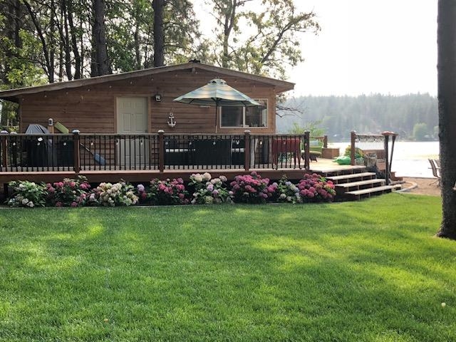 This amazing waterfront property is surrounded by million dollar homes and is truly a rare find. Soft sand and lush green grass lead you to the breath taking beach, seconds from your cozy cabin. Roasting marshmallows around your fire pit and enjoying the soothing sounds of summer will be a perfect end to a long day playing in the water and boating. A delightfully cozy one bedroom, one bath cabin was built in 2000. This stunning frontage includes a private dock, all on beautiful Lake Spokane. The sellers have rented it out during the summer and it commands $400.00 a night and is booked all summer. Or possibly, if you have interest in expanding the current cabin into something larger, the current owners are in the preliminary stages of obtaining approval to build a 4,000 square foot home. This is a rare opportunity to purchase such a level and extremely accessible lakefront property. The perfect dream lot to build your dream lake home.