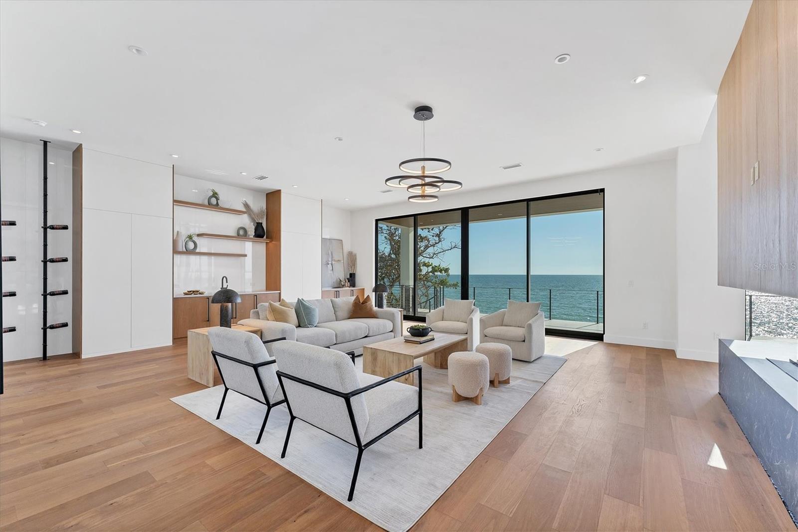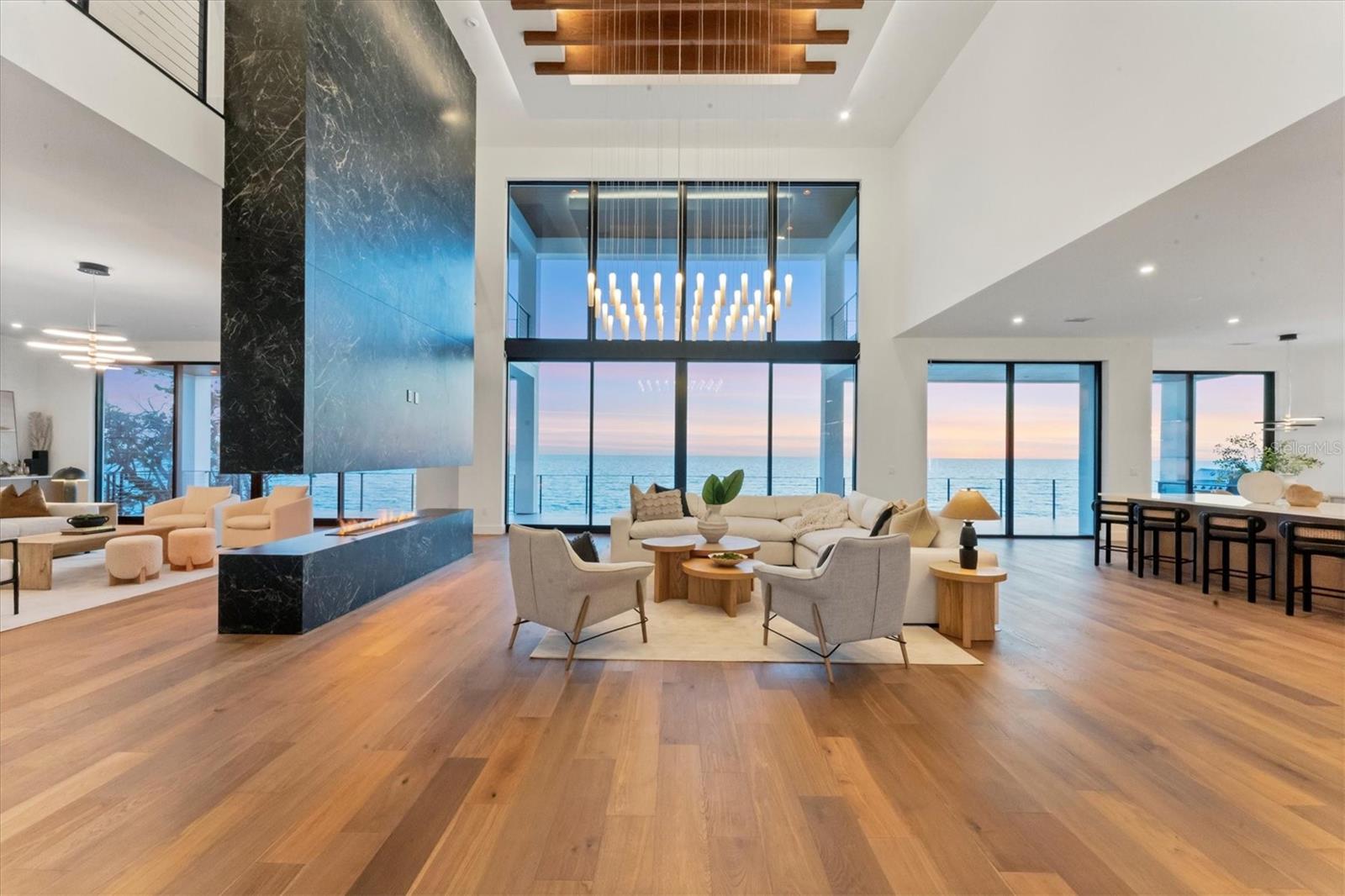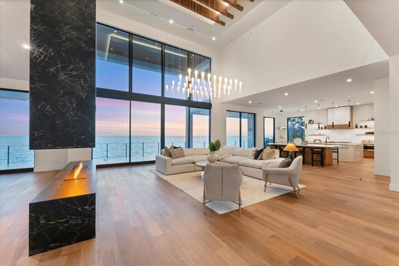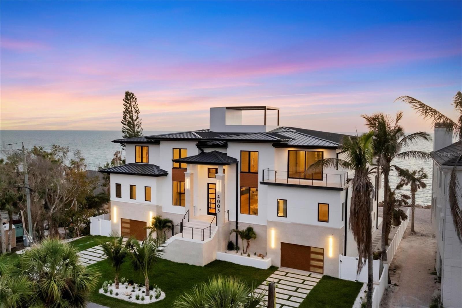 WELCOME TO ONE OF THE FEW BRAND-NEW GULF FRONT HOMES FOR SALE ON THE WEST CENTRAL COAST OF FLORIDA. A rare opportunity, where cutting-edge design meets wide Gulf vistas. Nestled on the prestigious barrier island of Casey Key, this newly constructed Modern Coastal estate by Modesta Homes exemplifies modern beachfront living. Positioned directly on the sand with sweeping Gulf views, this striking residence offers elevated living space, showcasing the pinnacle of craftsmanship and architectural innovation. Built with block construction, pilings, impact-rated windows and doors, and a four-stop elevator, every detail of this home has been thoughtfully curated for style, function, and resilience. Inside, soaring 24-foot ceilings welcome you into the grand foyer and great room, anchored by a dramatic floating staircase and a 24-foot feature fireplace wall. With en-suite bedrooms, state-of-the-art home theater, lounge, bar, and a wine wall, this home offers both grand entertaining and serene retreat. The chef’s kitchen is a design showpiece, featuring European cabinetry, dual waterfall-edge islands clad in book-matched 3cm quartz, and premium Sub-Zero & Wolf appliances. Dual laundry rooms, breakfast nook, and custom built-in vanities provide elevated everyday living. The primary suite is a personal sanctuary, complete with a spa-like bathroom featuring a 71-inch freestanding tub, dual rainfall showers, a makeup vanity, and a large walk-in closet. Every bathroom throughout the home is appointed with bespoke cabinetry, quartz surfaces, and backlit mirrors. Designed to impress from every angle, the home is finished with smooth stucco, level 5 drywall, hardwood floors, imported tile, and integrated LED tray ceilings. A sleek rooftop terrace crowns the home, offering panoramic views of the Gulf and beyond. Step outside to your personal resort: an expansive terrace with an oceanfront pool, floating spa, sun decks, outdoor fireplace, and fully equipped kitchen. Lush, tropical landscaping, Zoysia grass, and a concrete drive with turf inlays complete the impeccable exterior design. Sleek metal railings accentuate balconies and the rooftop for a modern edge. Set on a half-acre of prime waterfront. This is coastal modern luxury at its pinnacle—a rare opportunity to own a brand-new, Gulf-front estate on one of Sarasota’s most desirable stretches of sand.