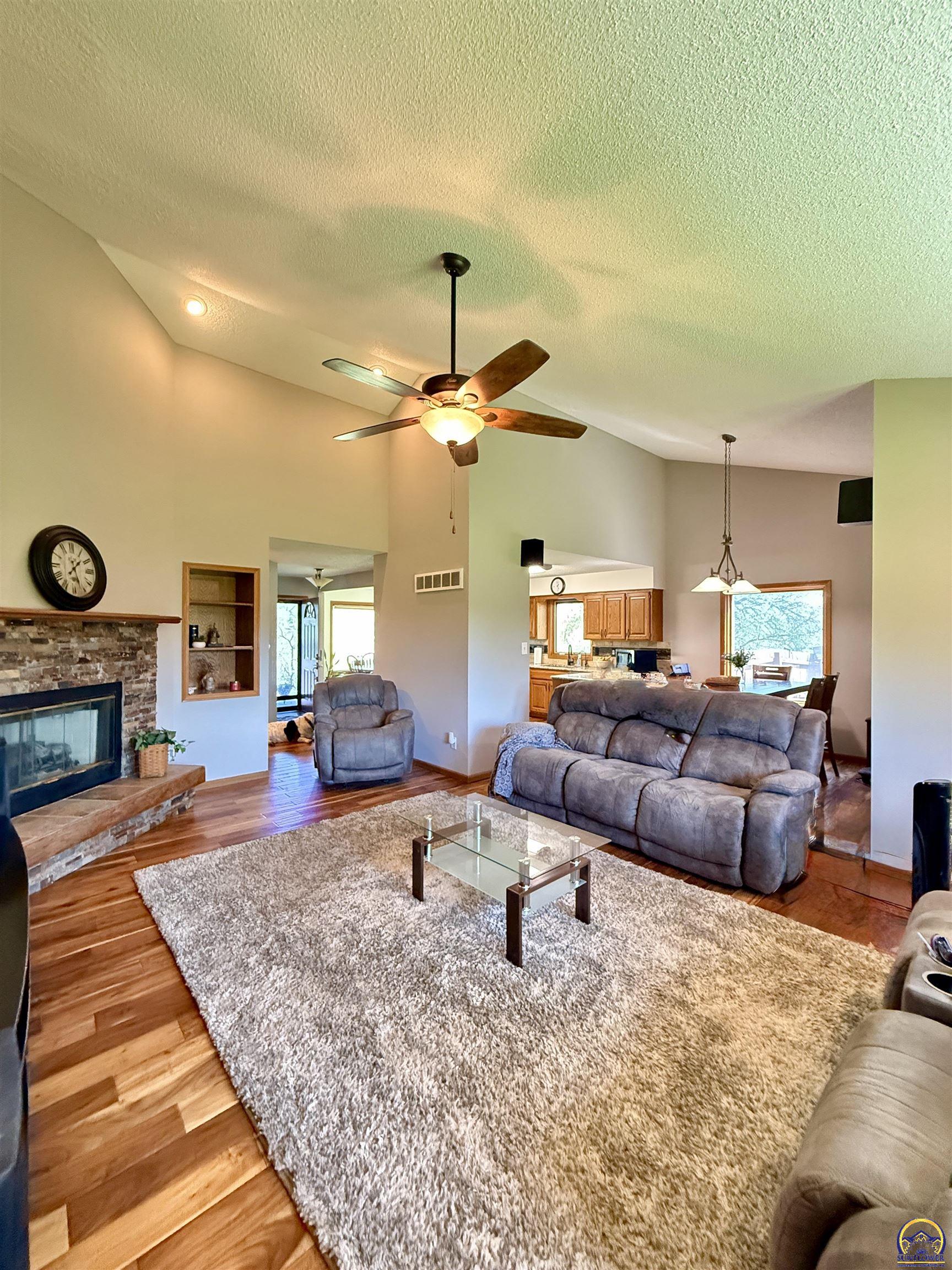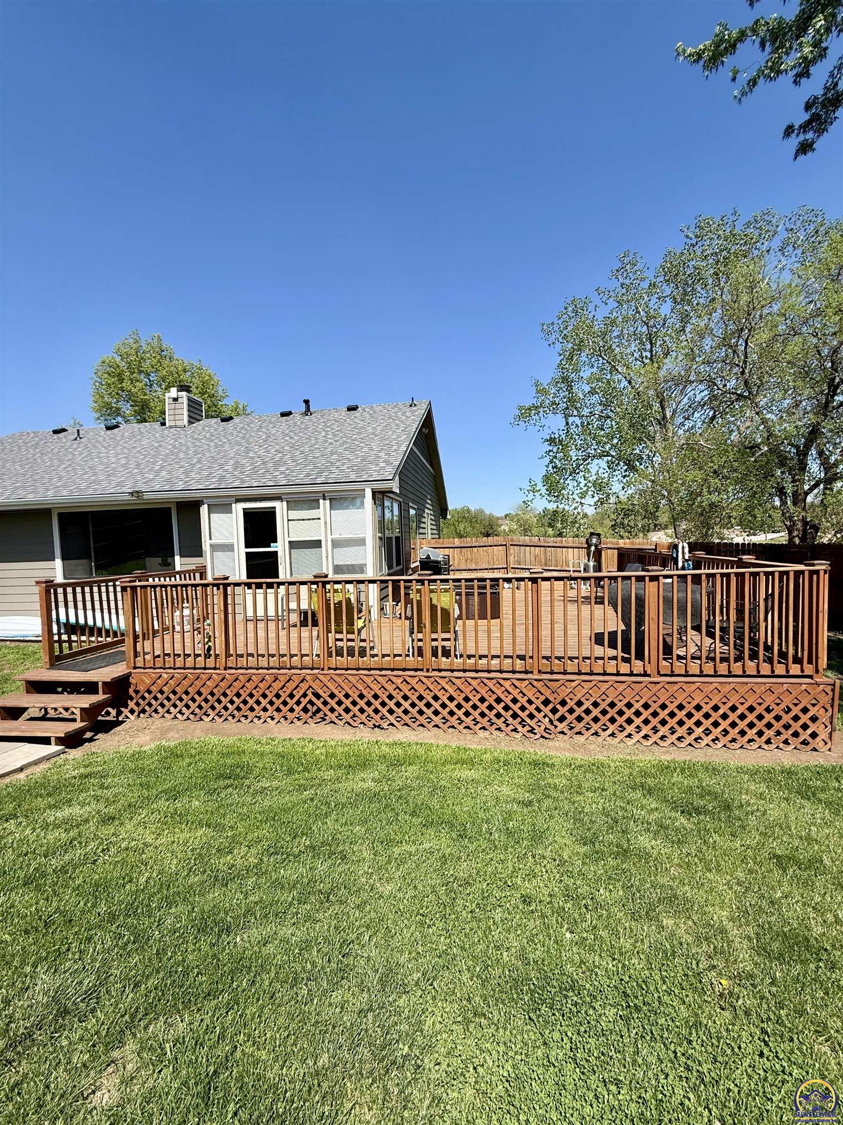 Stunning lake perrry-community home situated across from the golf course on 1.09-acres (4 lots). Features include a beautiful open kitchen with abundant cabinetry, granite countertops, and two dining areas, gas fireplace, separate specious utility room, beautiful tile and wood floors. Recent updates include new roof and windows! Additional highlights are a sunroom that opens to a large deck with hot tub. Enjoy a short golf cart ride to the community pool and/or restaurant. Basement offers a finished bonus room with walk in closet and 1,440 sq. ft. of additional living space ready to finish (some sheetrock and electrical already completed). Home warranty included — a must-see property in a vibrant, activity-rich area. Call for more details!